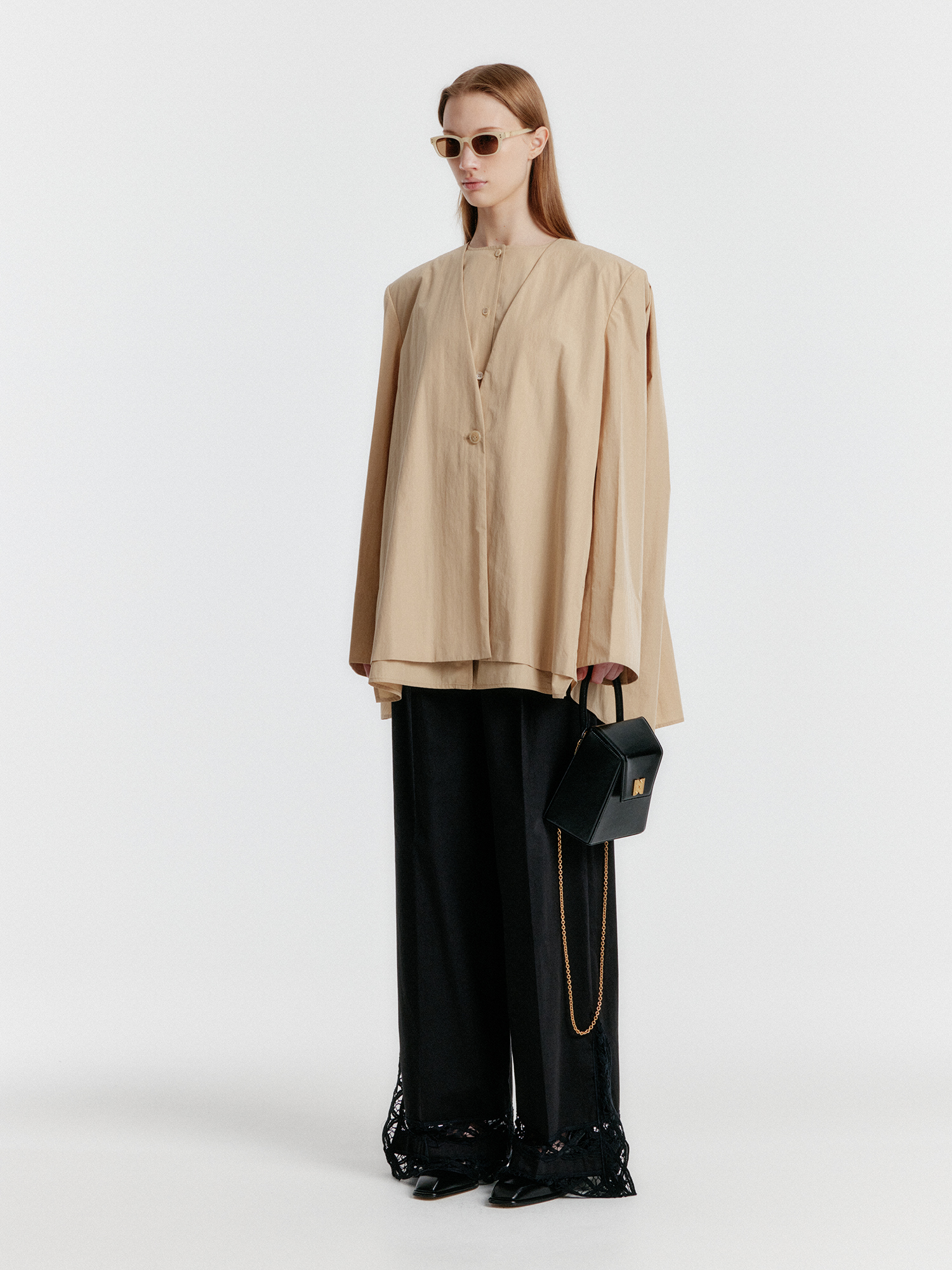 - 케이프 형태로 착용하게 되면 셔링으로 인해 가려졌던 슬릿이 드러납니다.