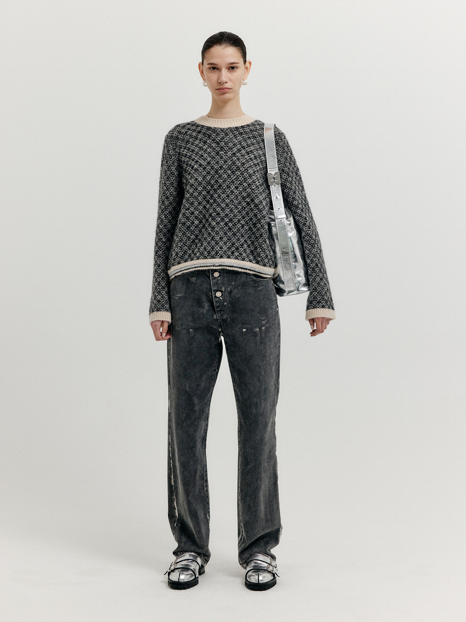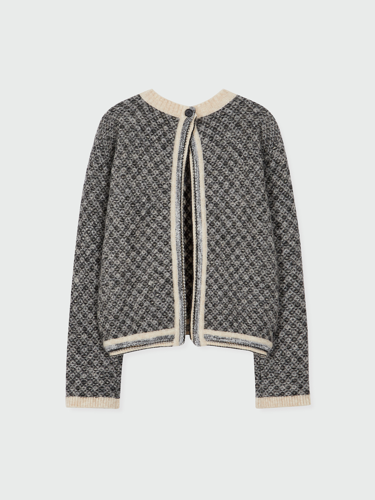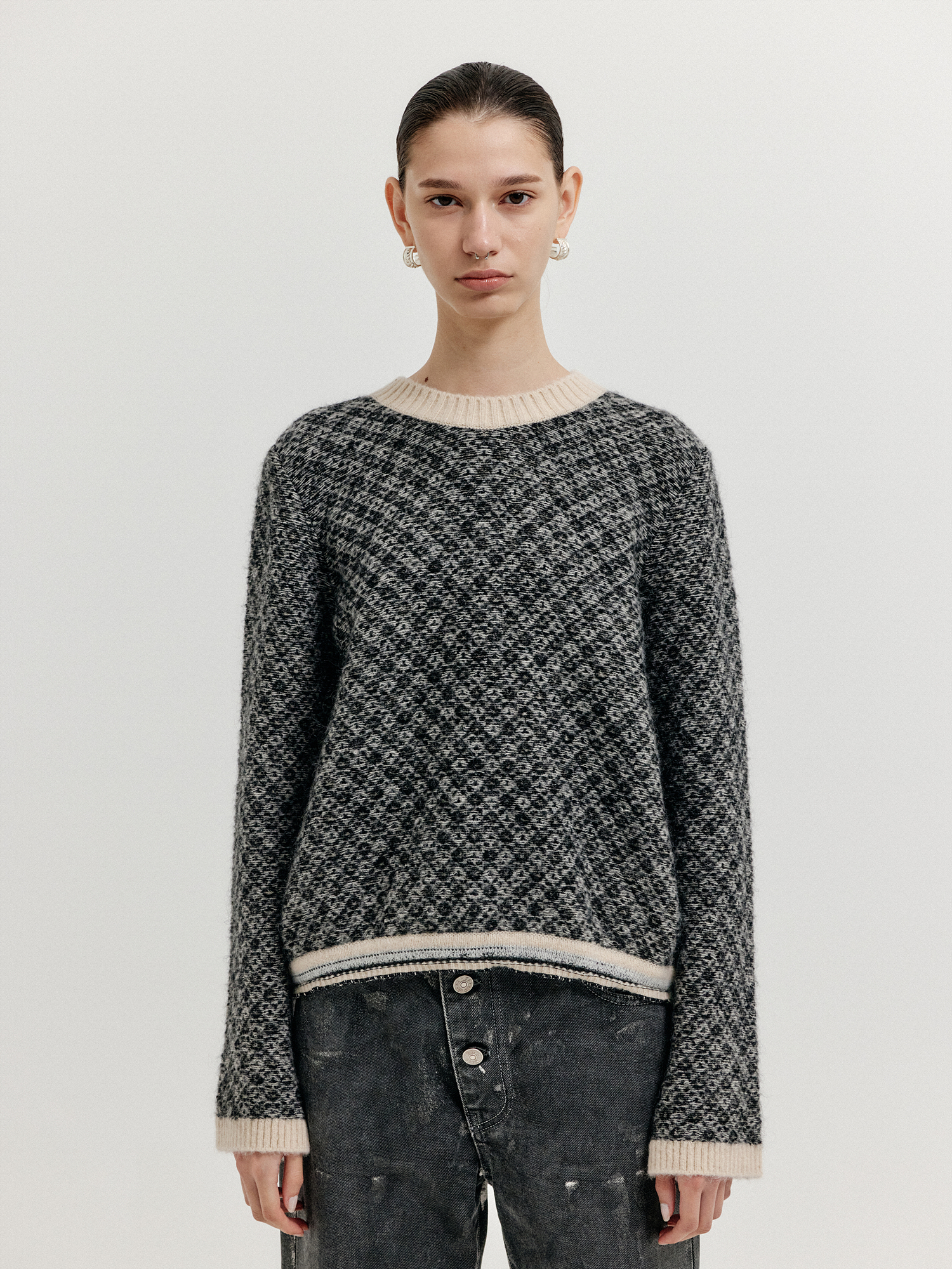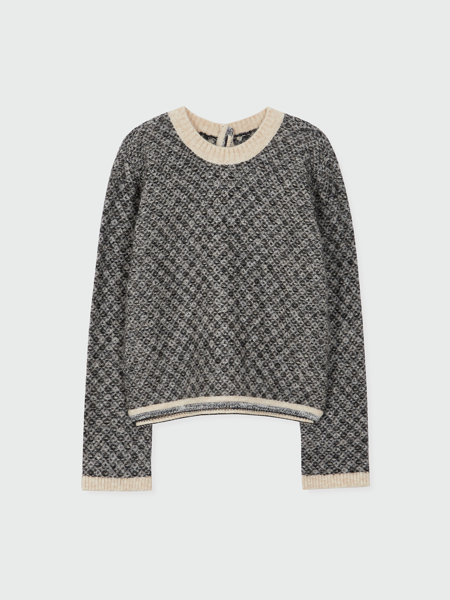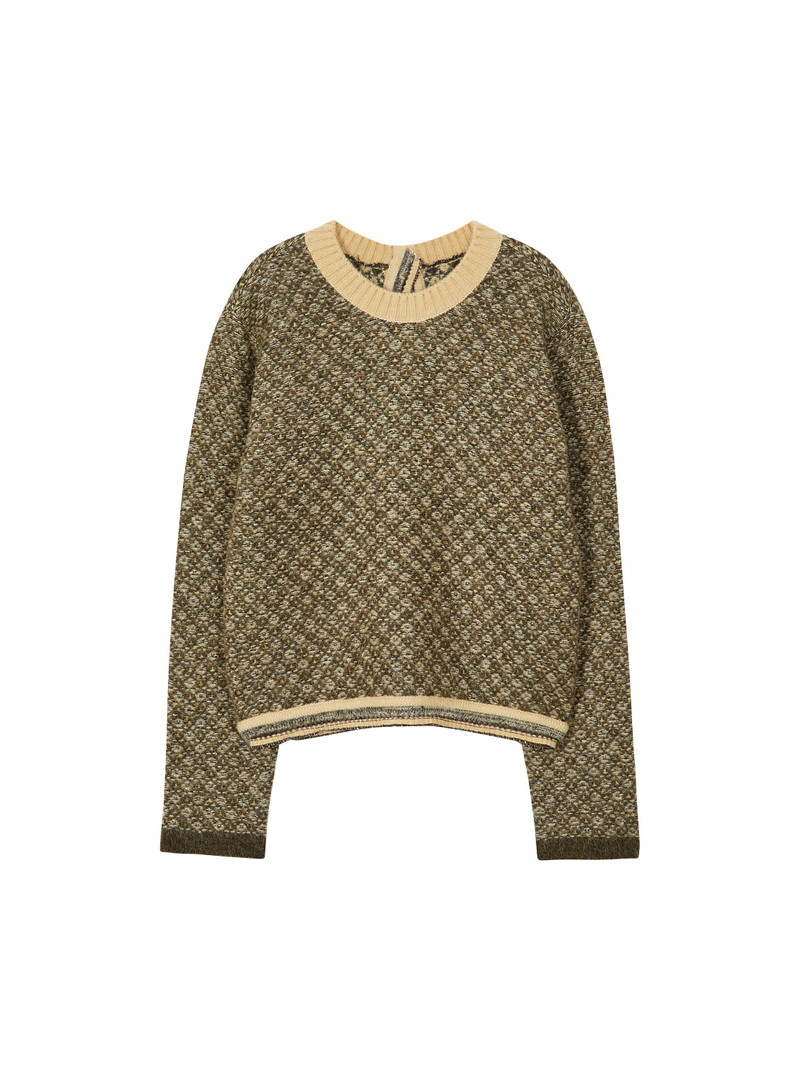 - 자카드 조직에 배색 트리밍으로 포인트를 준 니트 풀오버입니다.