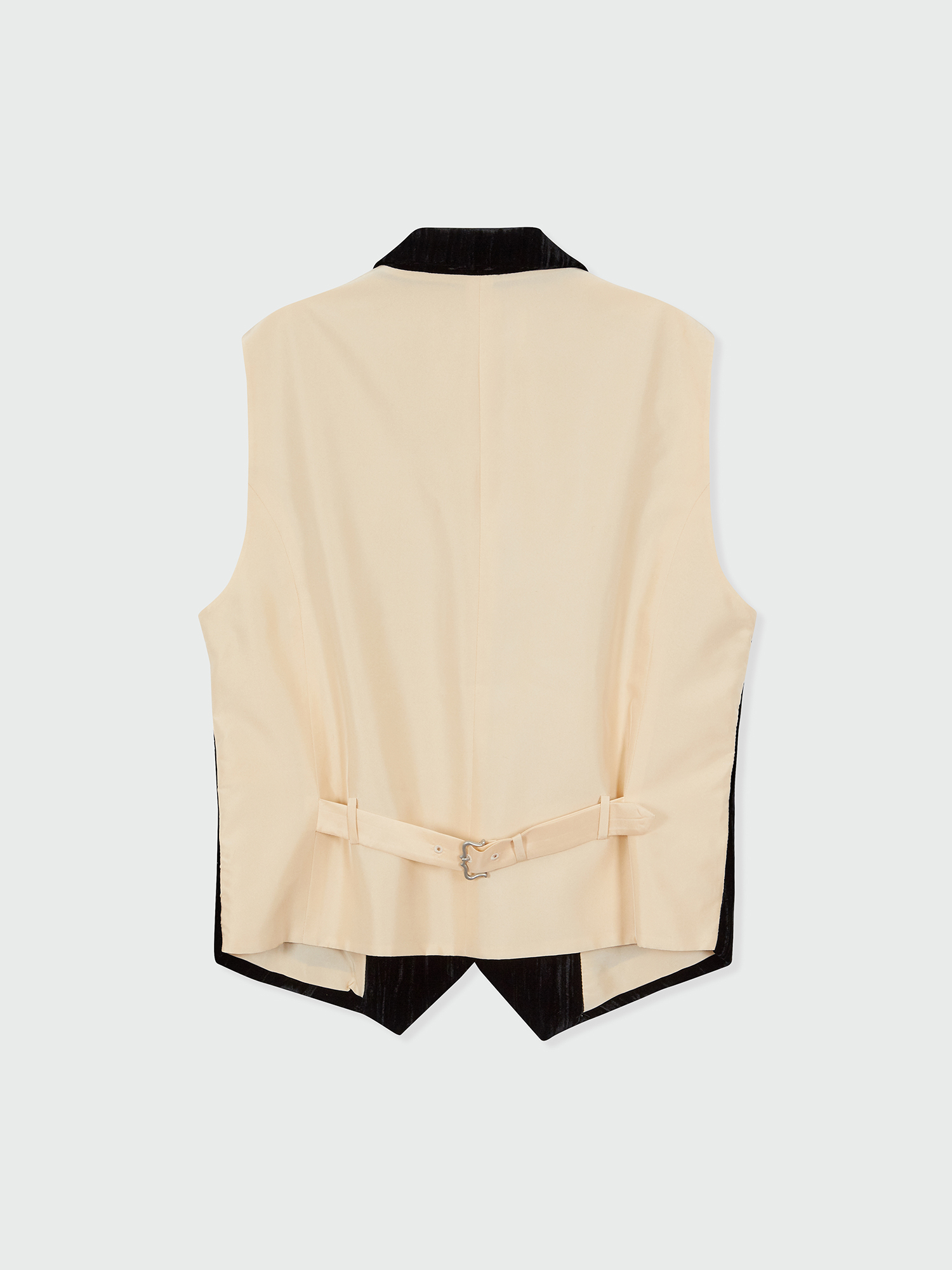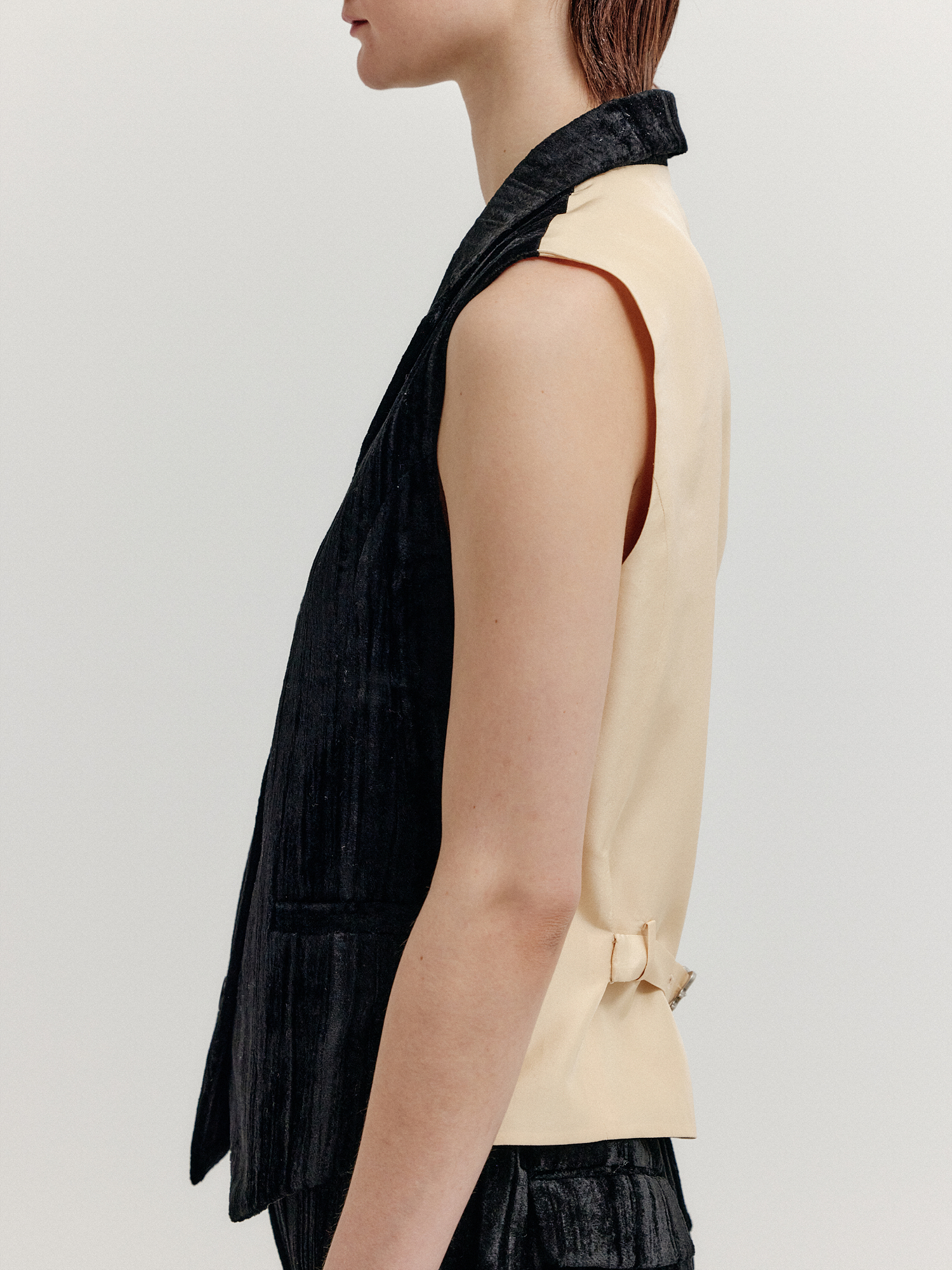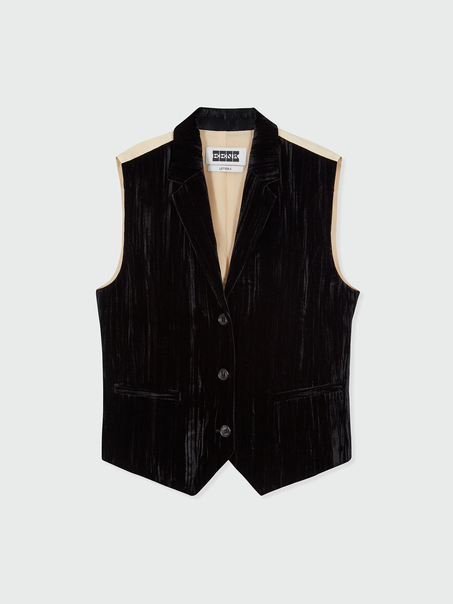 - 앞판과 뒤판의 소재 대비로 포인트를 준 쓰리버튼 베스트입니다.
