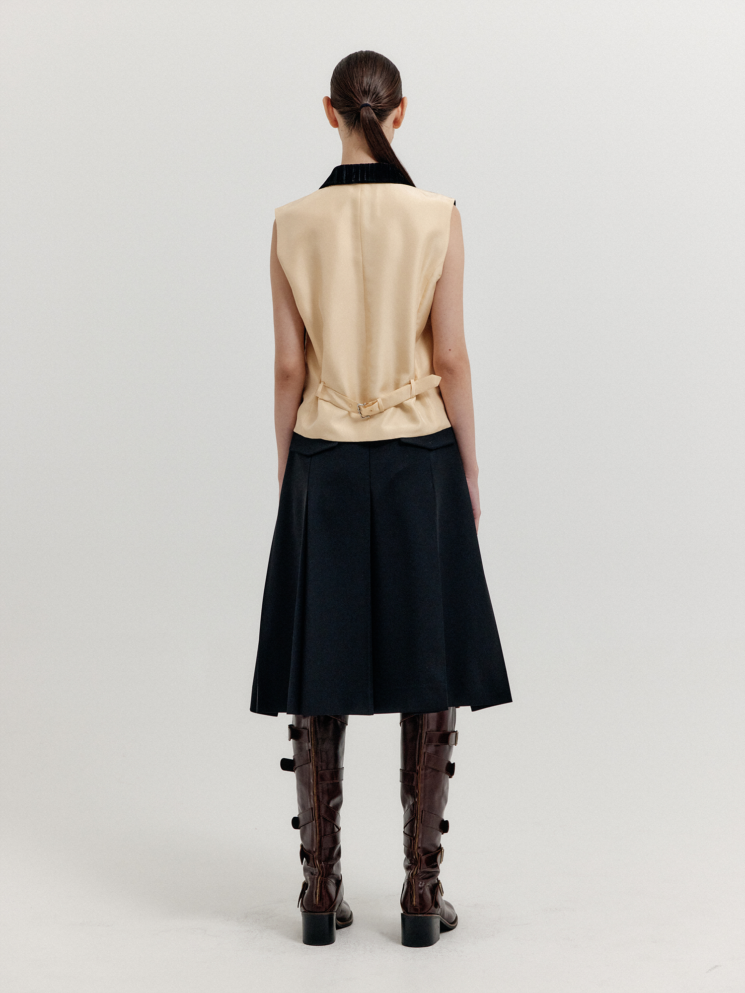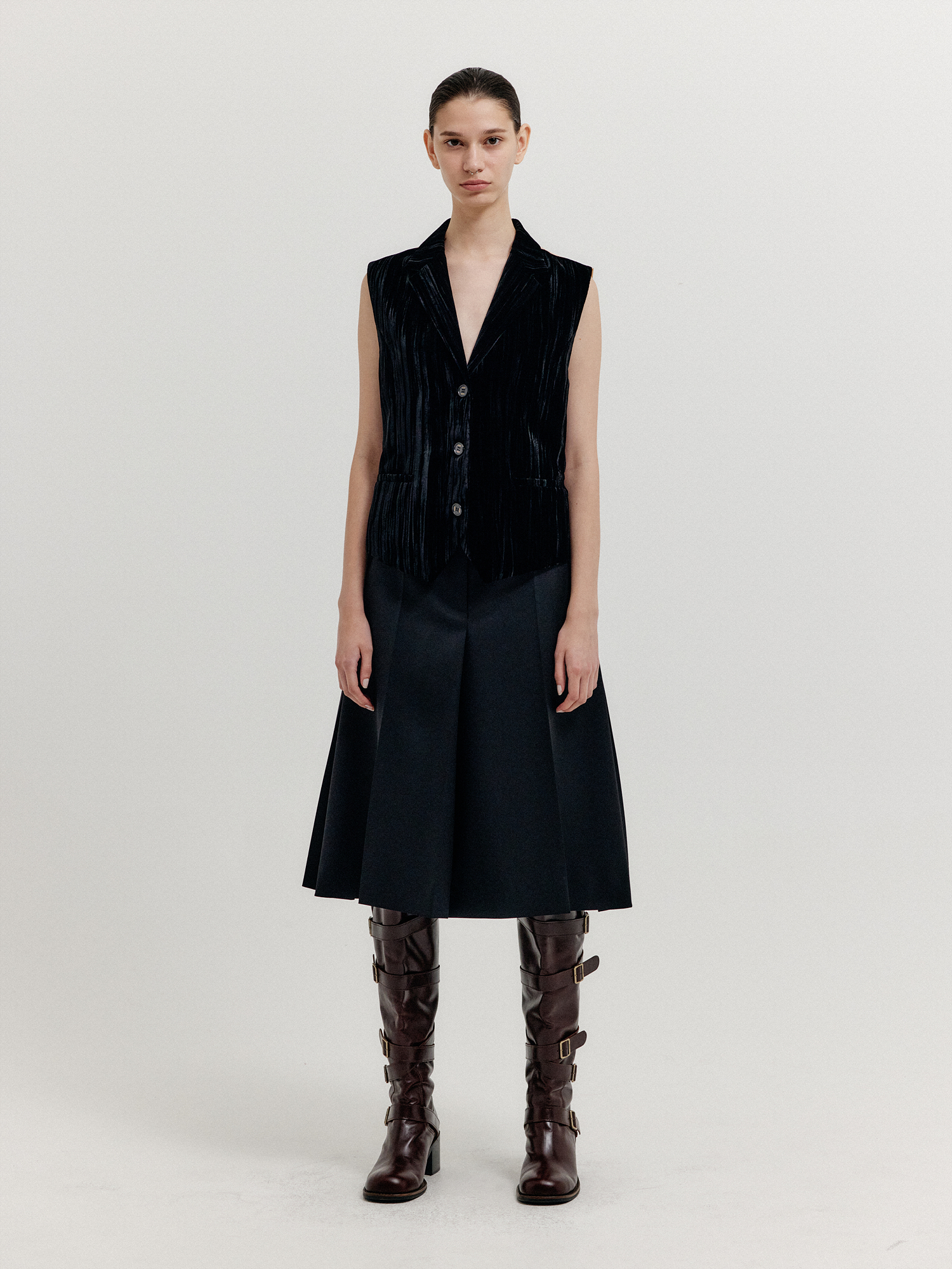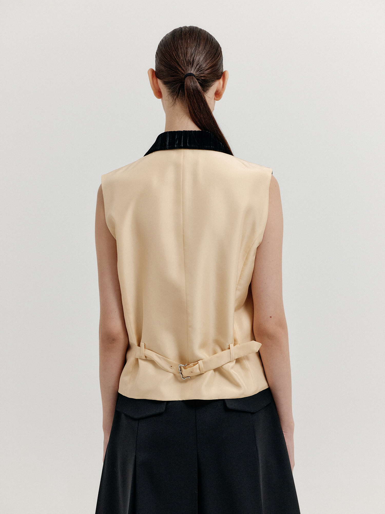 - 앞판과 뒤판의 소재 대비로 포인트를 준 쓰리버튼 베스트입니다.