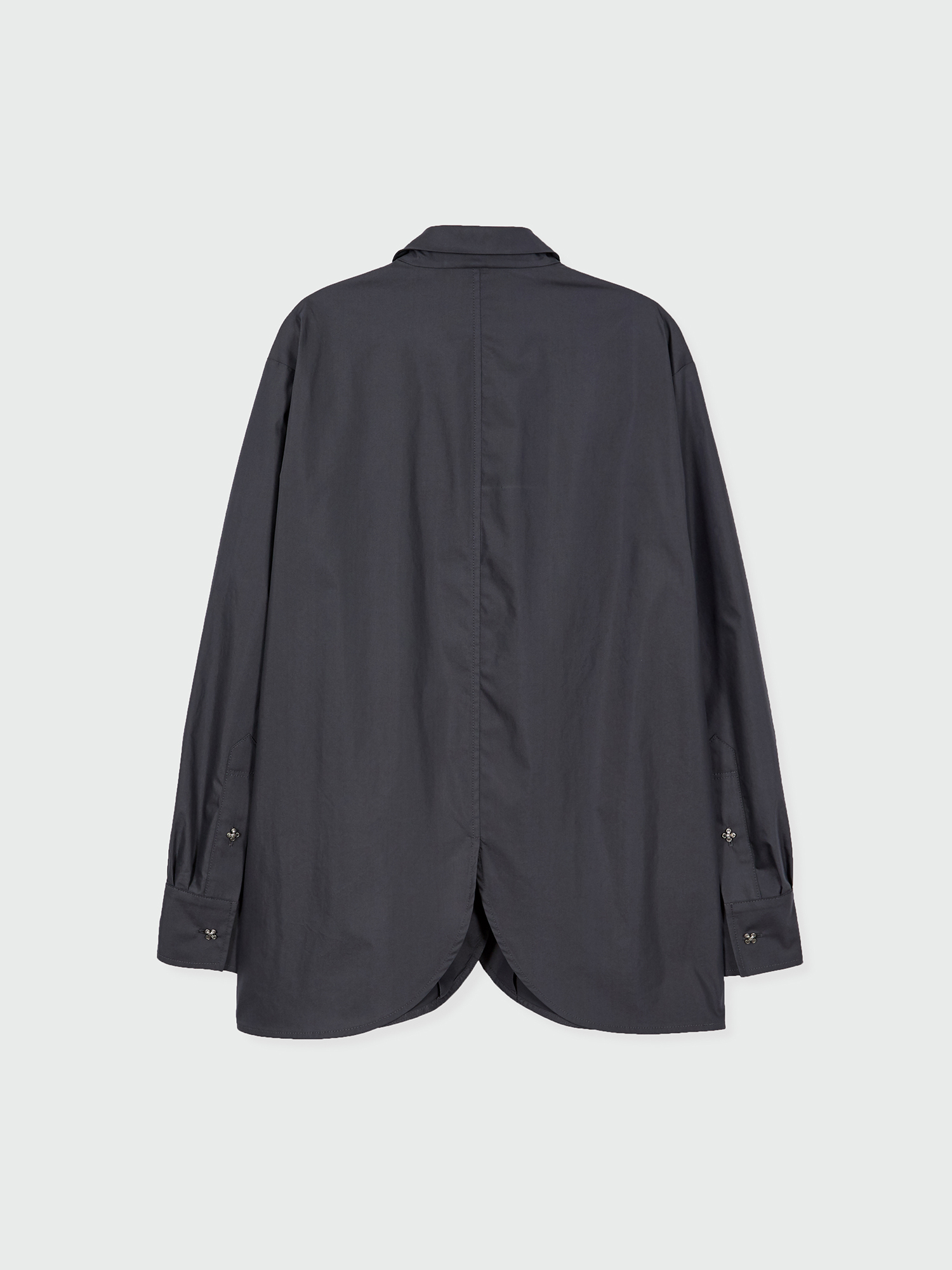 - 둥글게 떨어지는 밑단 라인과 타이 디테일이 특징인 셔츠입니다.