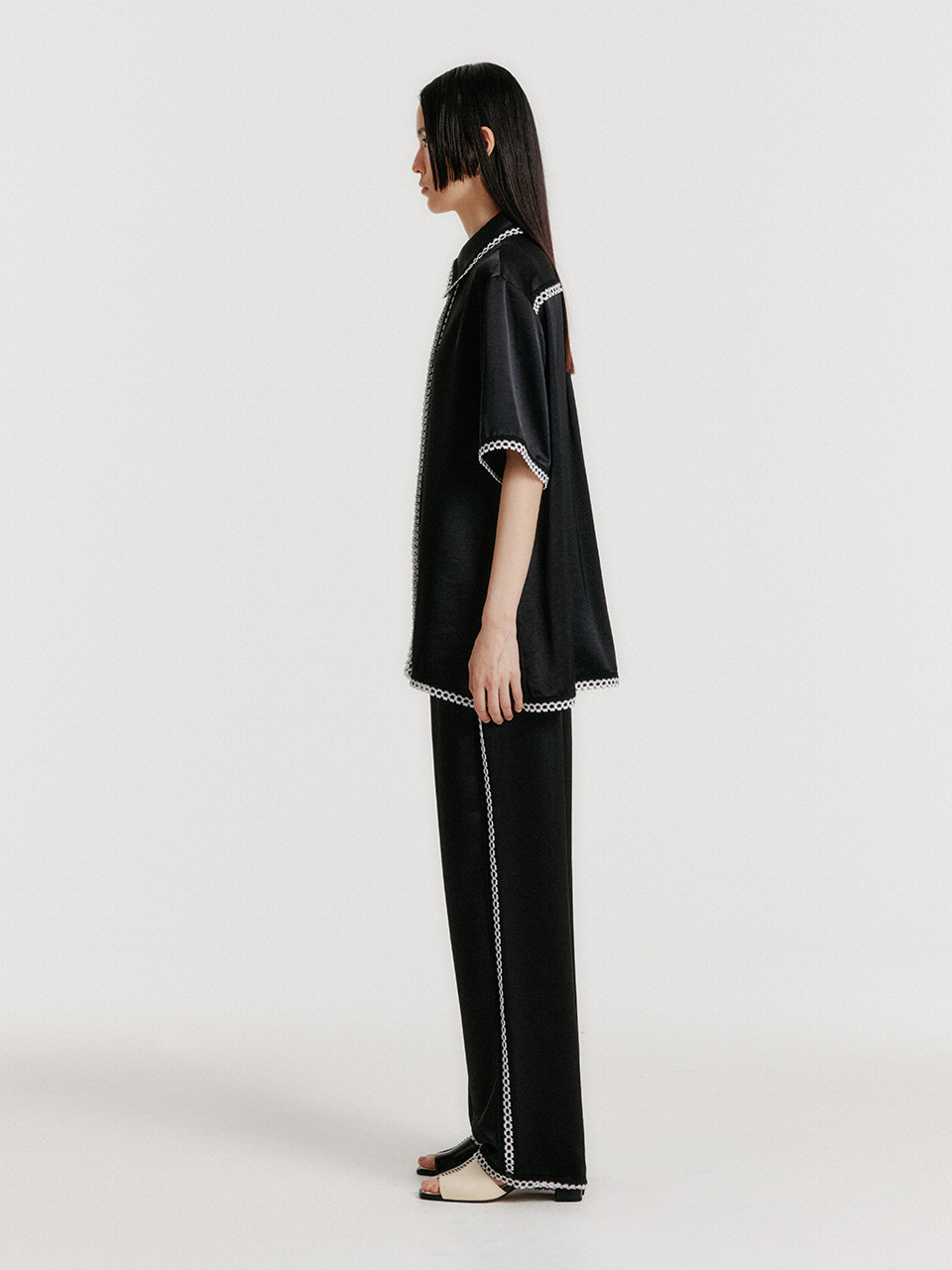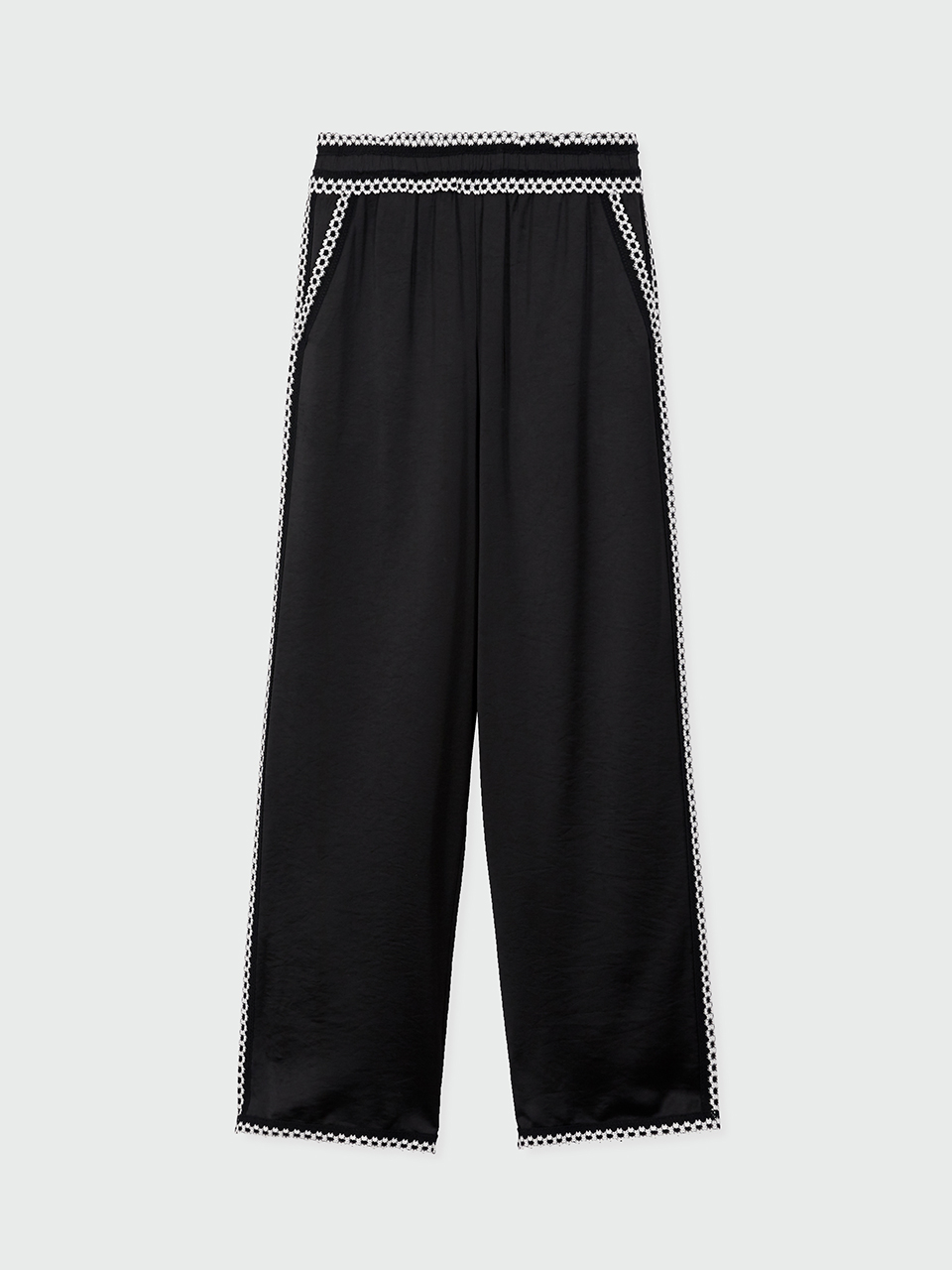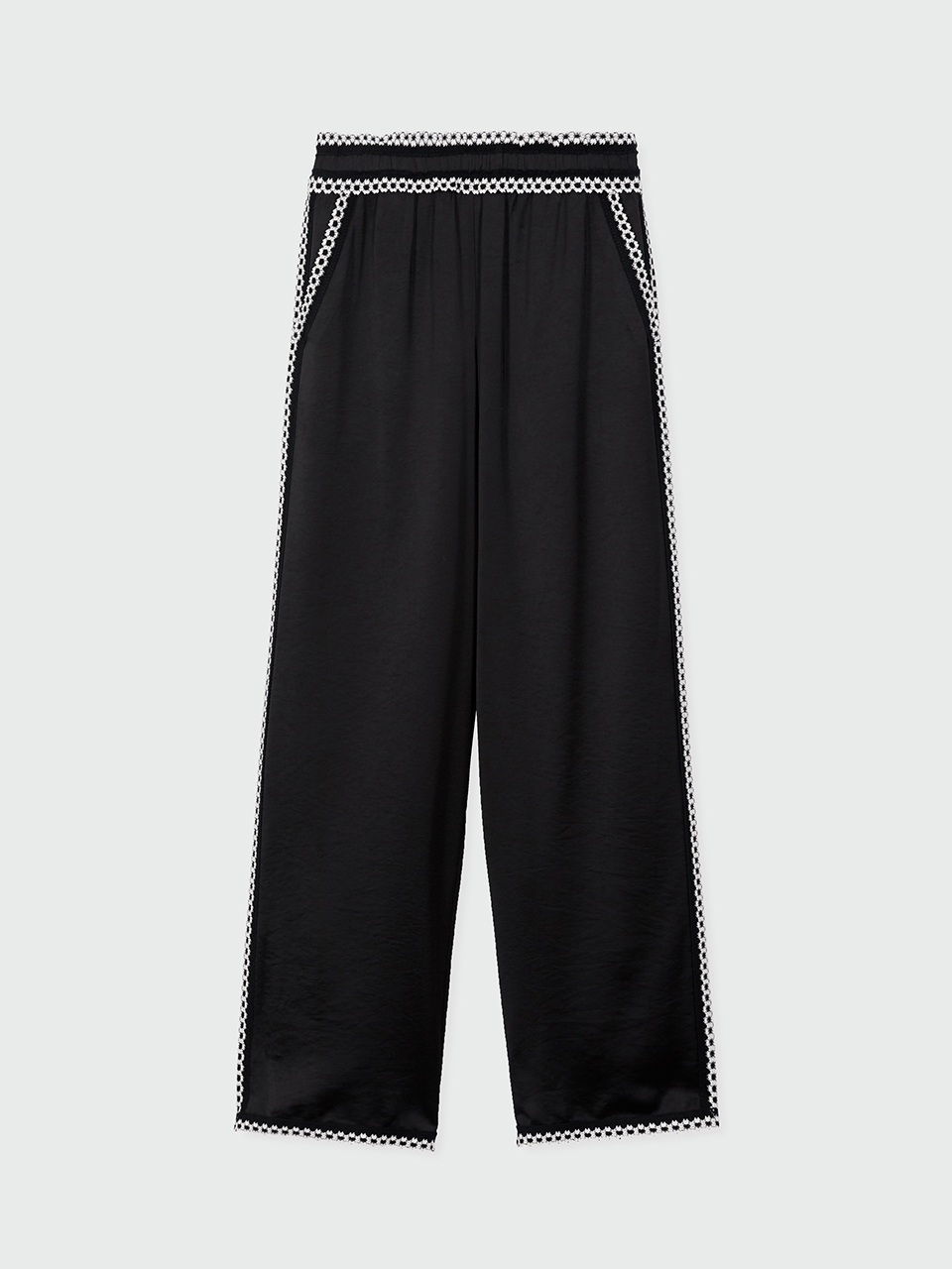- 광택감 있는 소재의 레이스 트리밍이 포인트인 팬츠입니다.