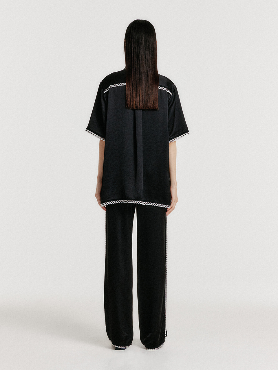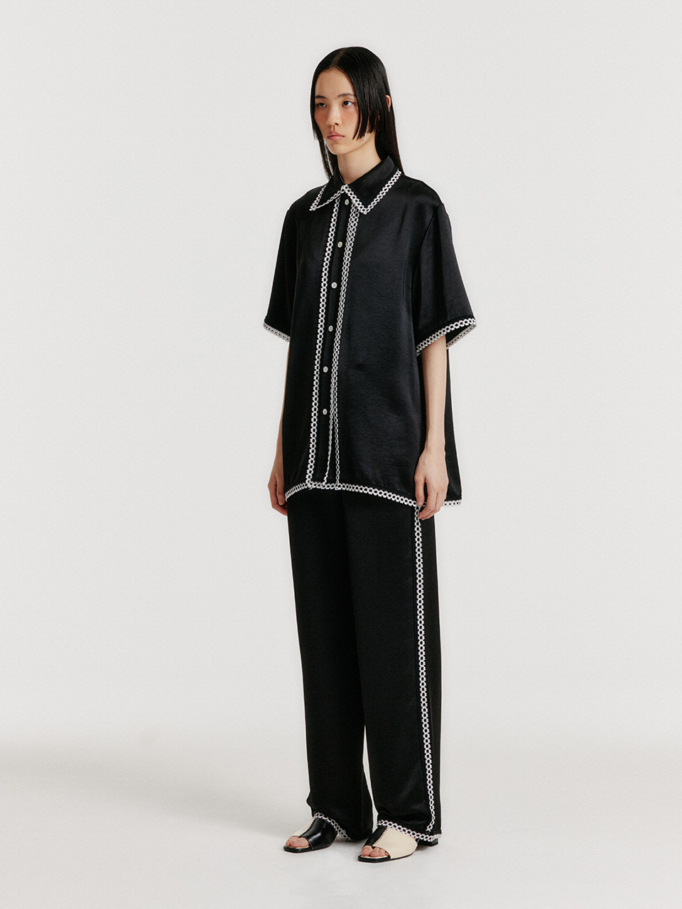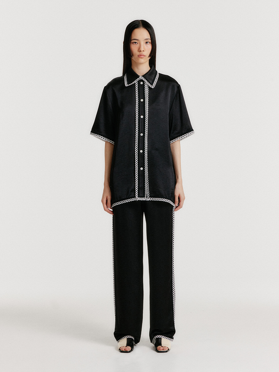 - 광택감 있는 소재의 레이스 트리밍이 포인트인 팬츠입니다.