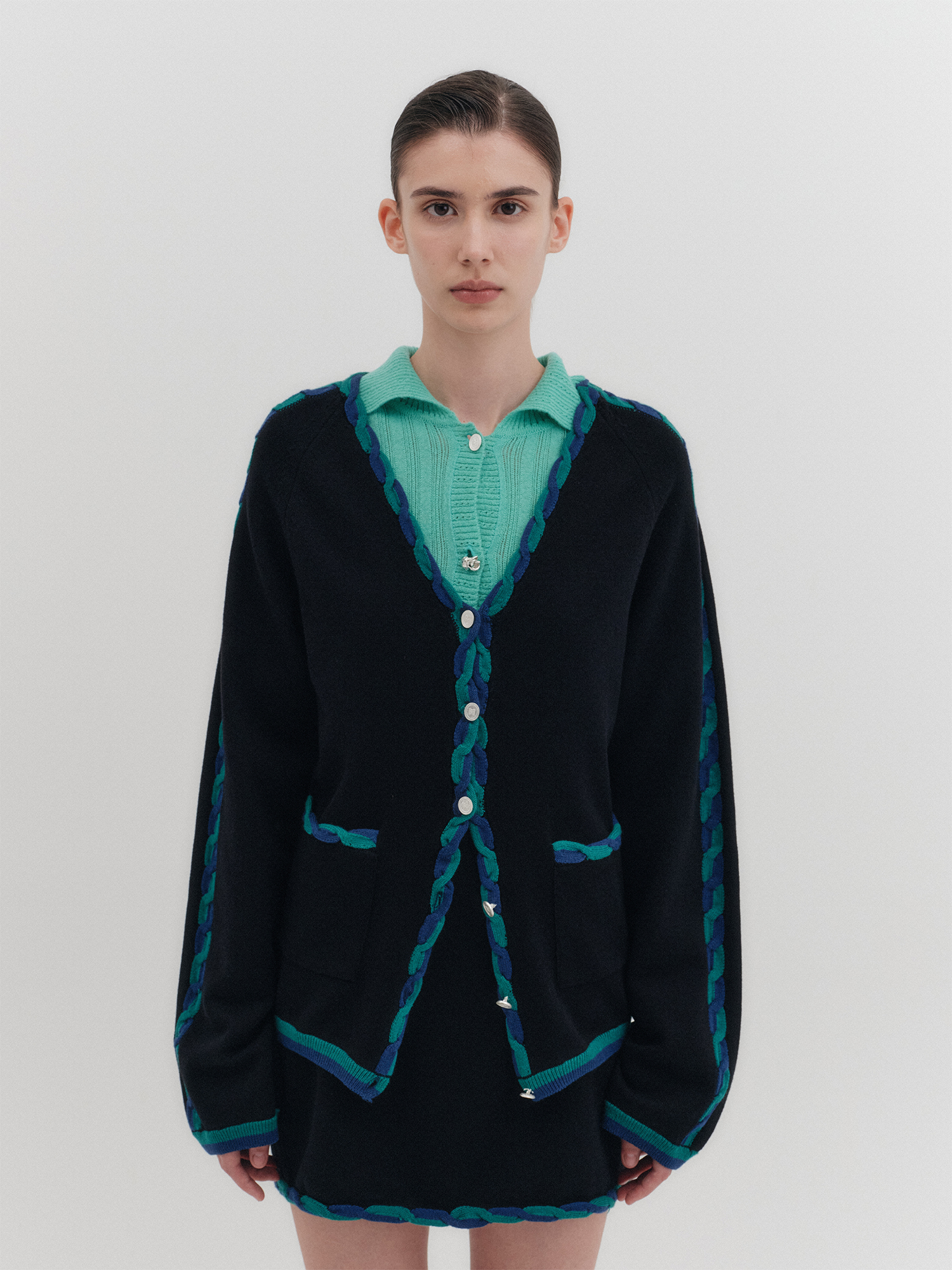 - 같은 디자인의 가디건, 니트 탑과 셋업