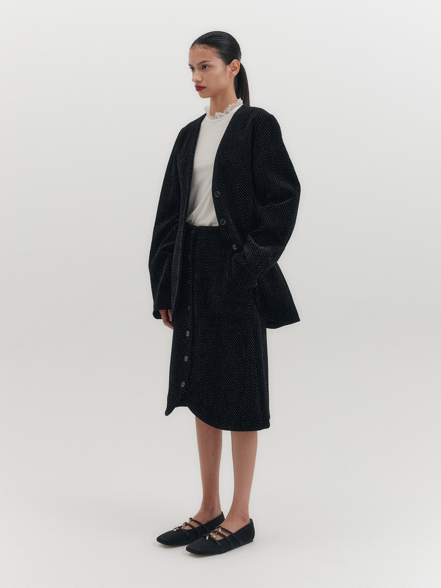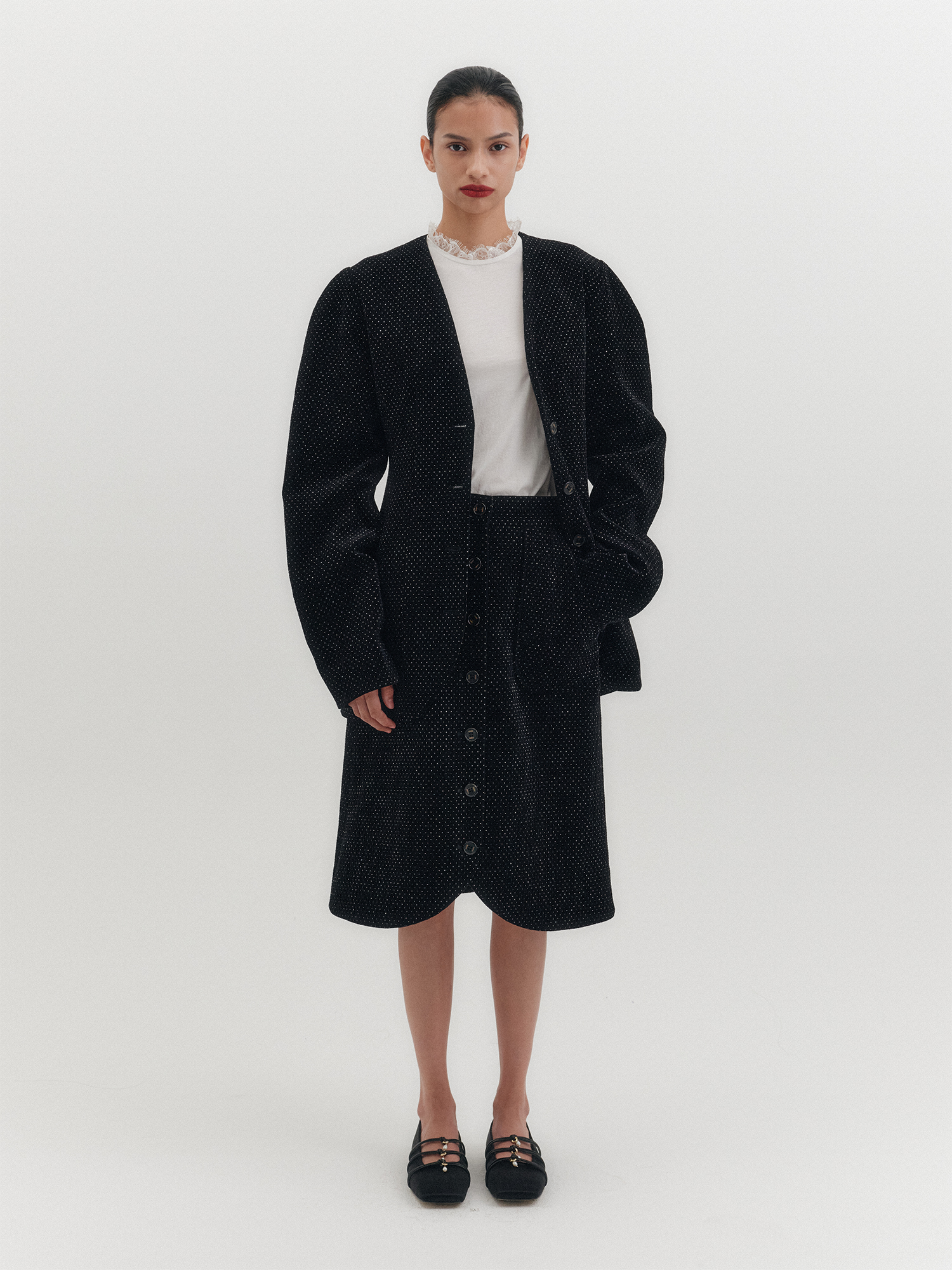 - 곡선형 커팅의 밑단 마감 & 버튼업 여밈 방식