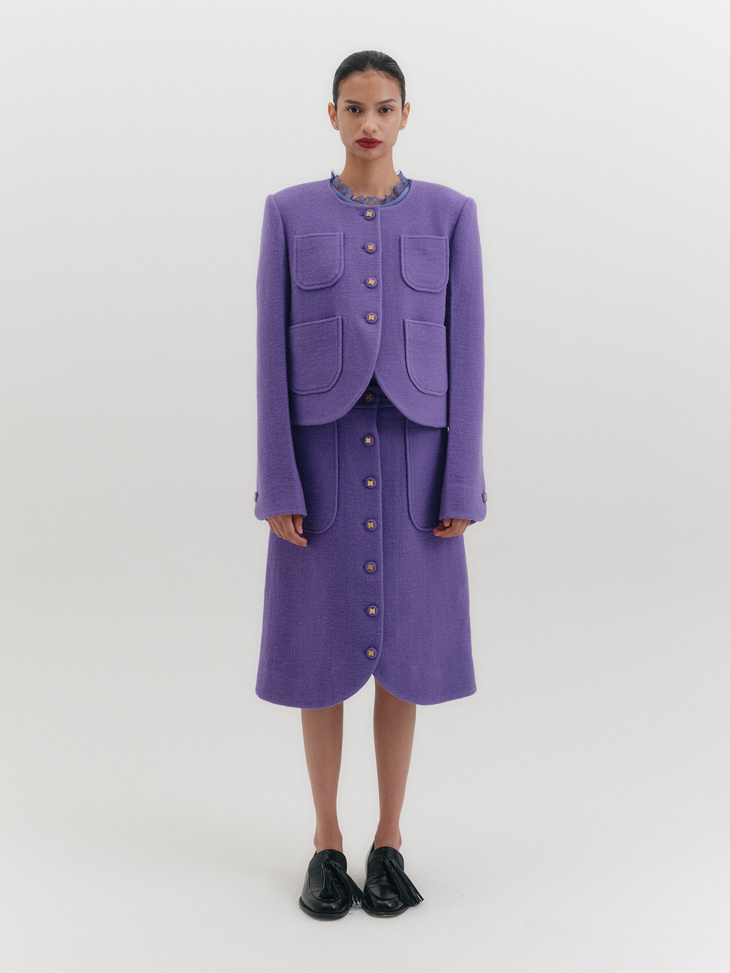 - 곡선형 커팅의 밑단 마감 & 버튼업 여밈 방식