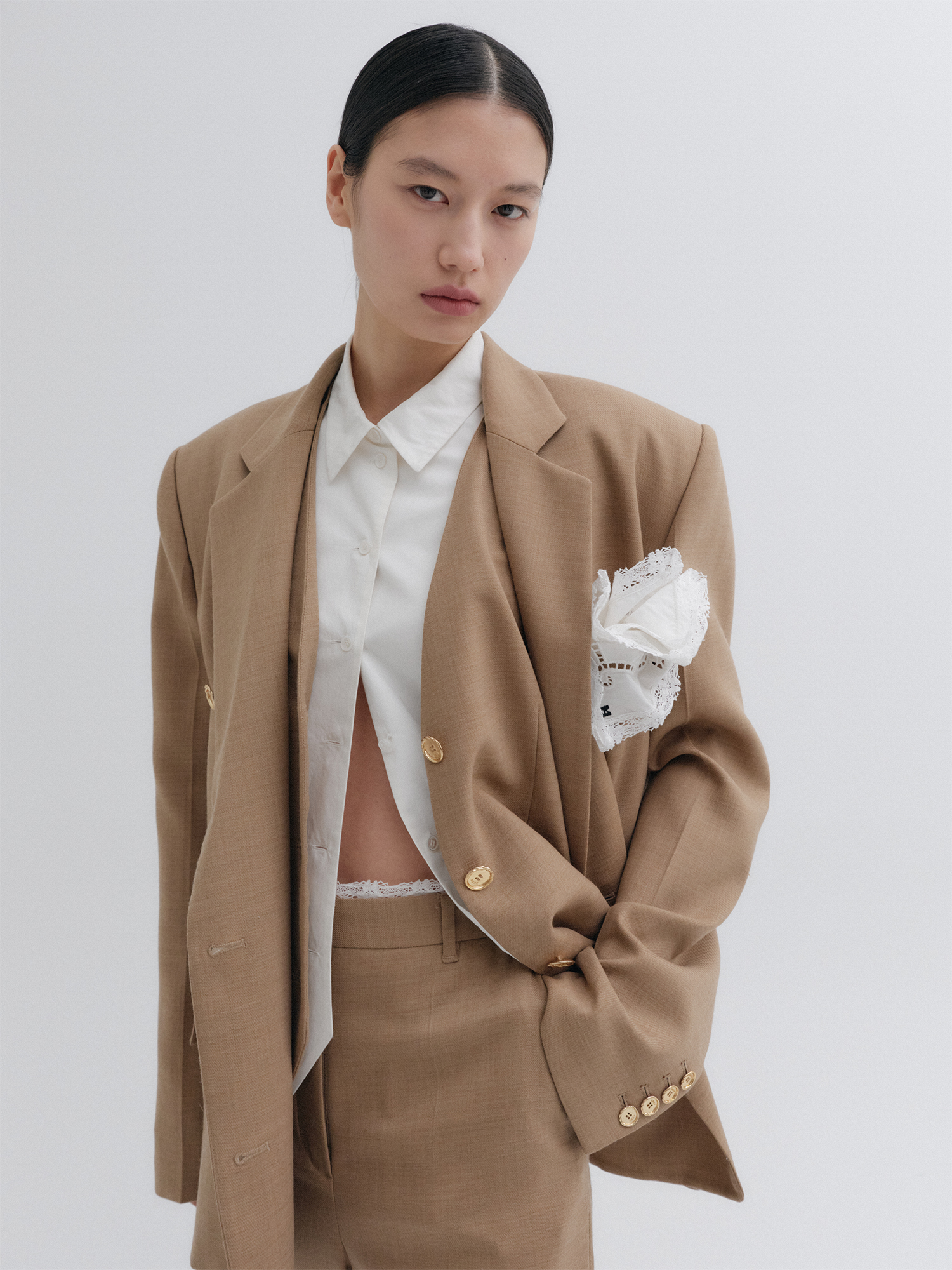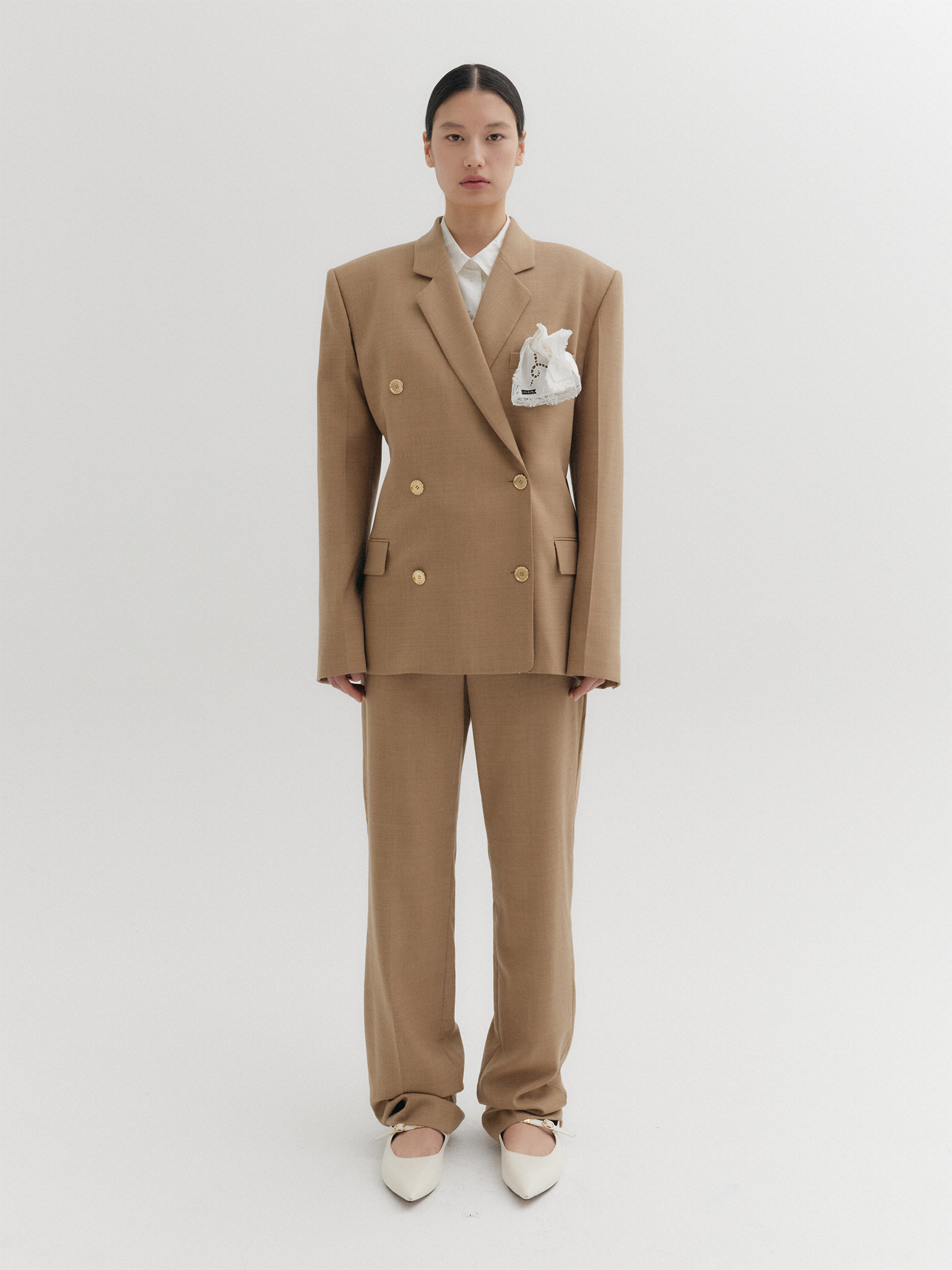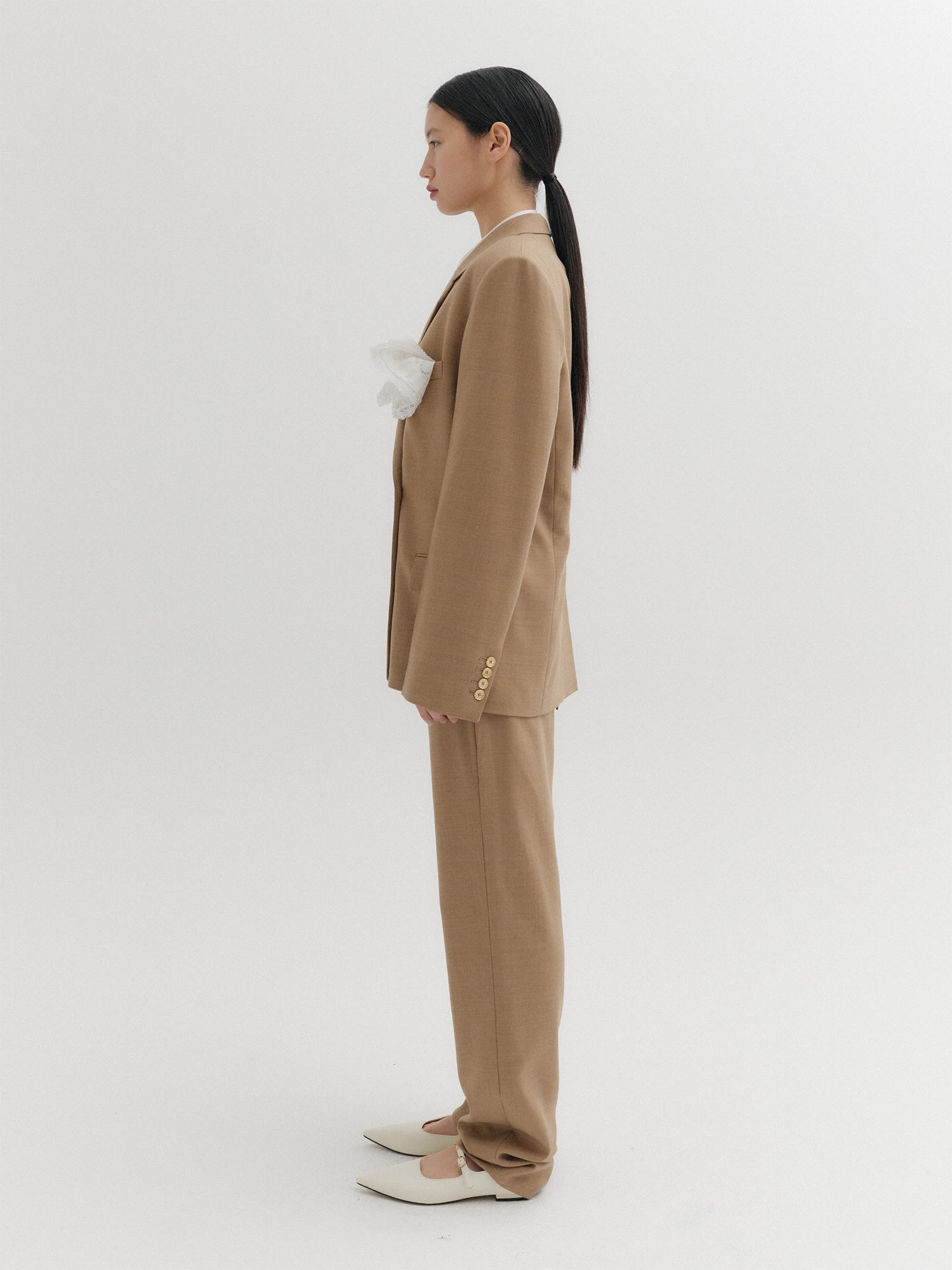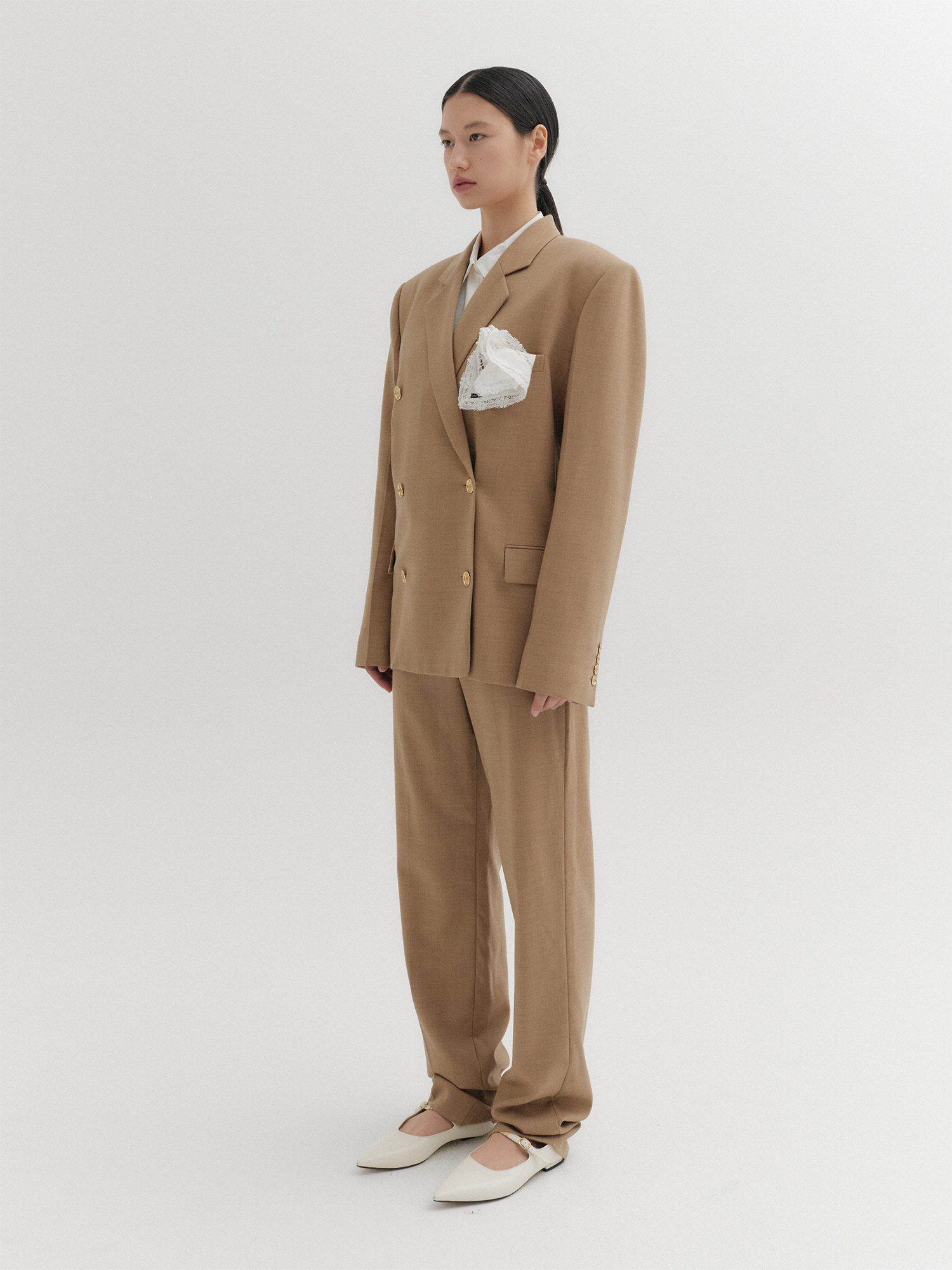 MATERIAL : Shell : Virgin Wool 99%, Lyocell 1% (Fabric from ITALY) / Trim : Cotton 100% / Lining : Polyester 100% / Handkerchief : Cotton 100%