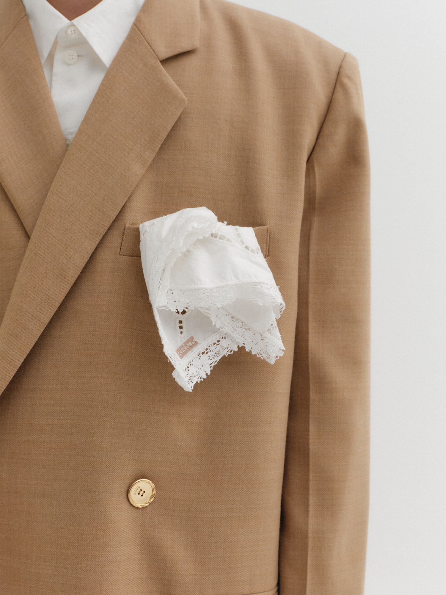 MATERIAL : Shell : Virgin Wool 99%, Lyocell 1% / Trim : Cotton 100% / Lining : Polyester 100% / Handkerchief : Cotton 100%