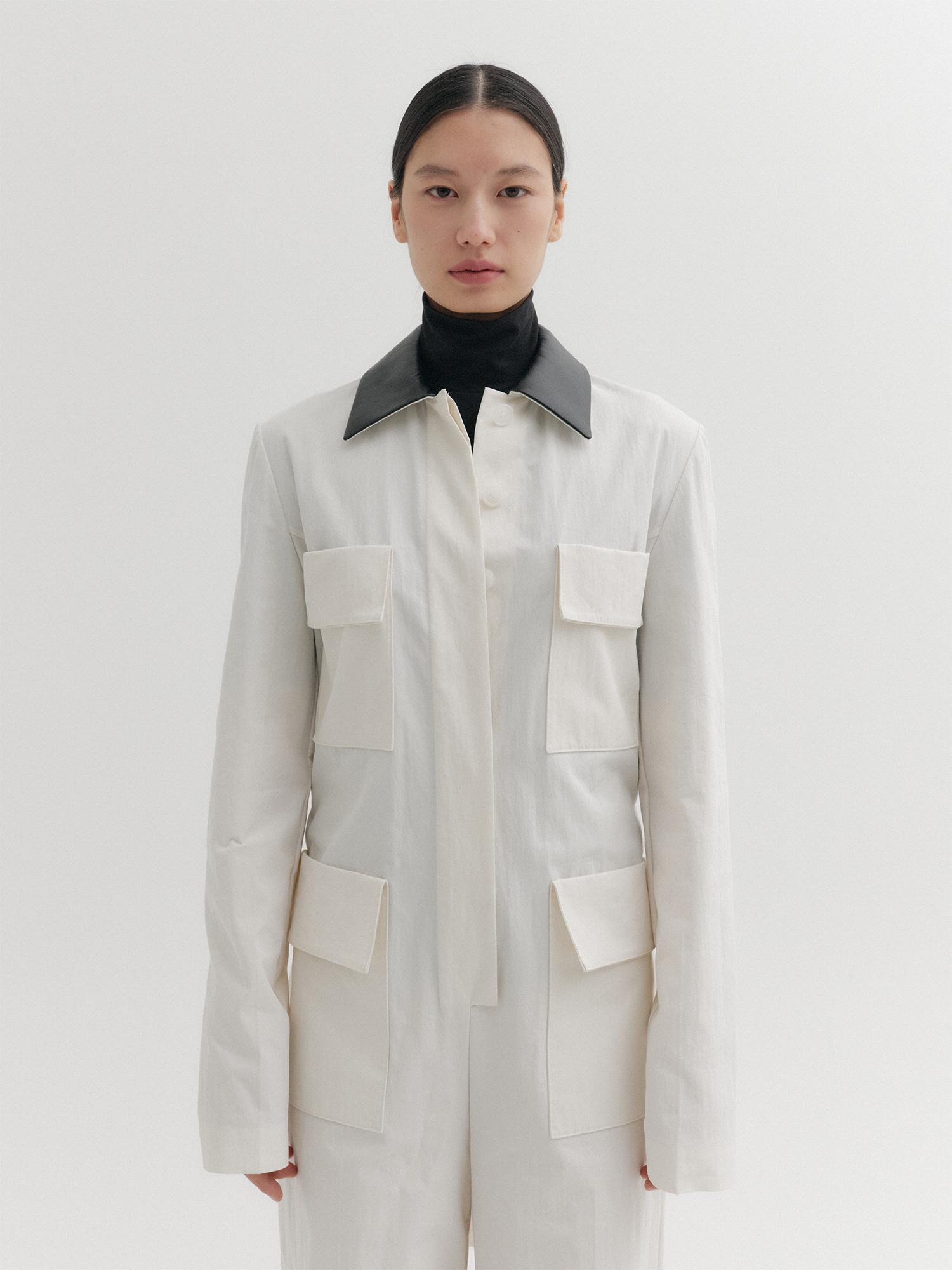 - 가죽 배색 카라 디테일