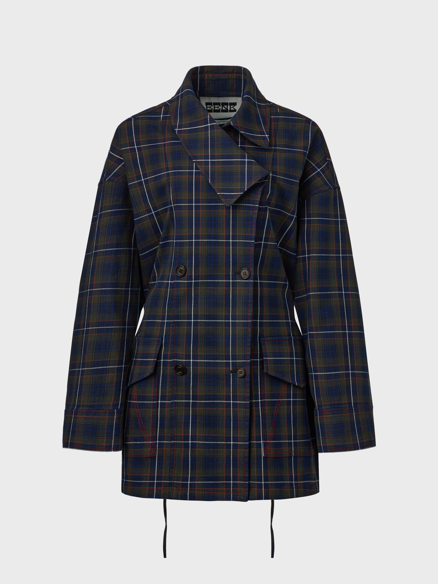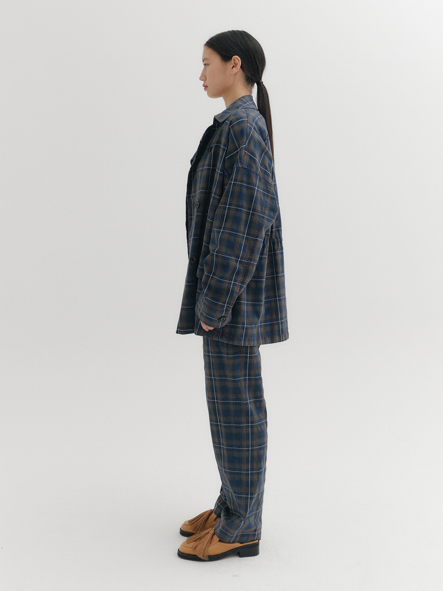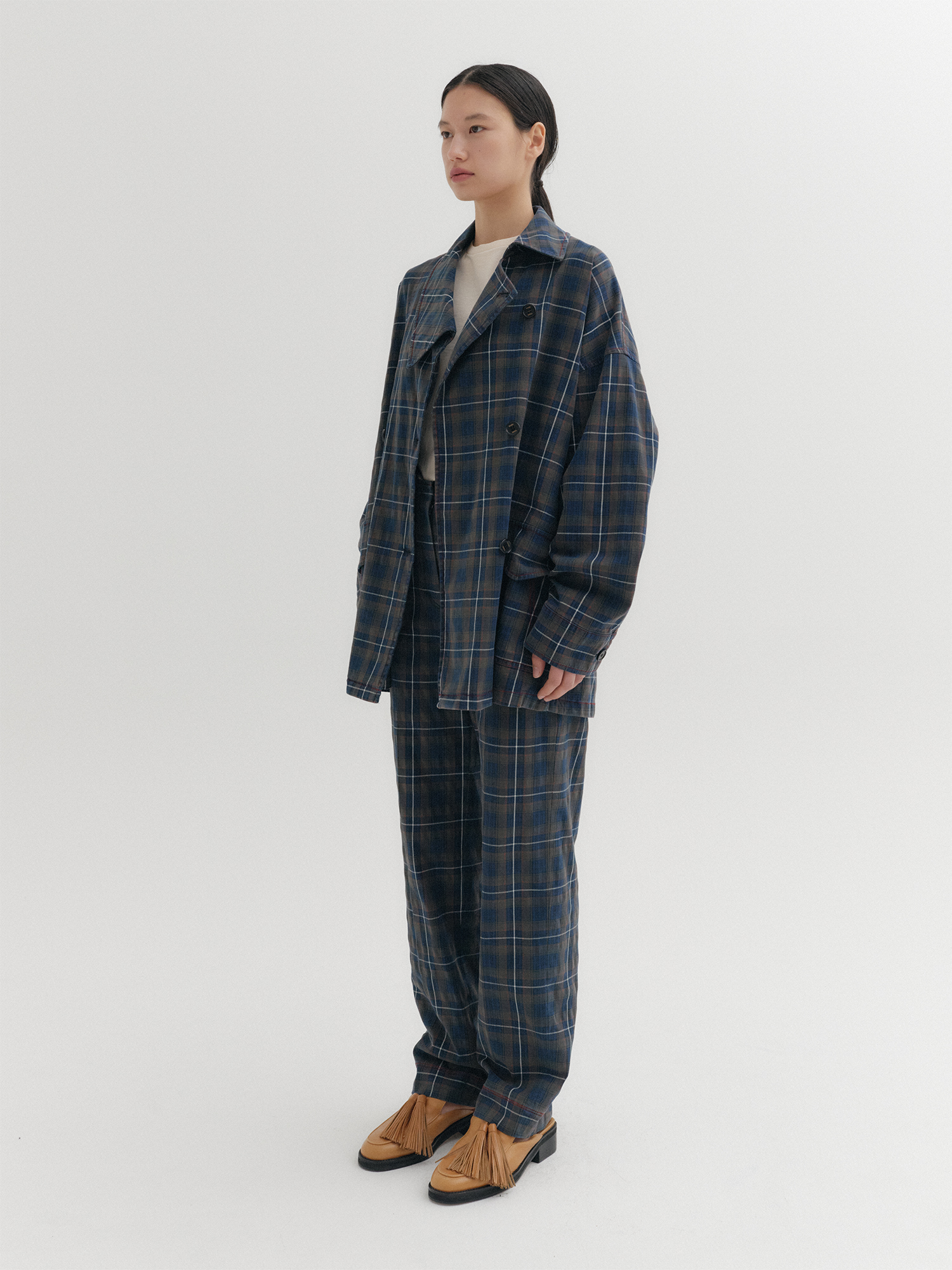 - 체크 패턴의 언밸런스 카라 자켓