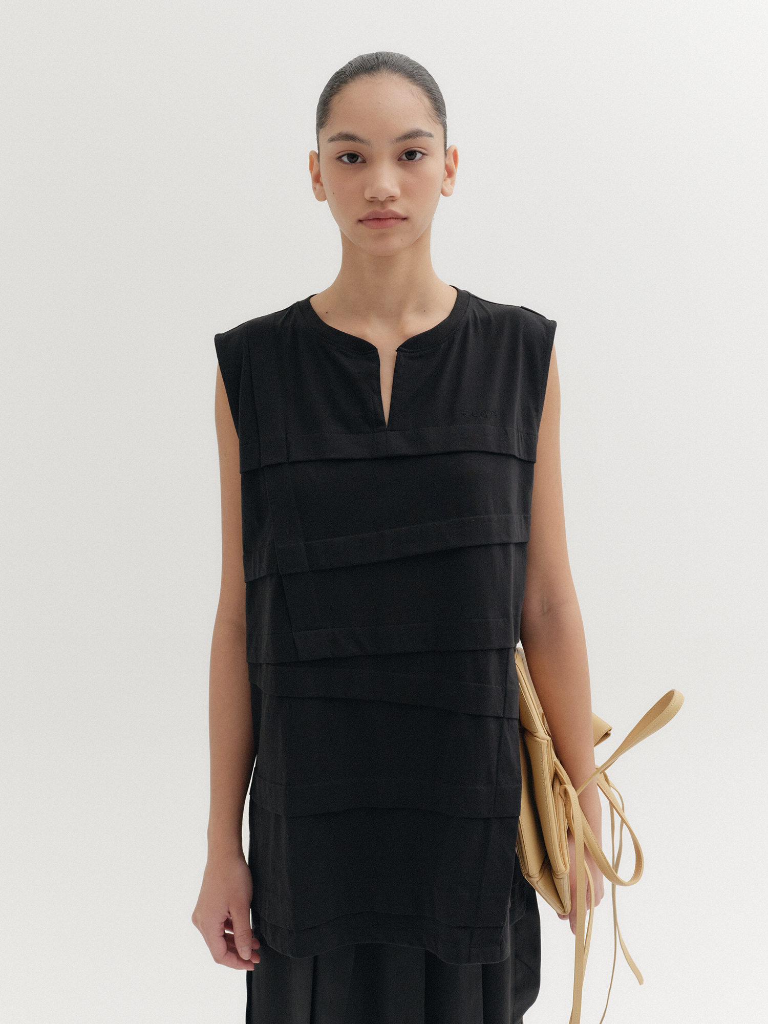 - 넥 트임 디테일의 슬리브리스 탑