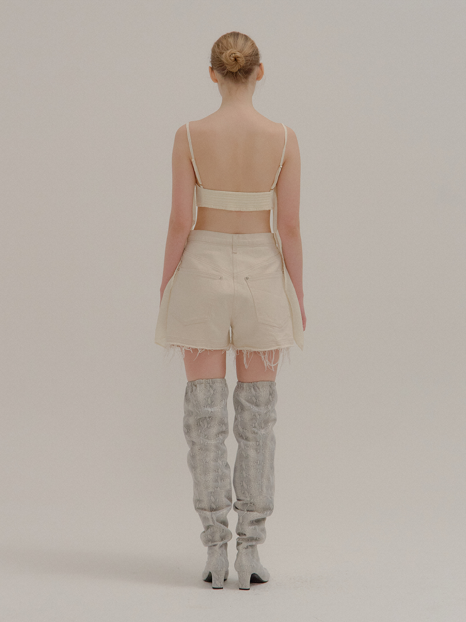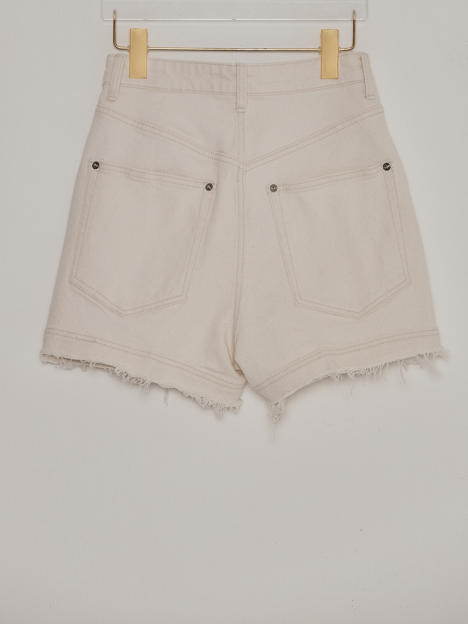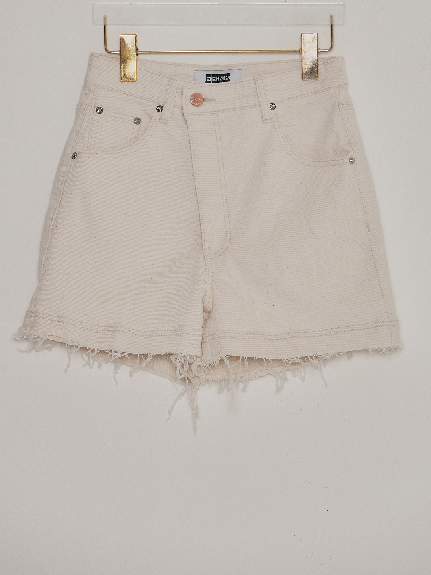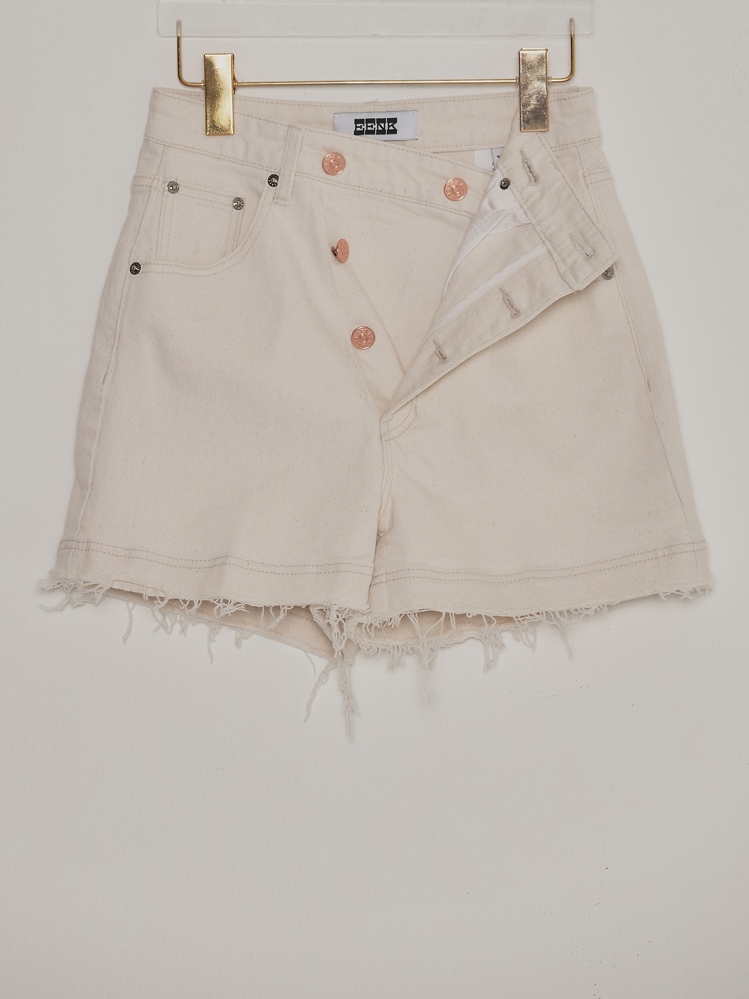 POCO Asymmetric Front Distressed Ivory Denim Shorts Ivory