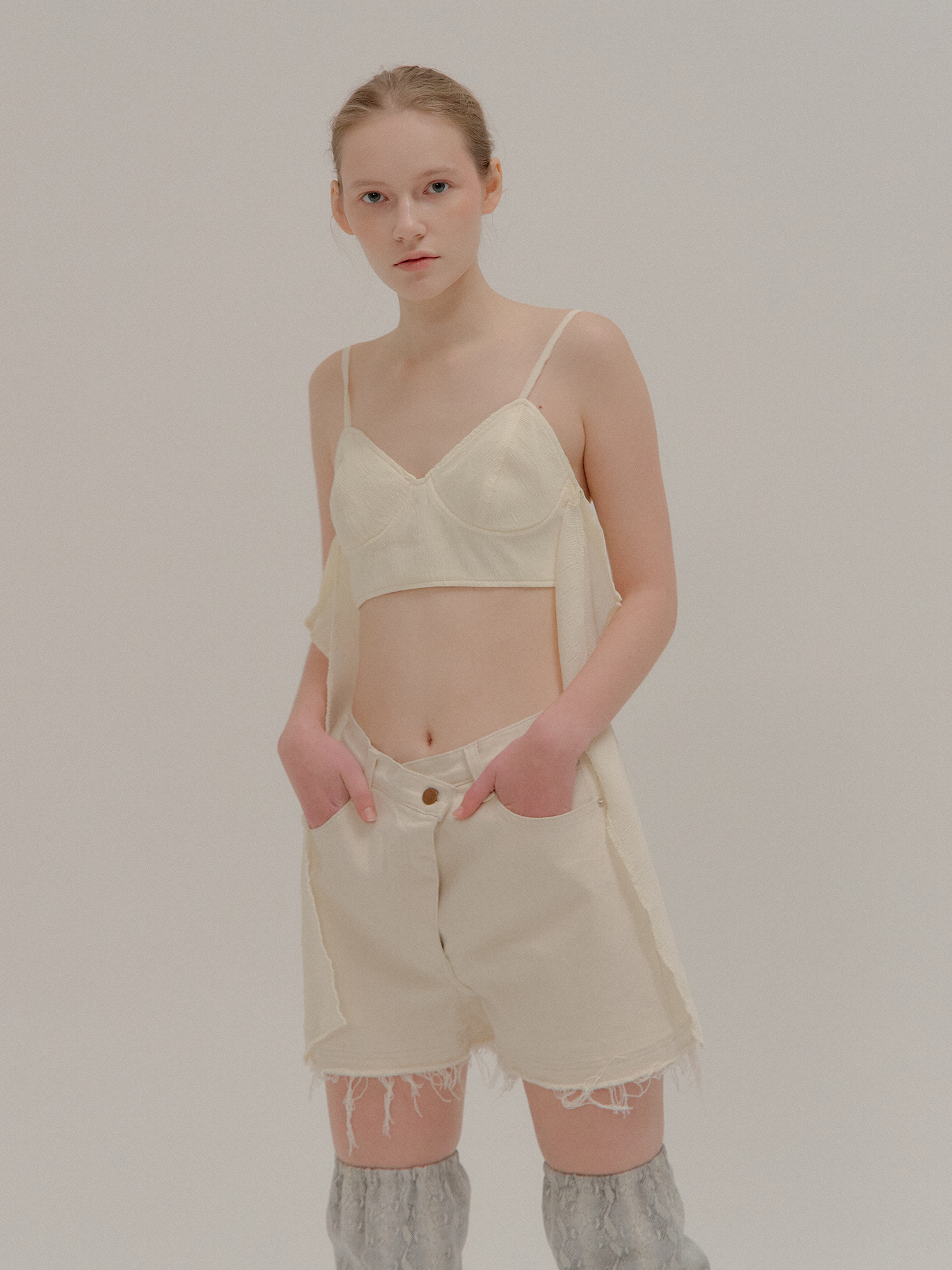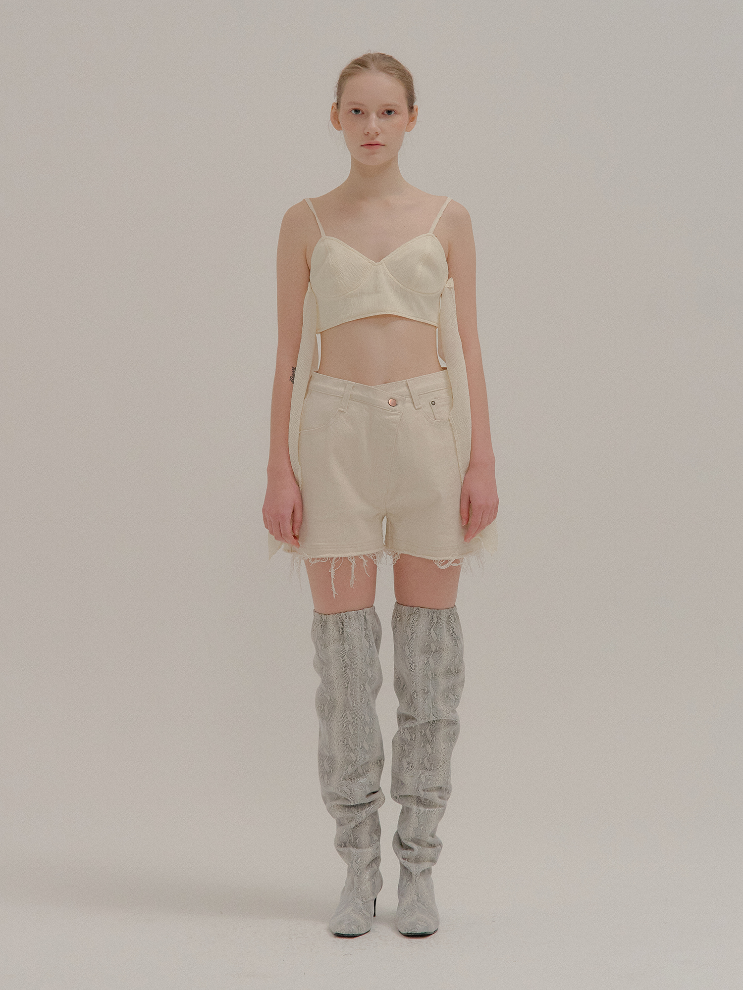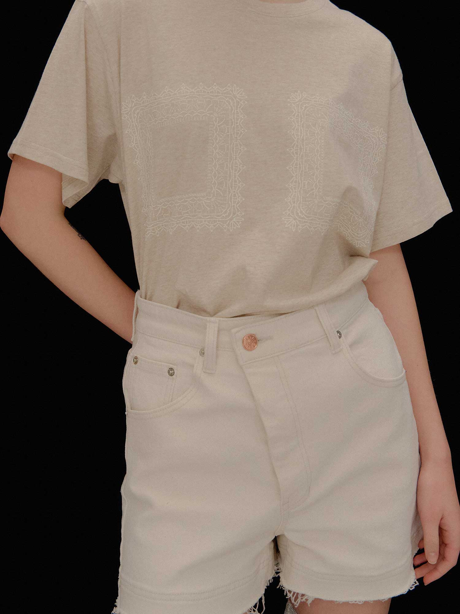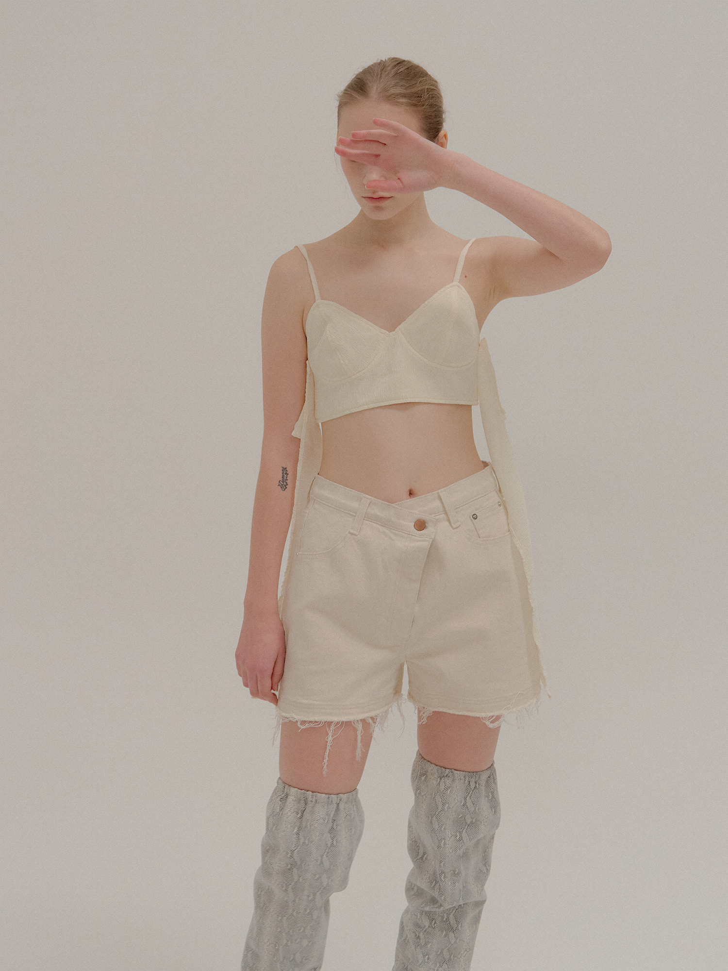 POCO Asymmetric Front Distressed Ivory Denim Shorts Ivory