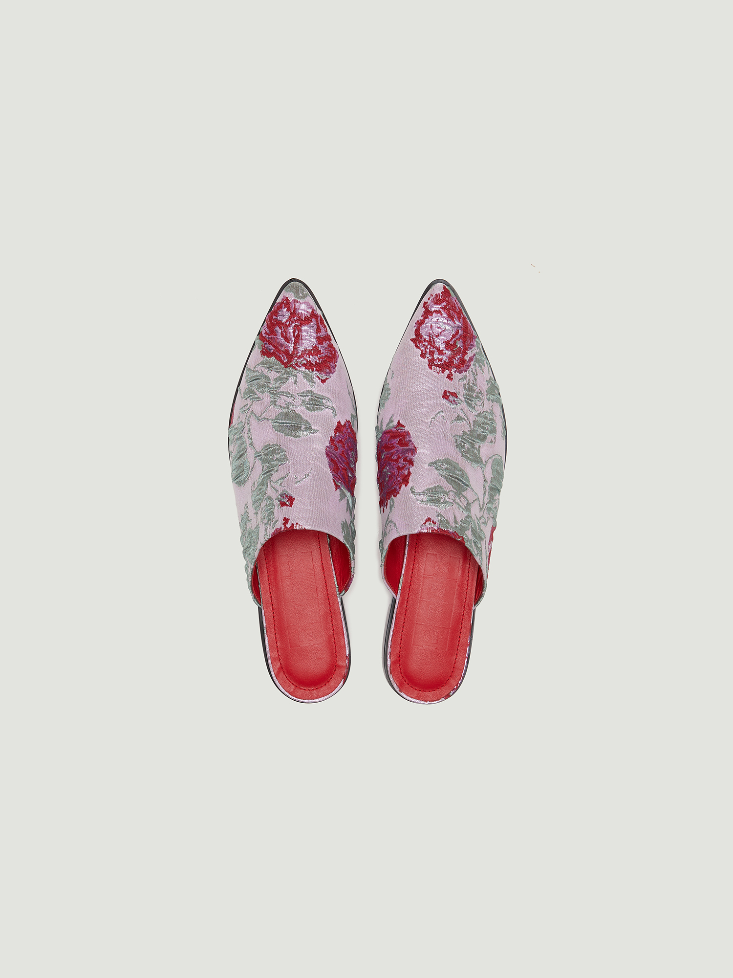 - 꽃무늬 자가드 포인티드 토 뮬입니다.