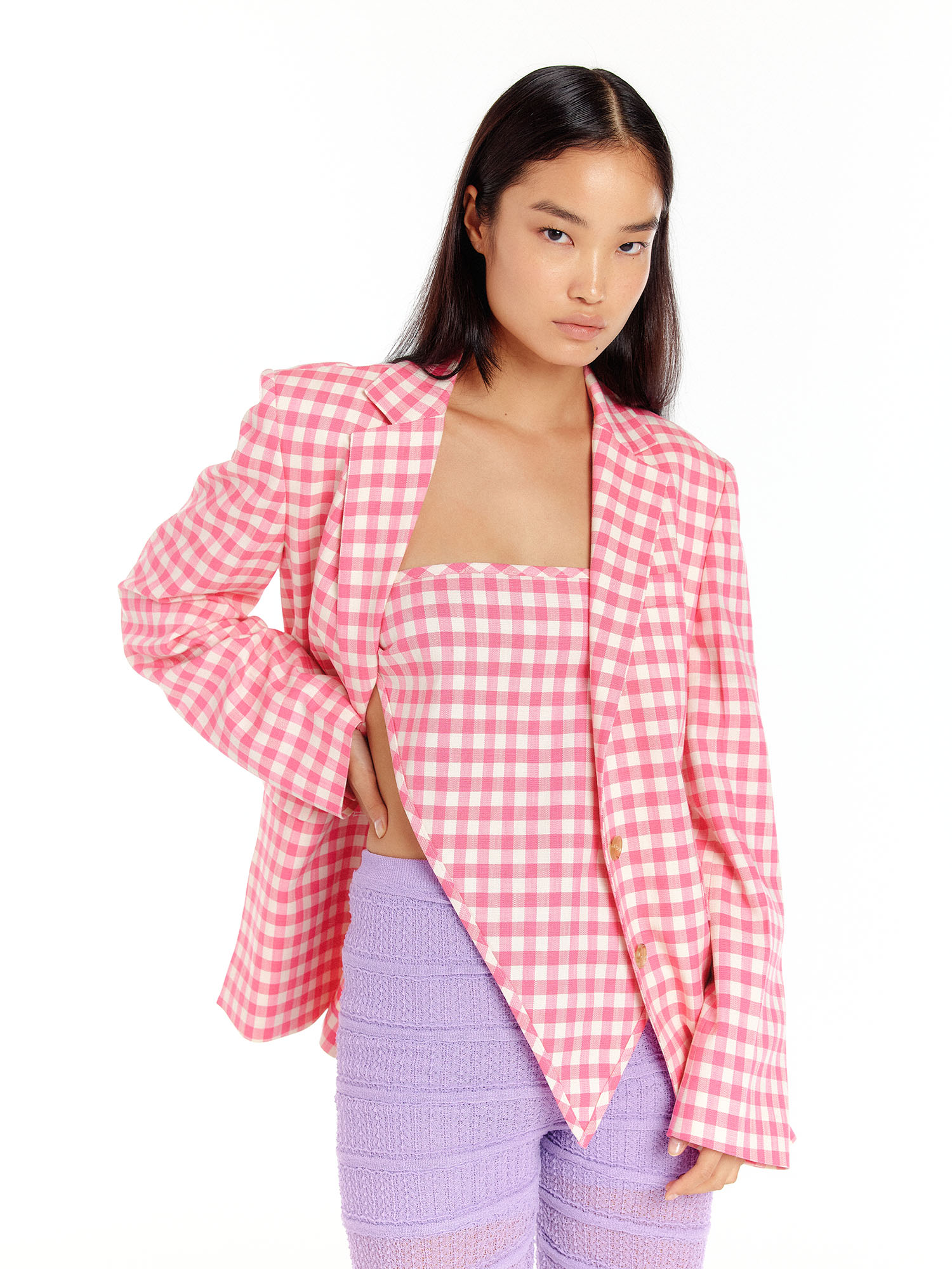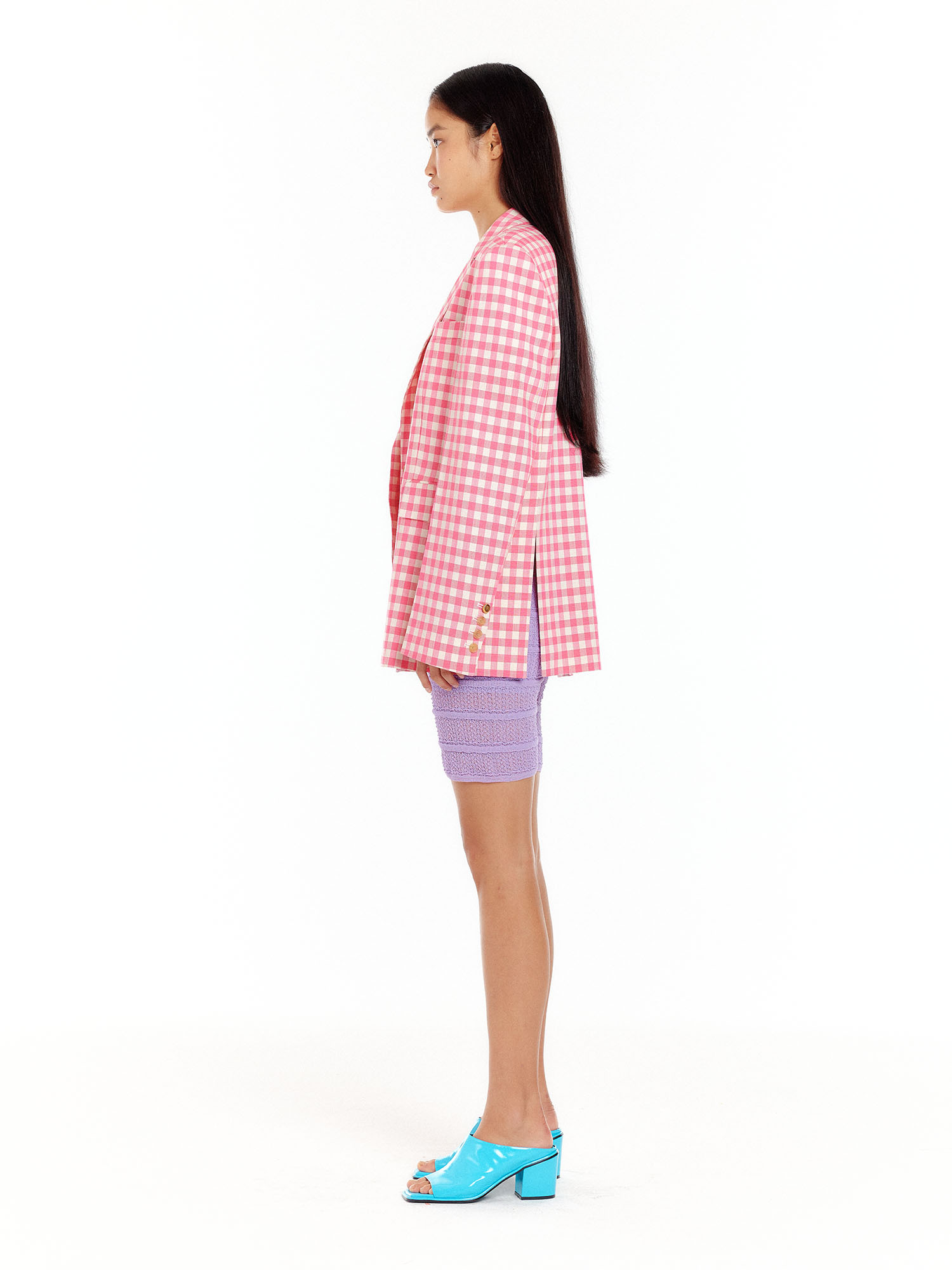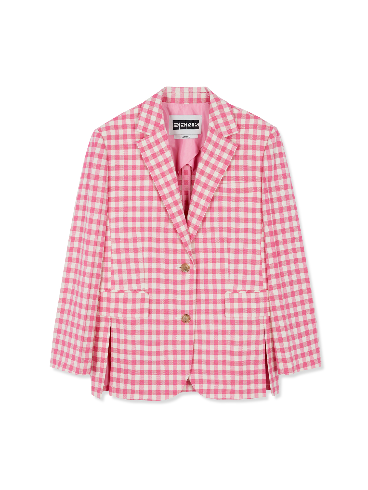 - 채도 높은 핑크 컬러의 체크 패턴이 포인트가 됩니다.