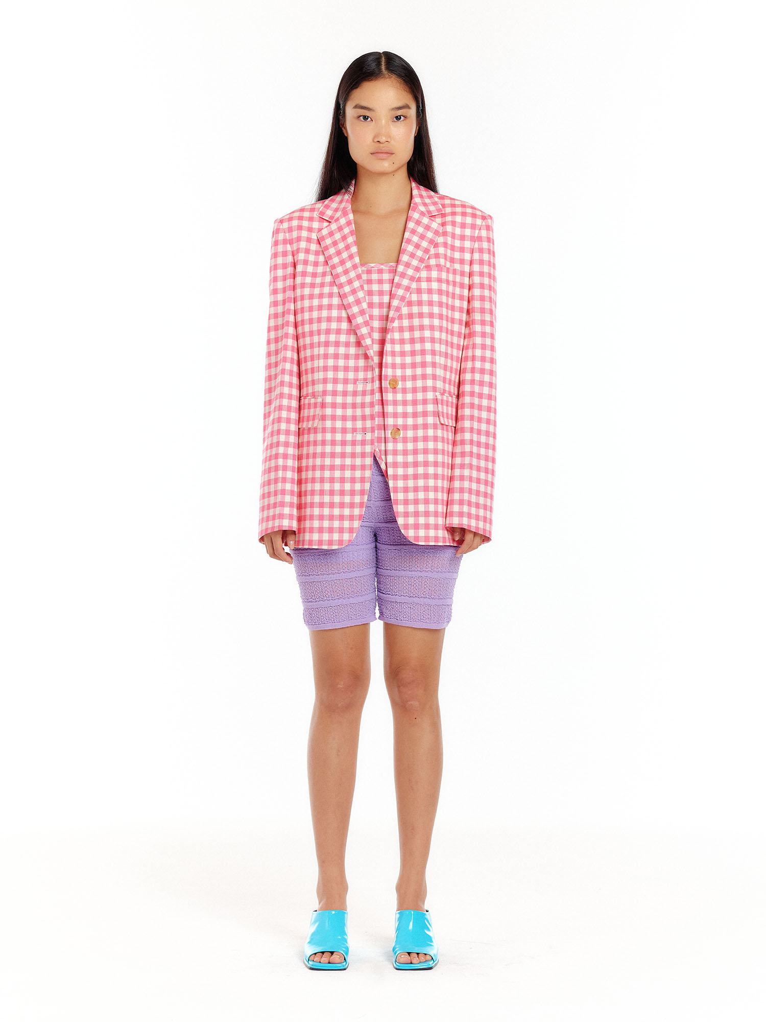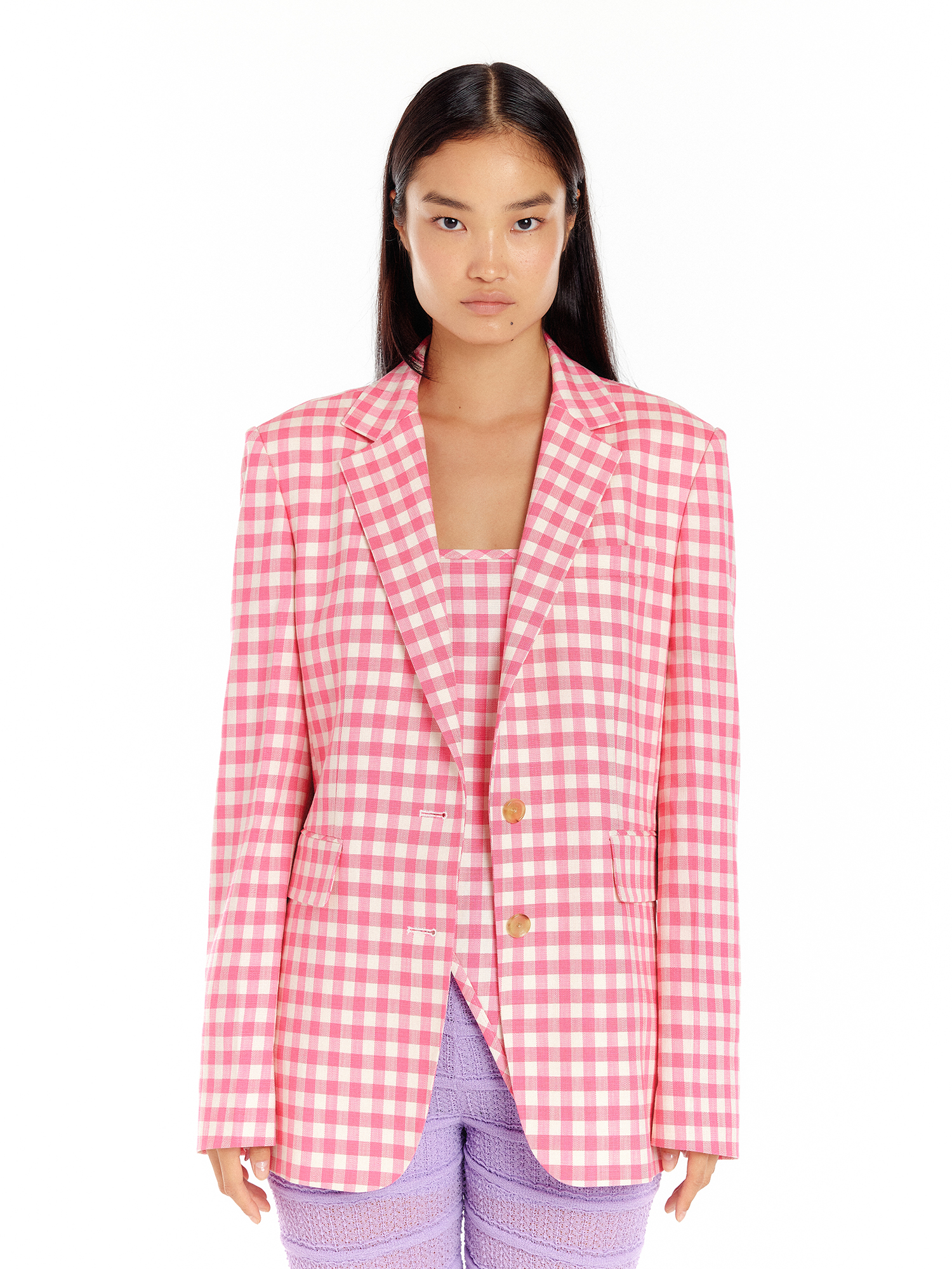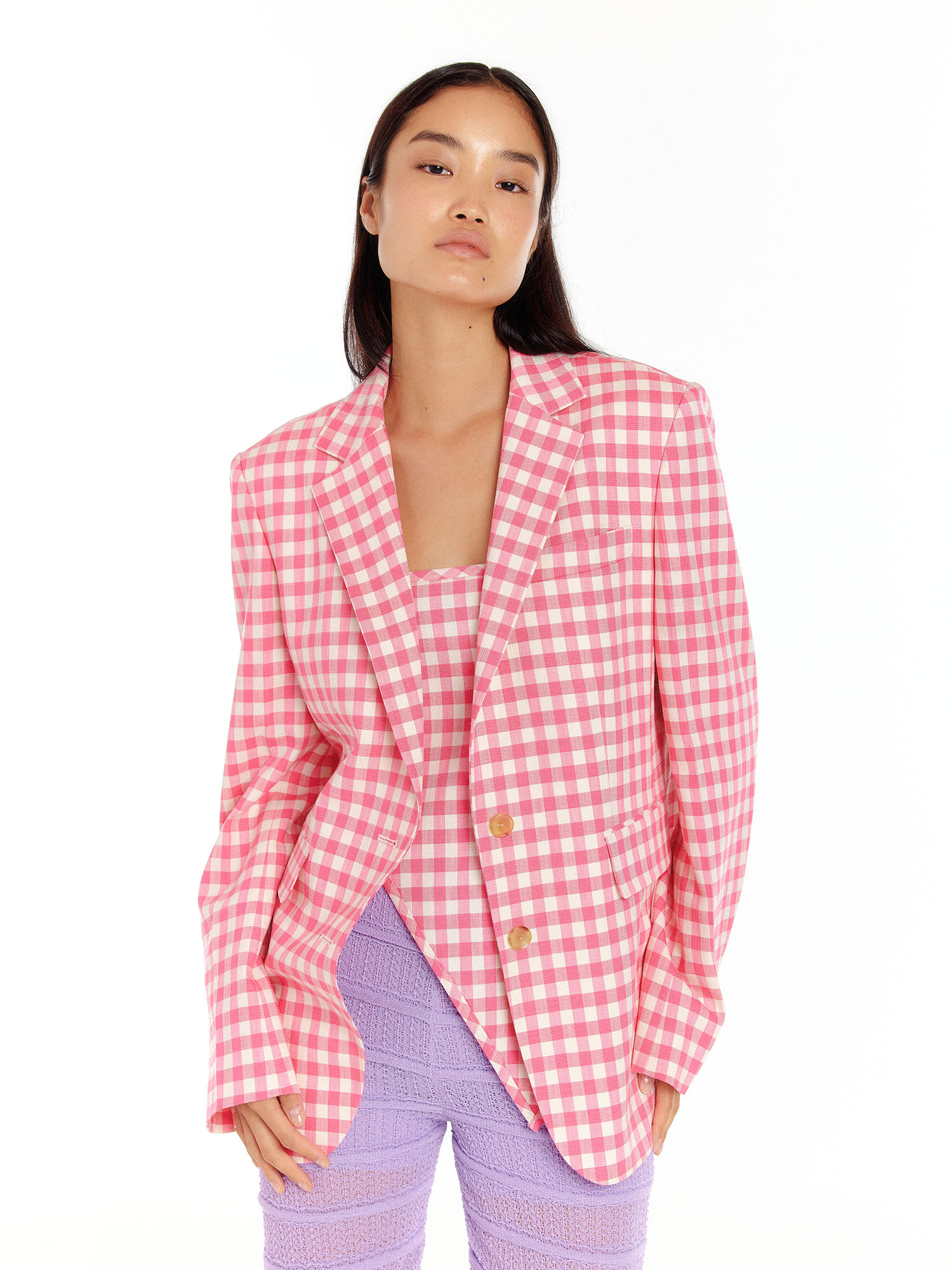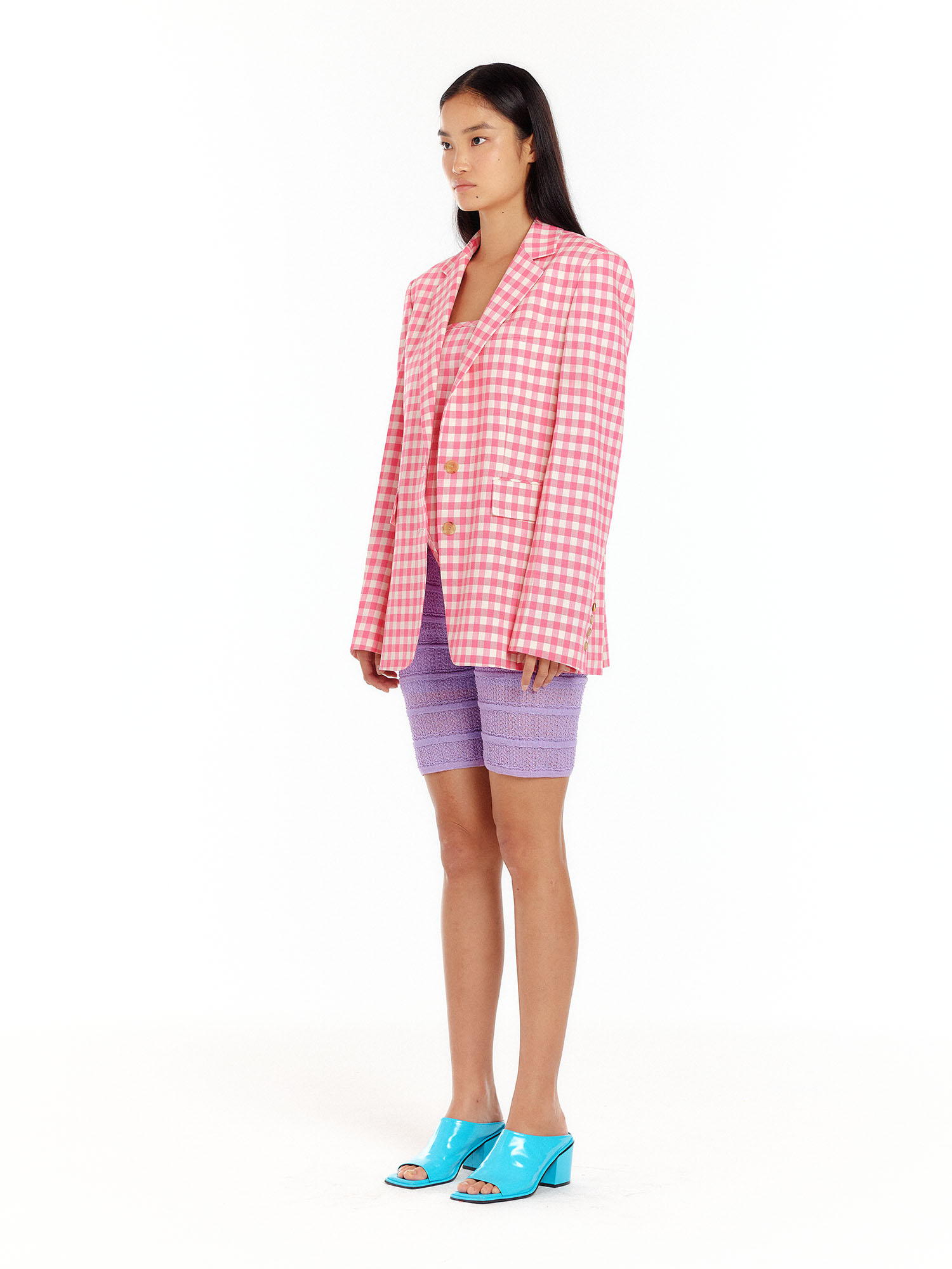 - 채도 높은 핑크 컬러의 체크 패턴이 포인트가 됩니다.
