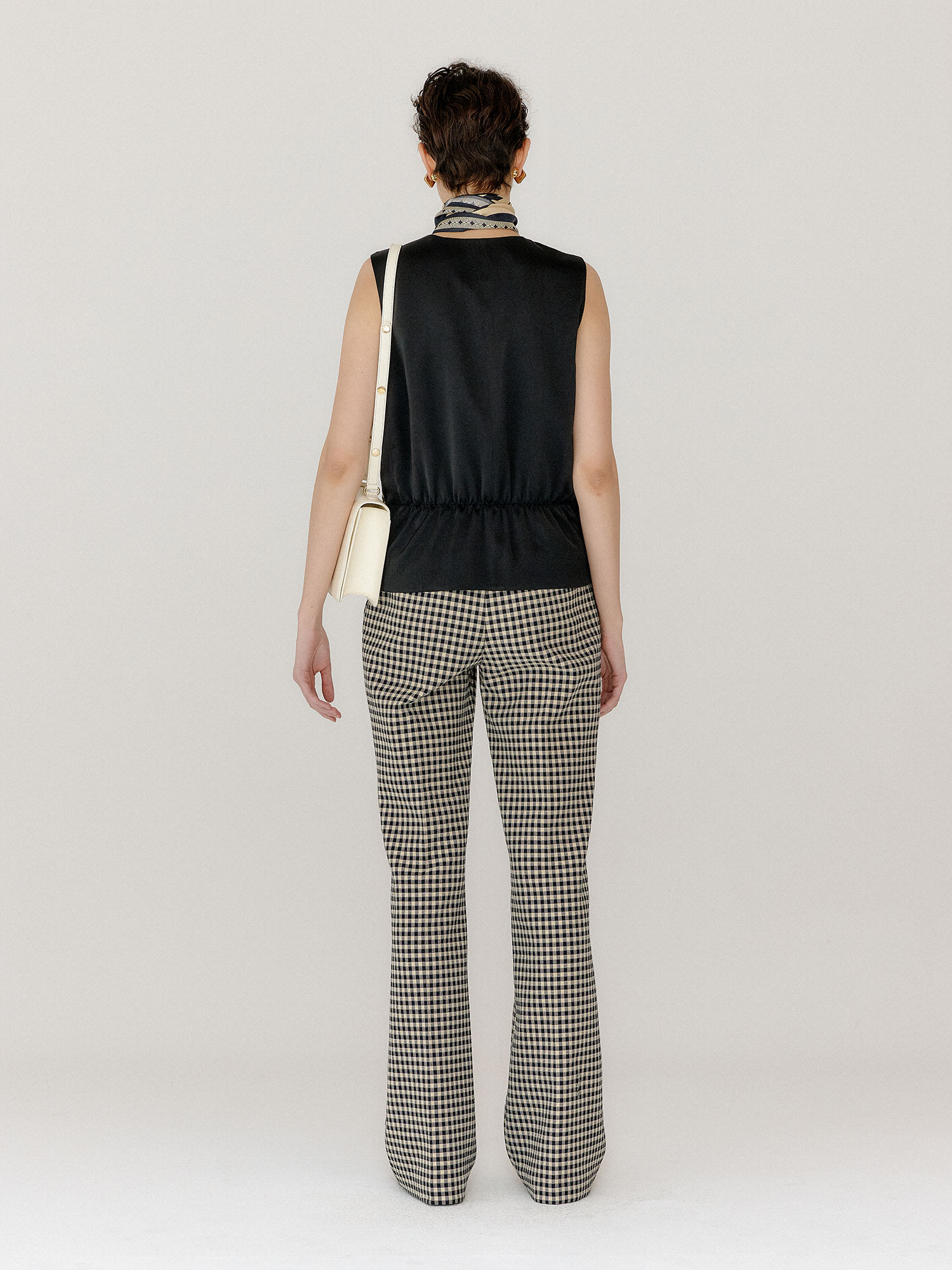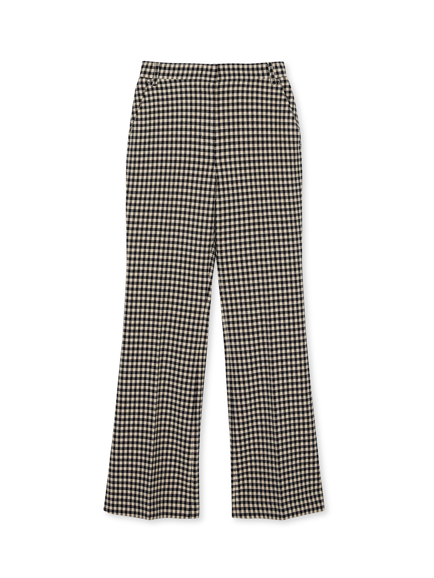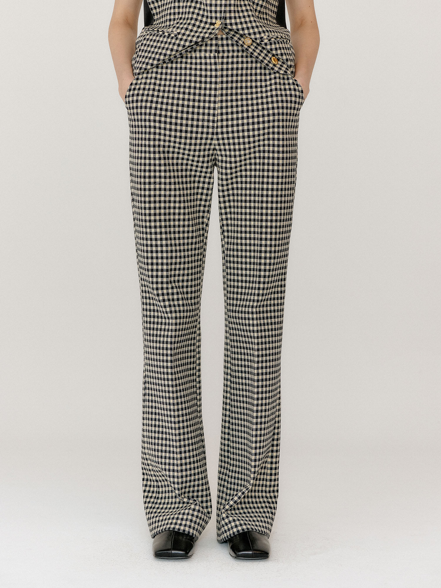 - 체크 패턴의 플레어 팬츠입니다.