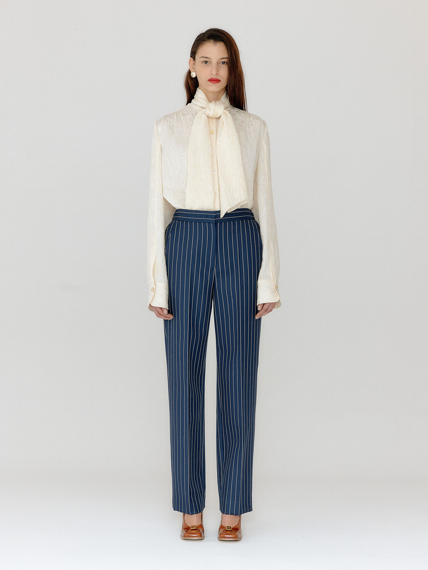 - 스트라이프 패턴의 스트레이트 팬츠입니다.