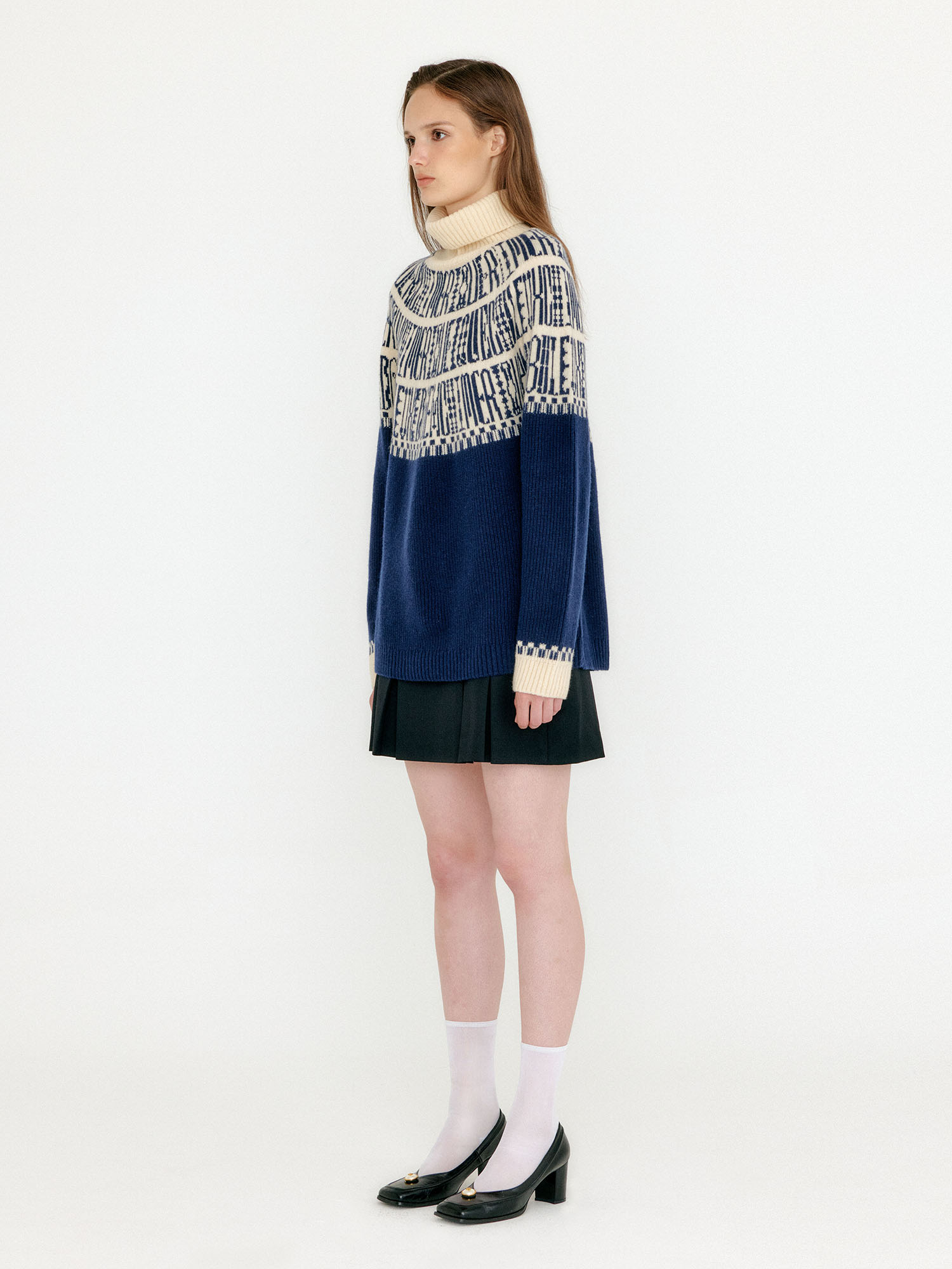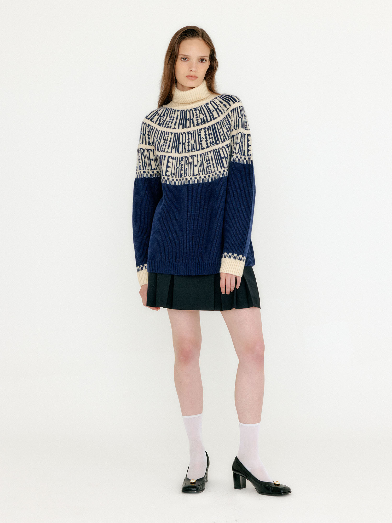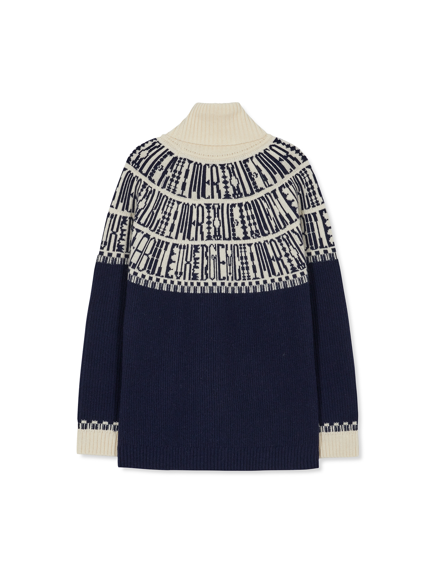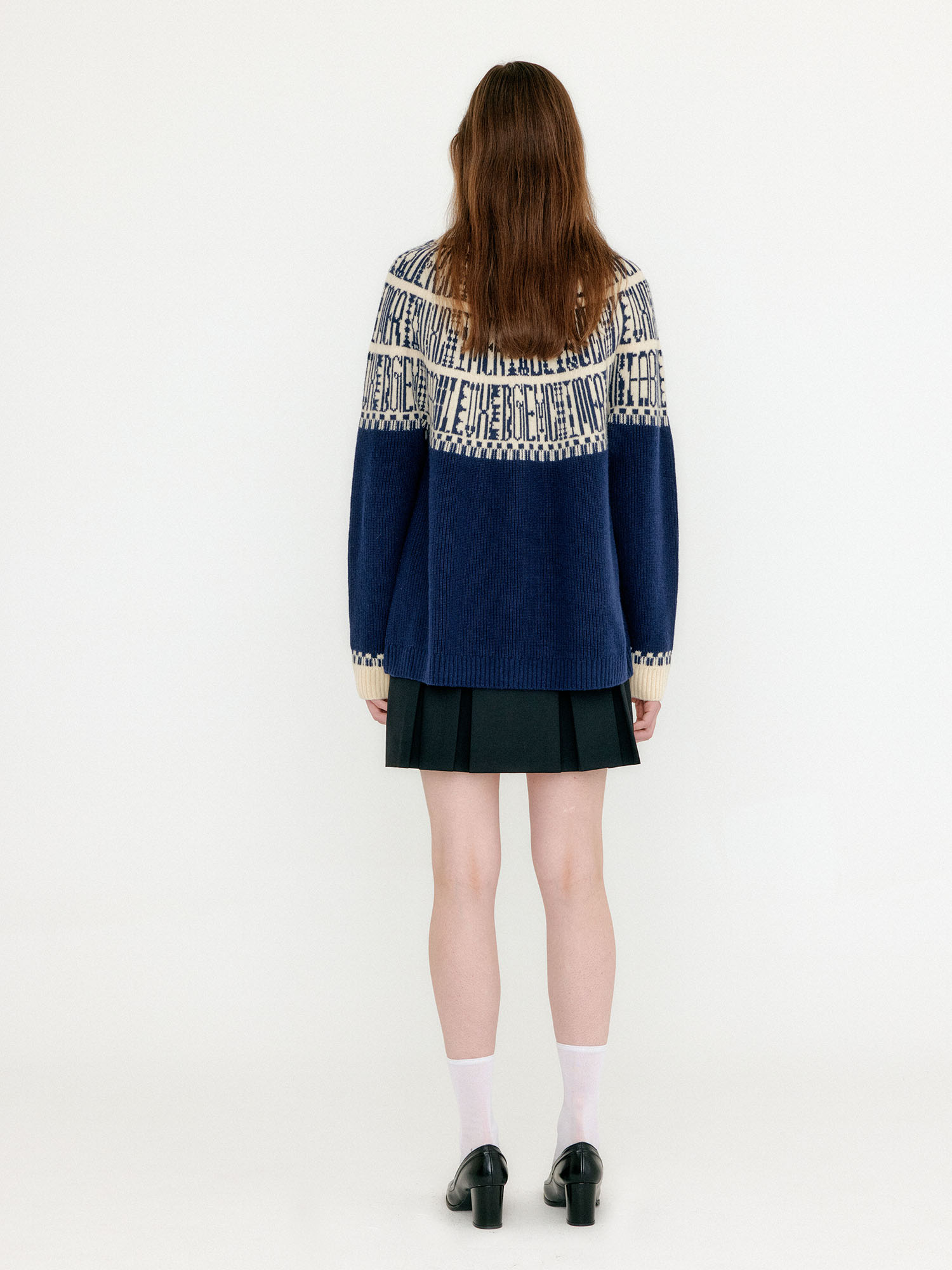 VIBBLE Paneled Lettering Jacquard Pullover - Navy/Beige