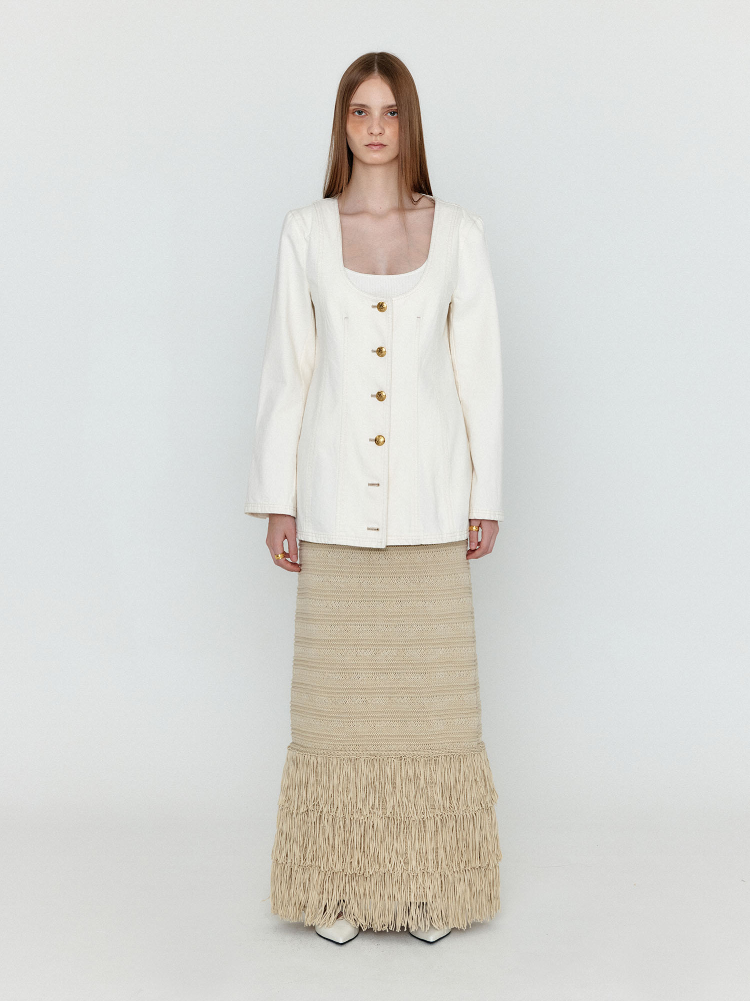- 앞판 다트로 허리라인을 강조한 실루엣입니다.