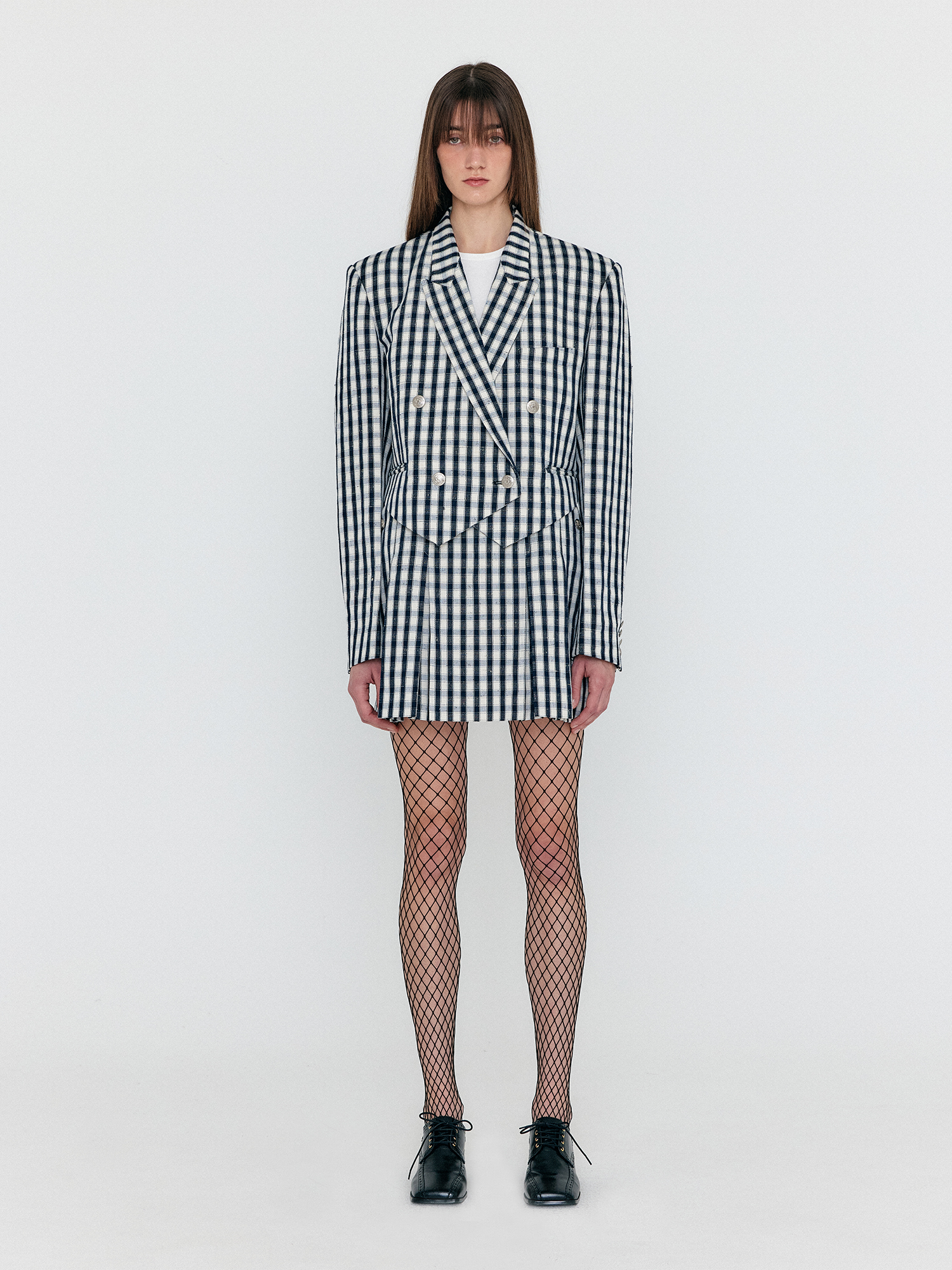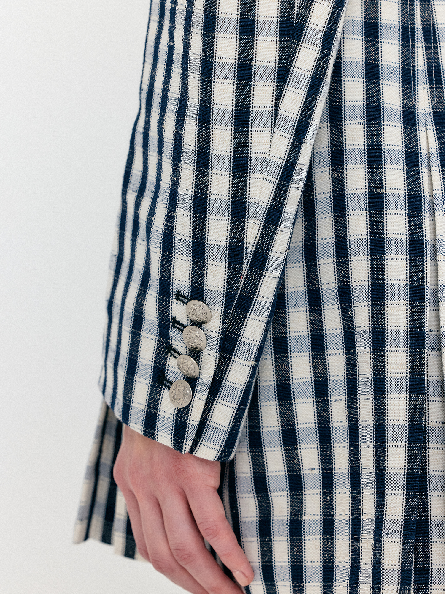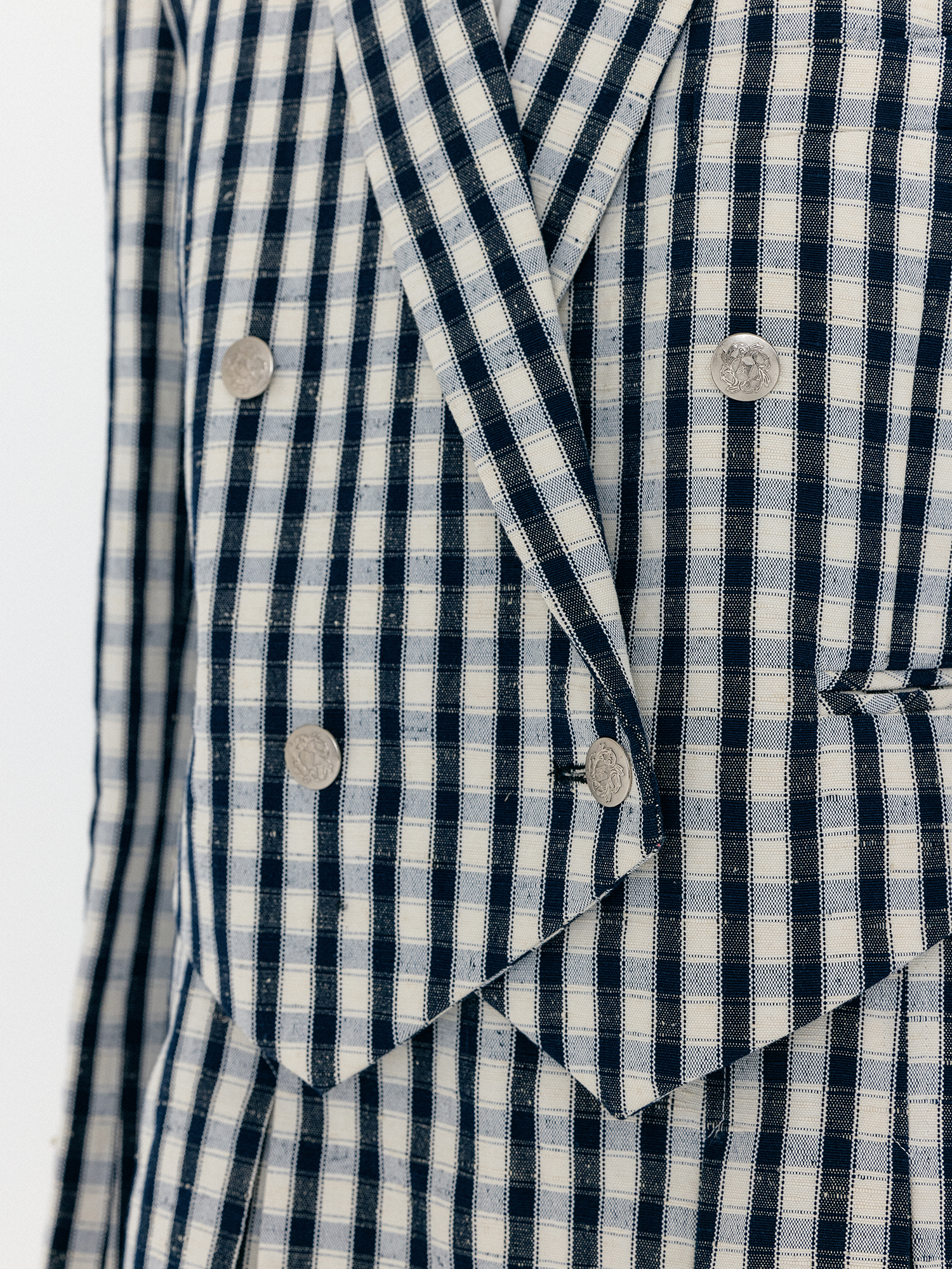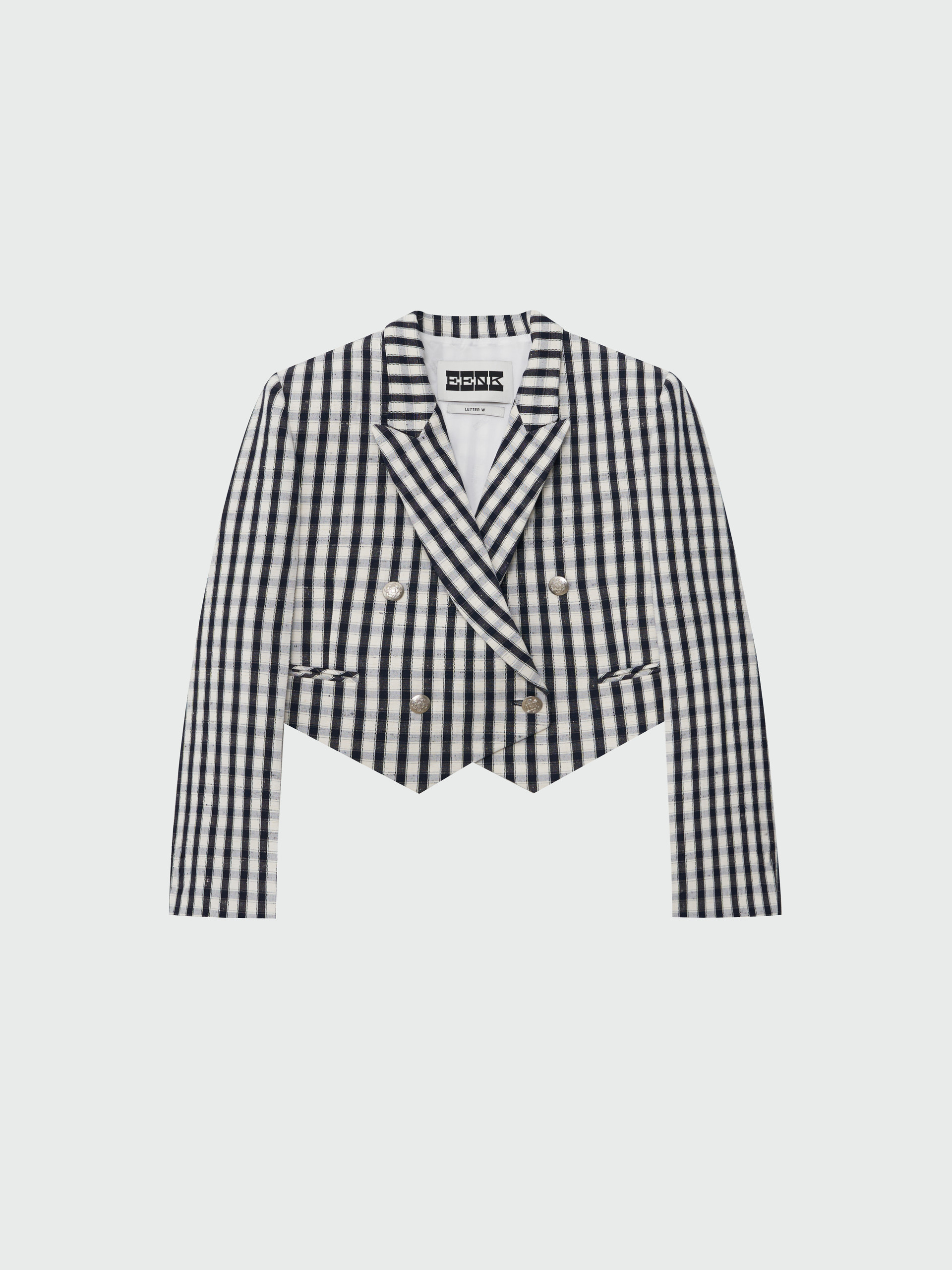 WEM Double-Breasted Short Blazer - Ivory/Navy Check