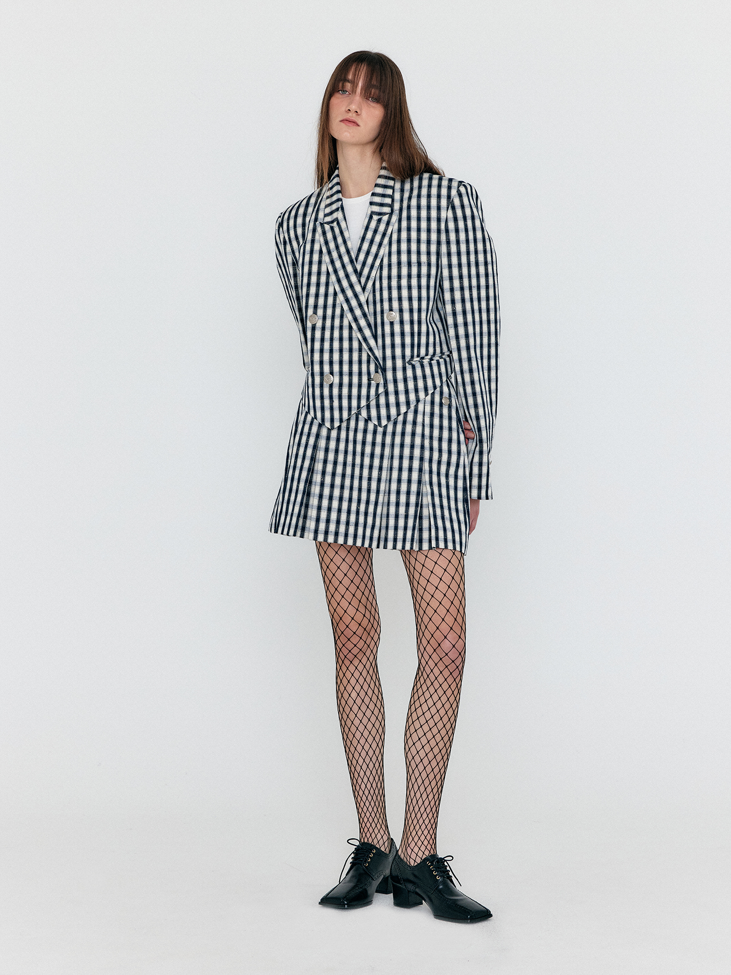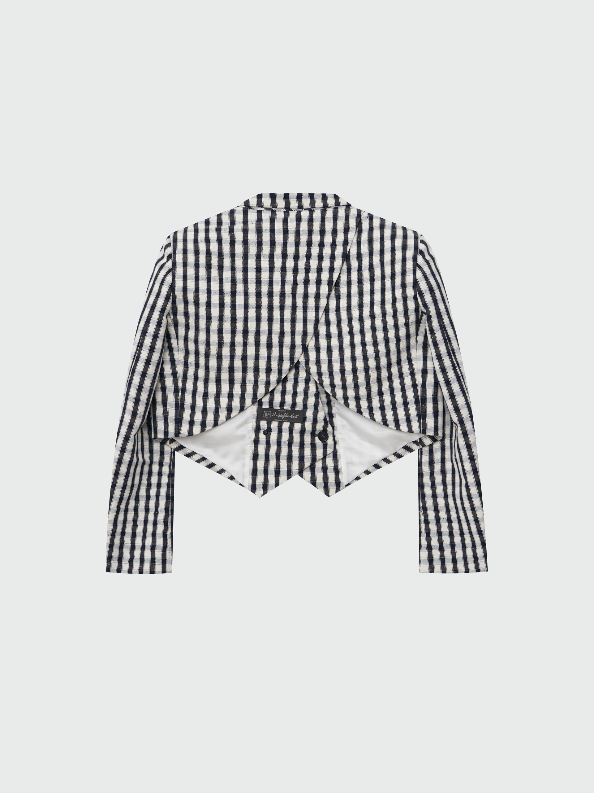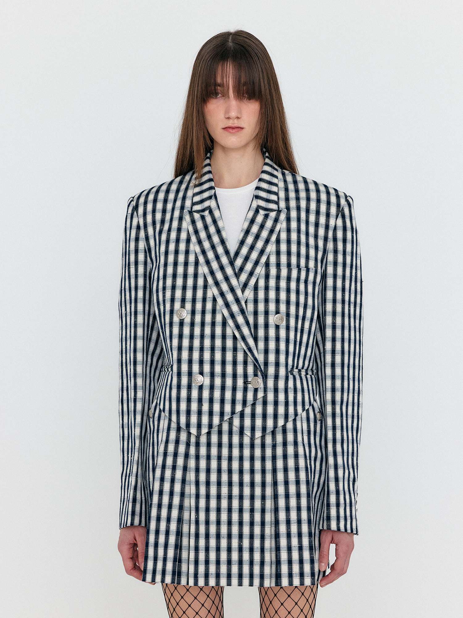 WEM Double-Breasted Short Blazer - Ivory/Navy Check