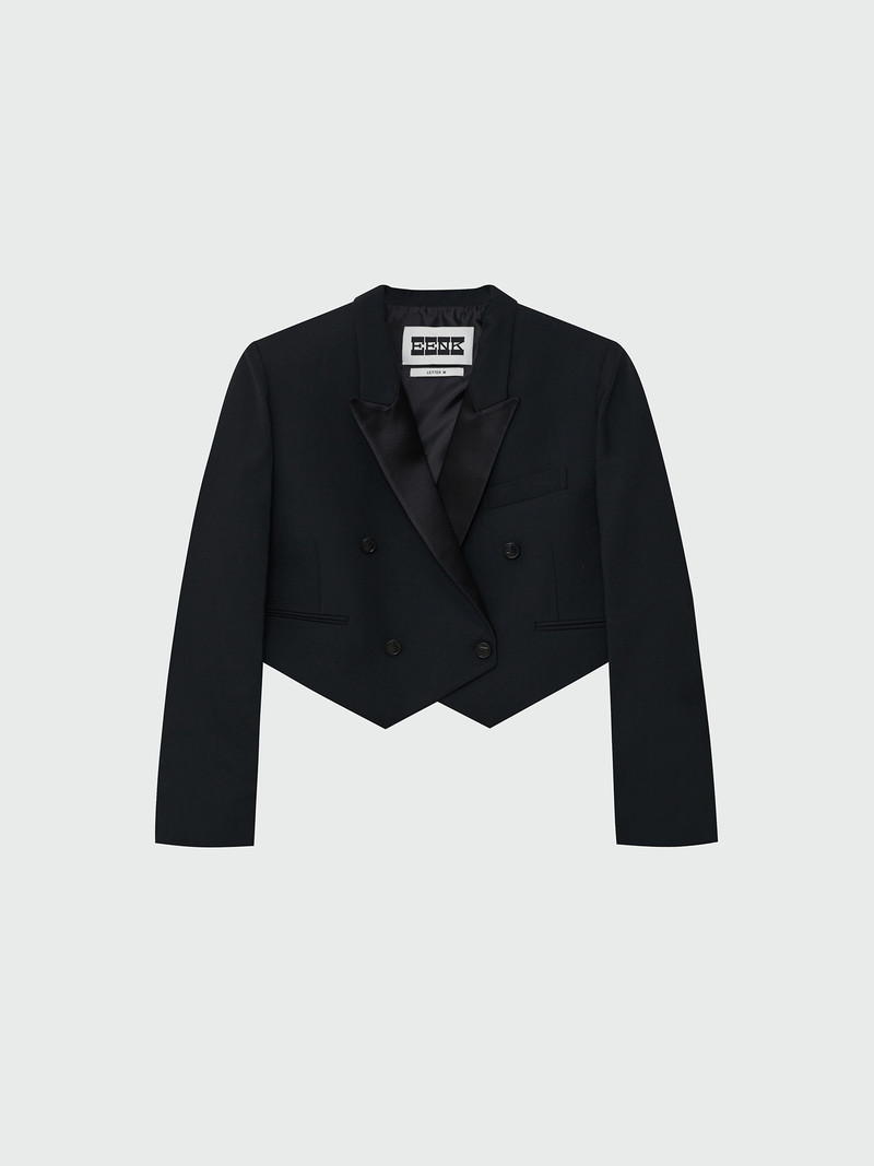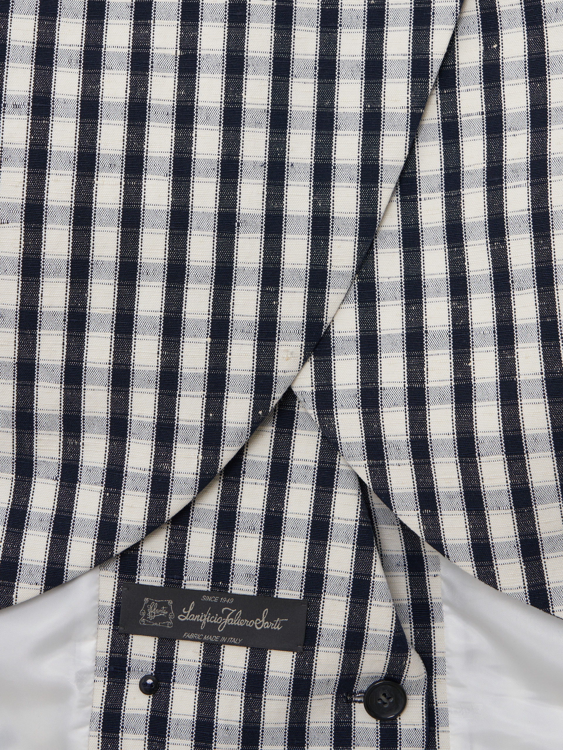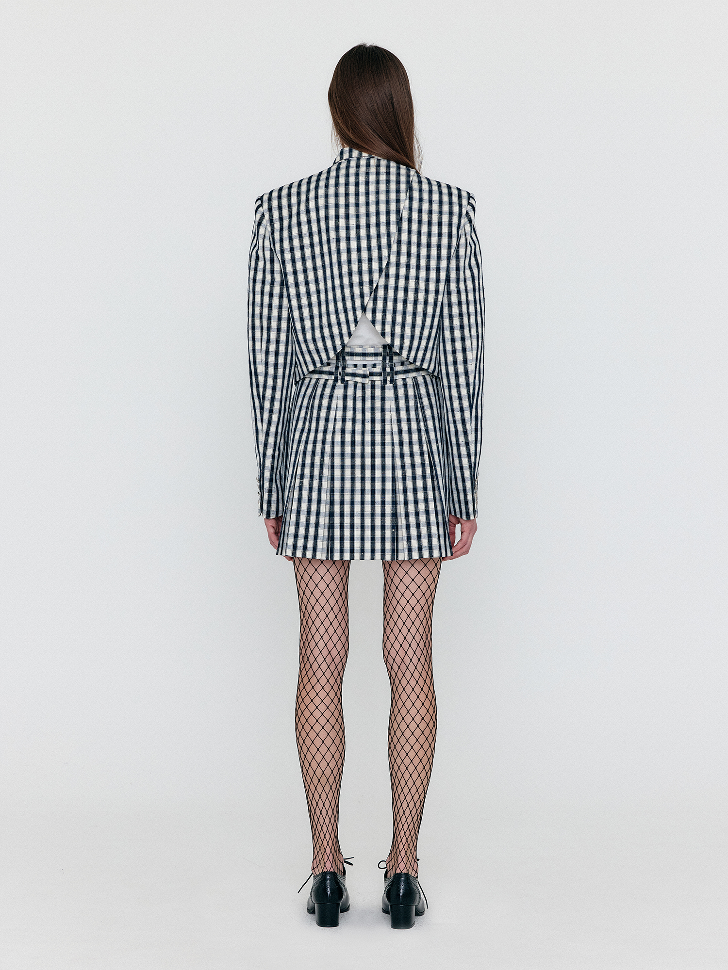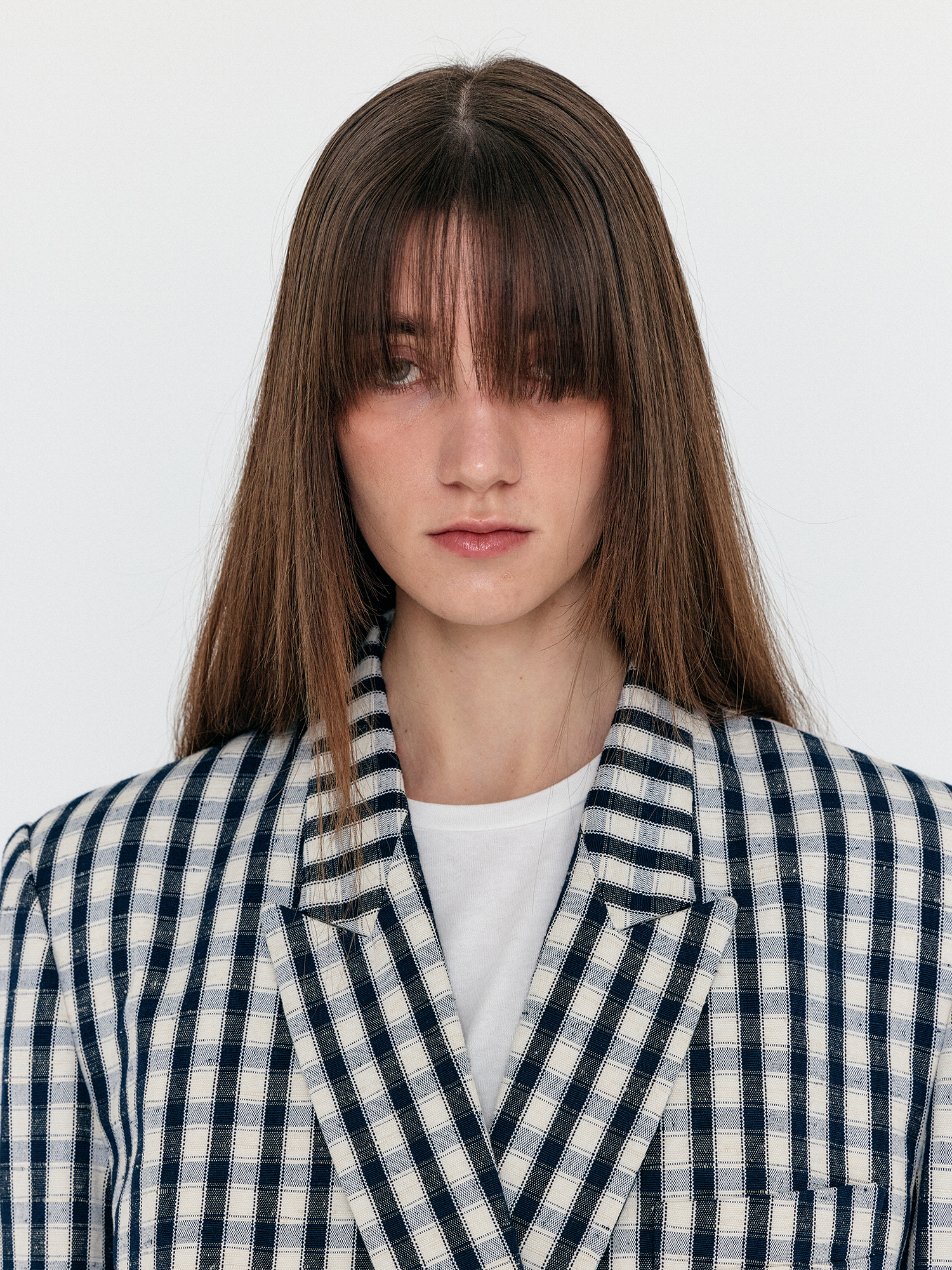WEM Double-Breasted Short Blazer - Ivory/Navy Check