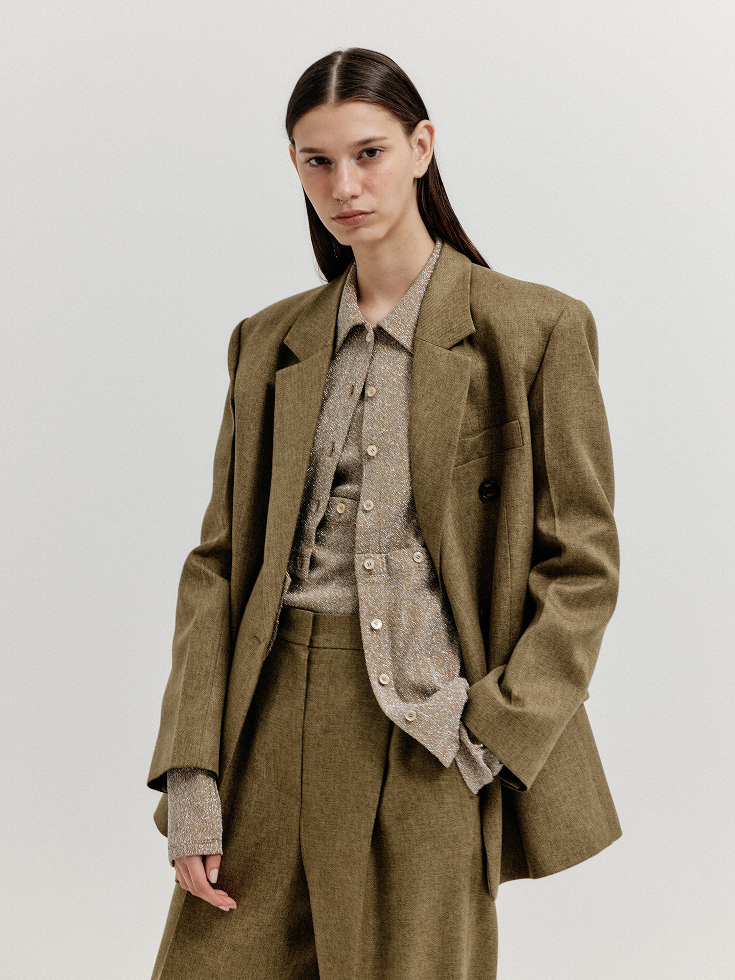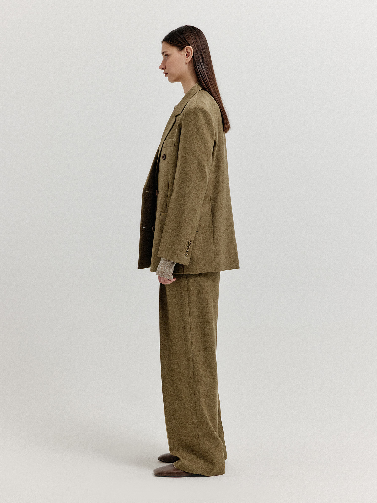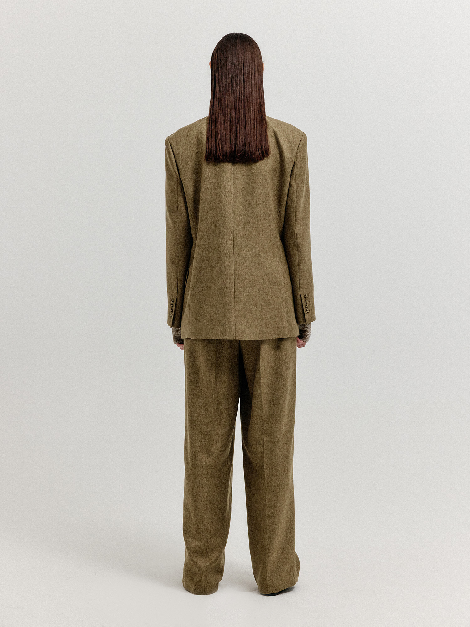 - 같은 소재의 클래식 팬츠와 셋업으로 연출할 수 있습니다.