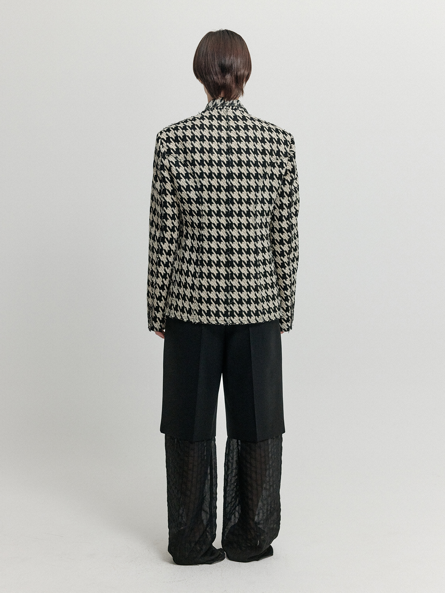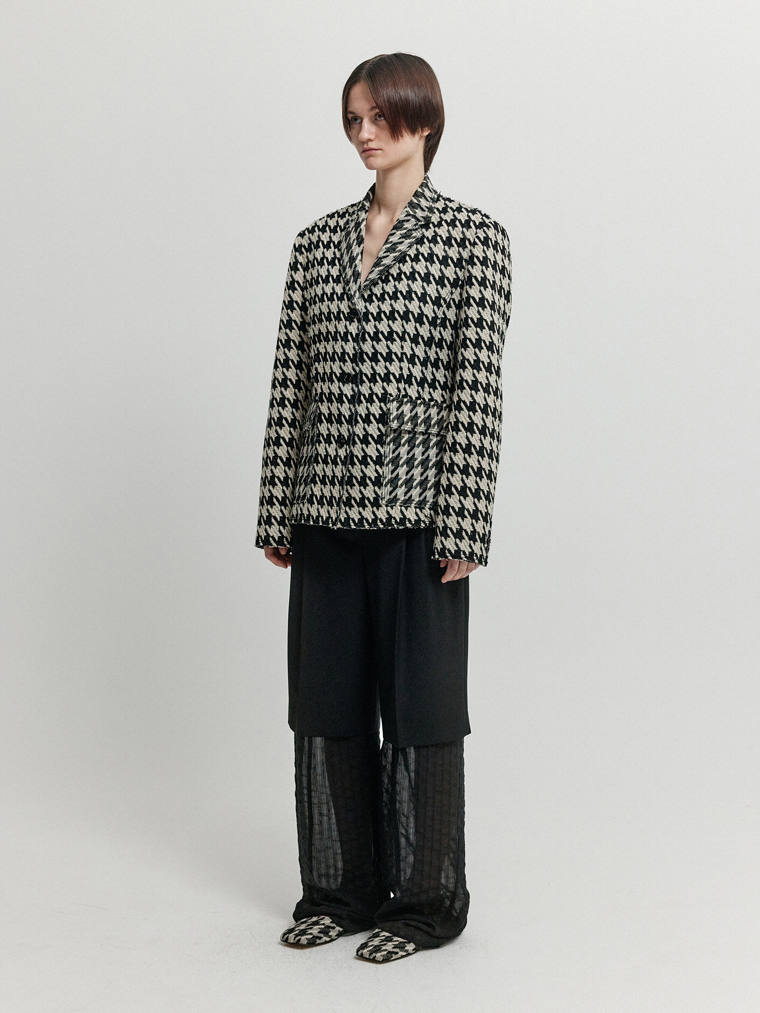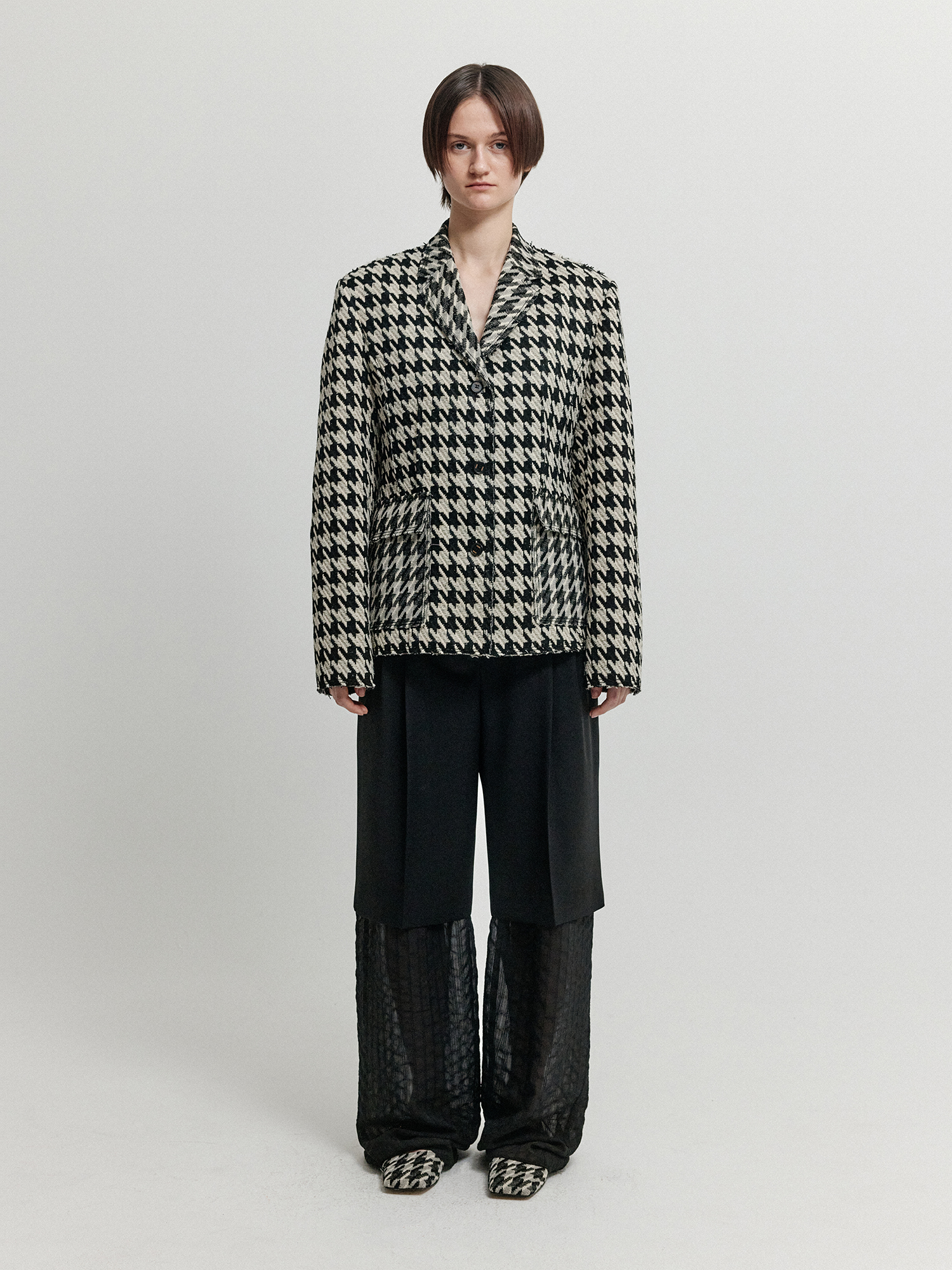 - 볼드한 하운드투스 패턴의 싱글 브레스티드 자켓입니다.