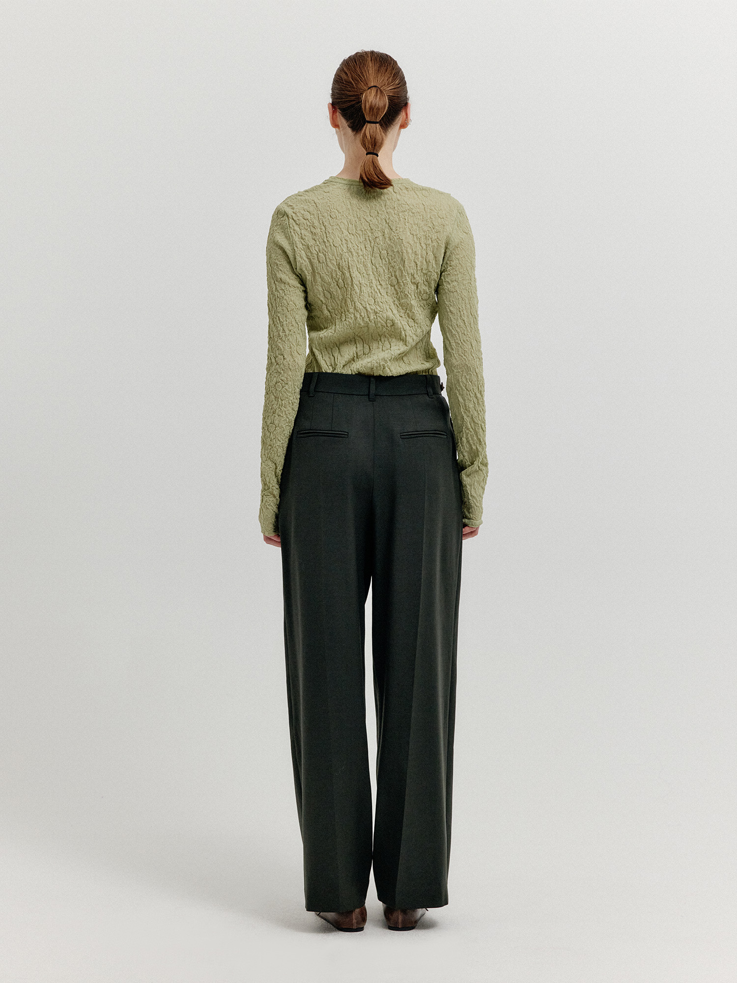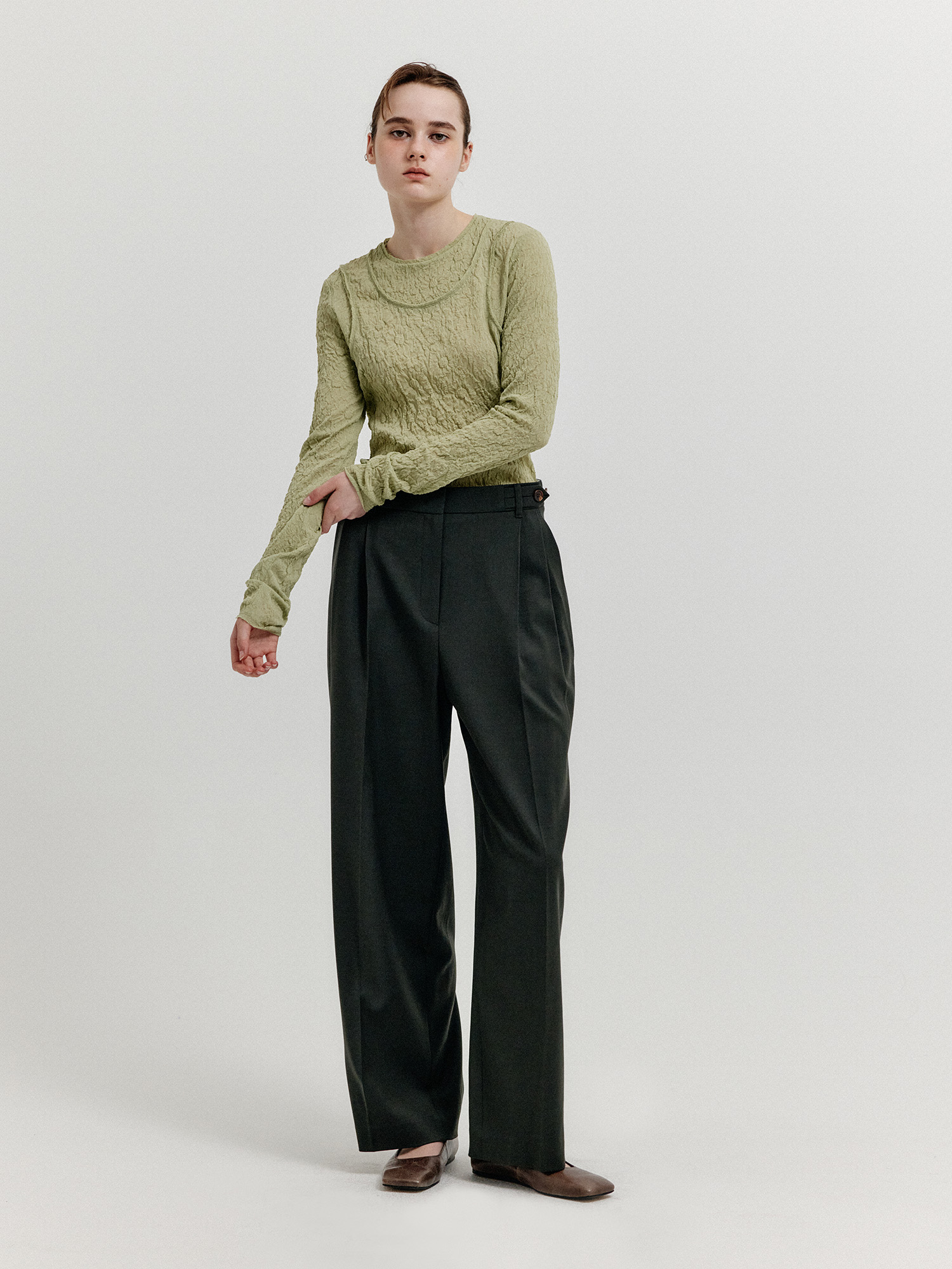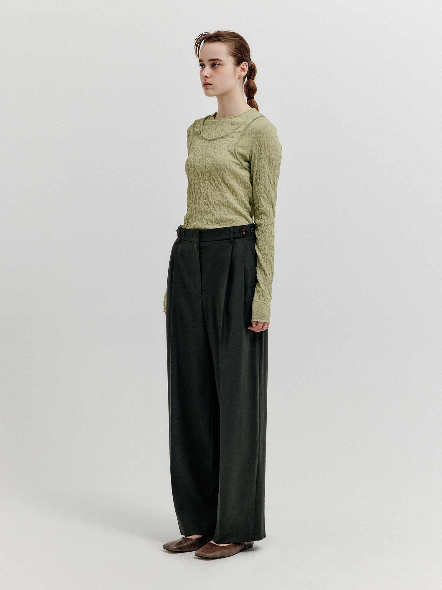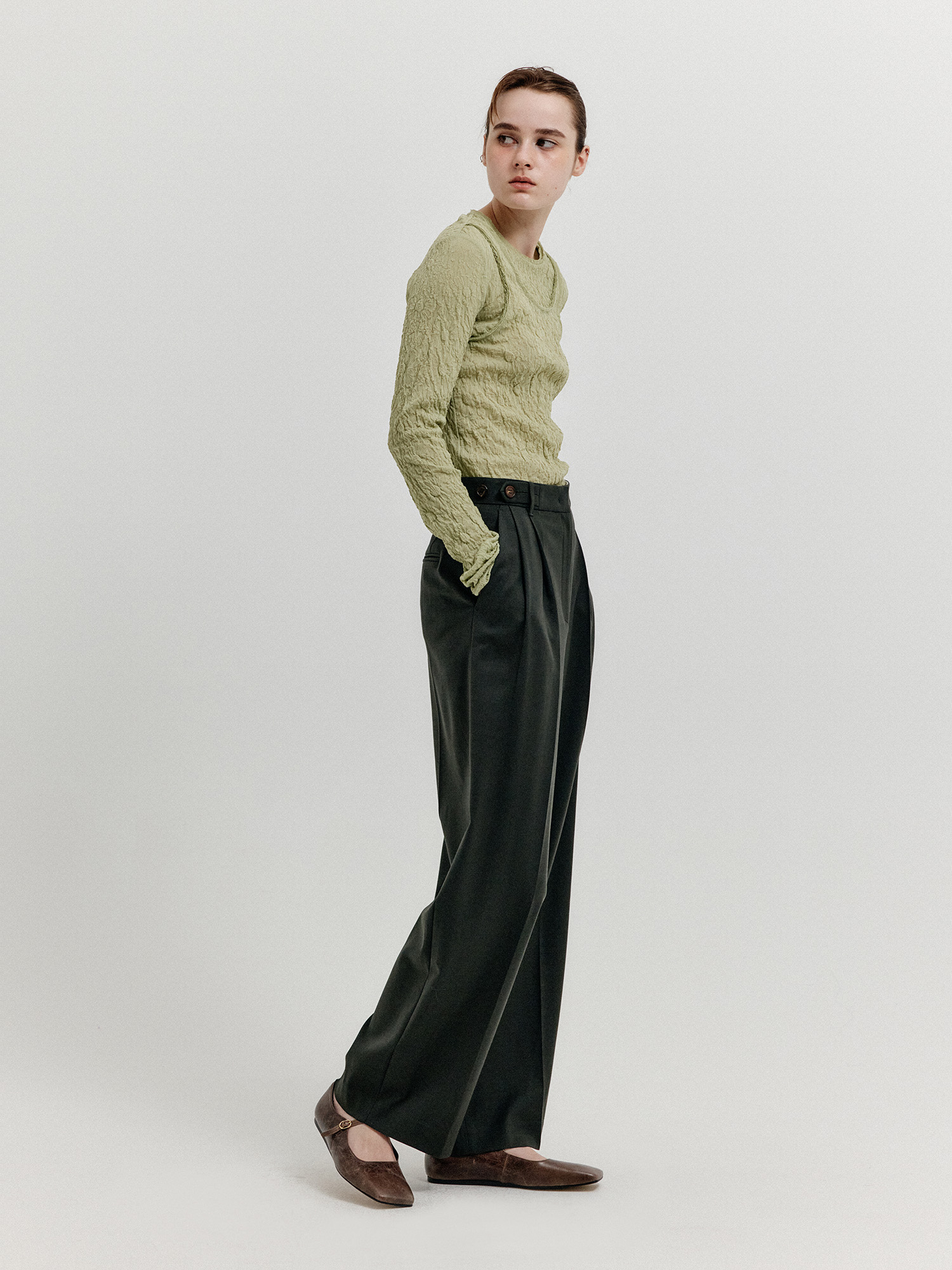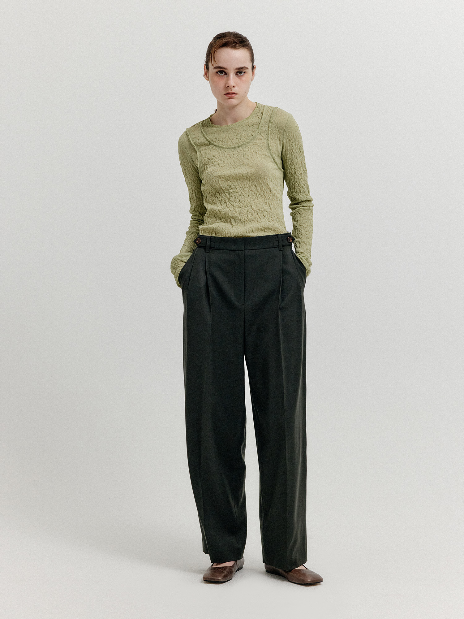 - 세미 와이드 핏의 투 턱 팬츠입니다.