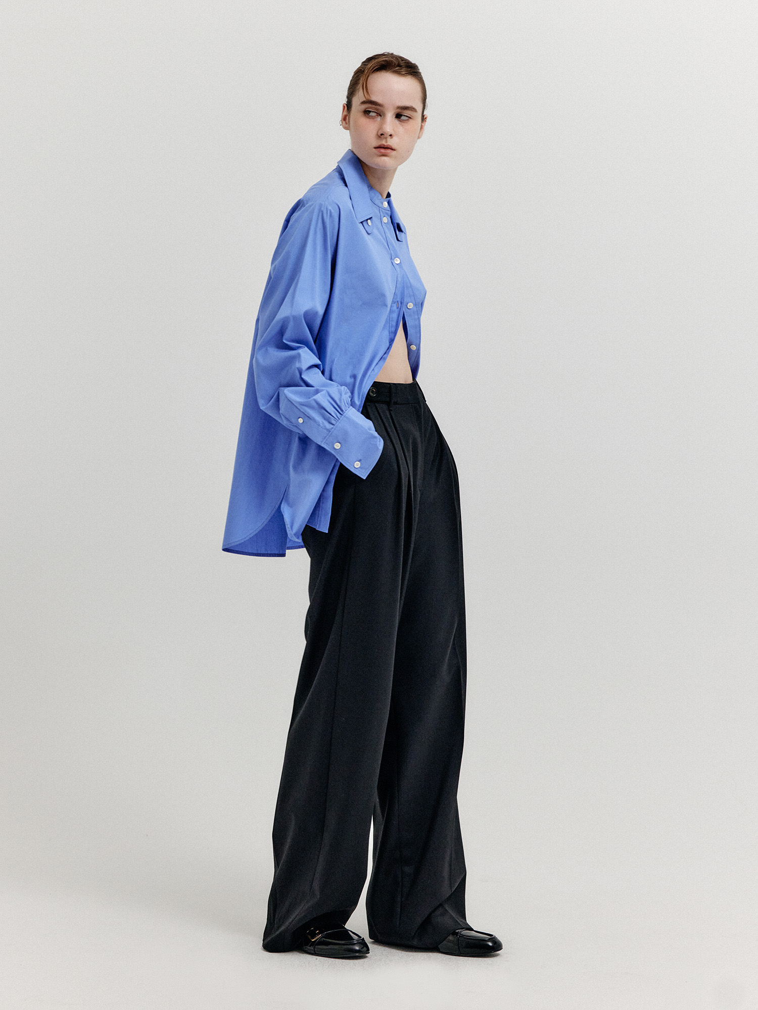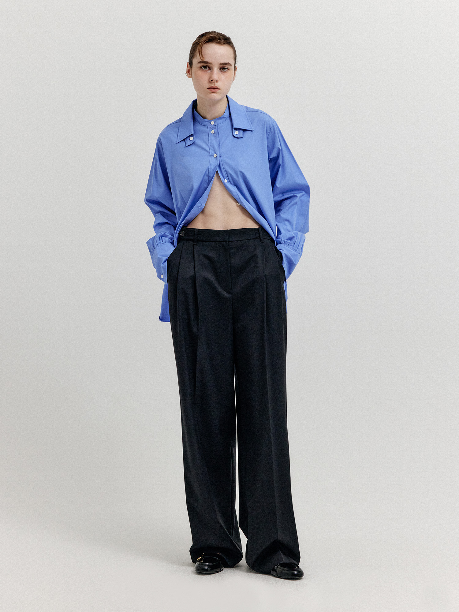 - 세미 와이드 핏의 투 턱 팬츠입니다.