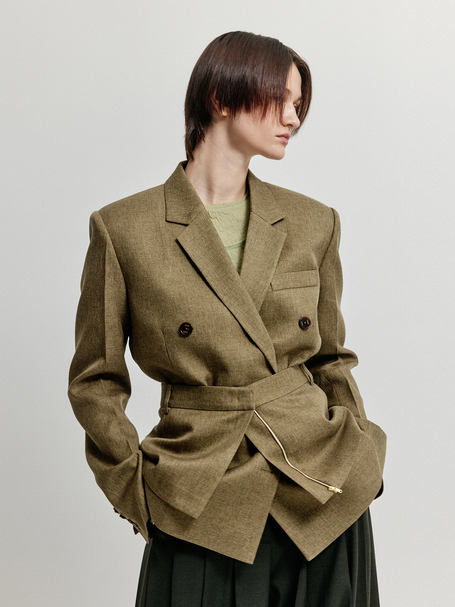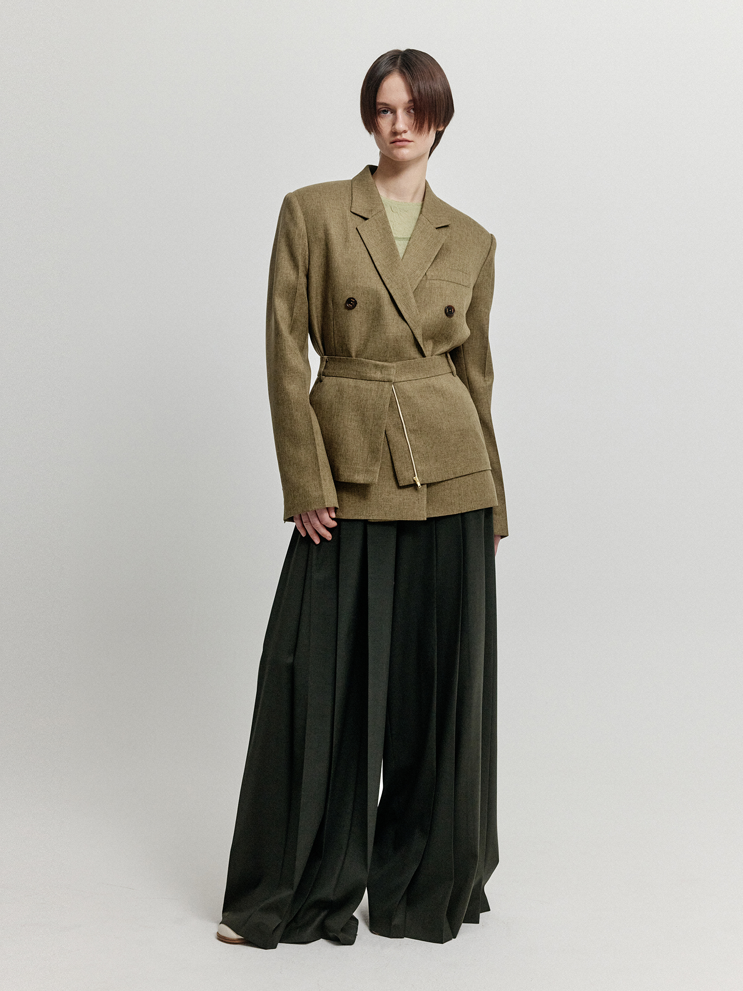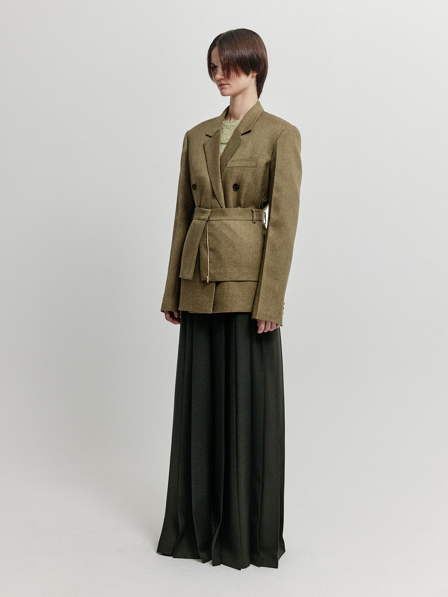 - 같은 소재의 자켓 또는 팬츠와 레이어드하여 연출하는 것을 추천합니다.