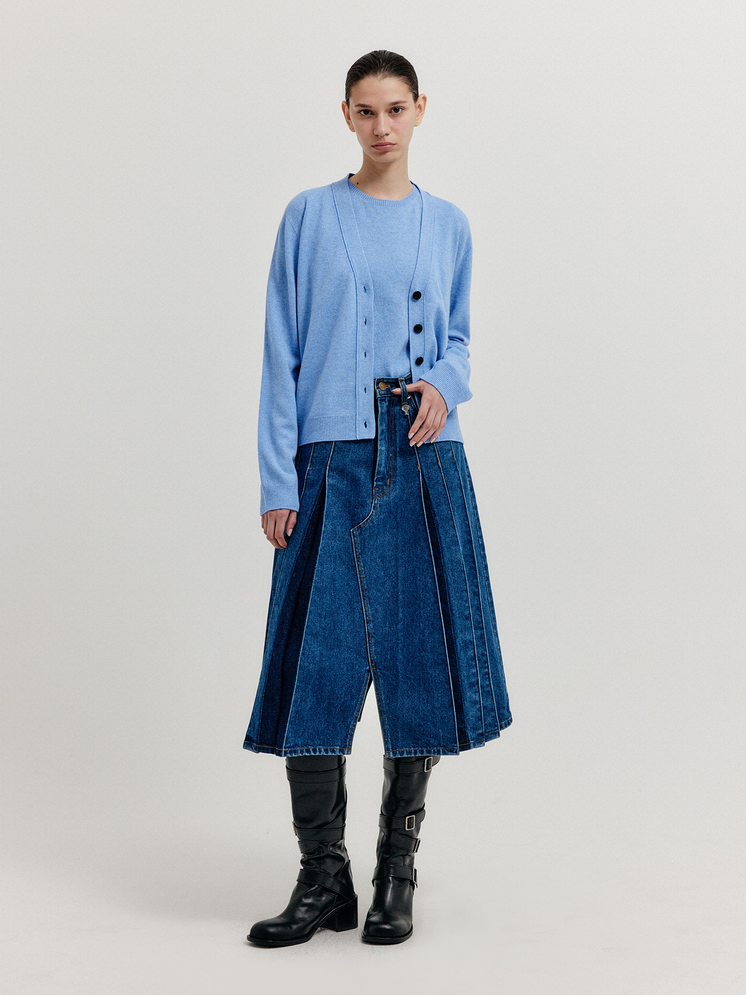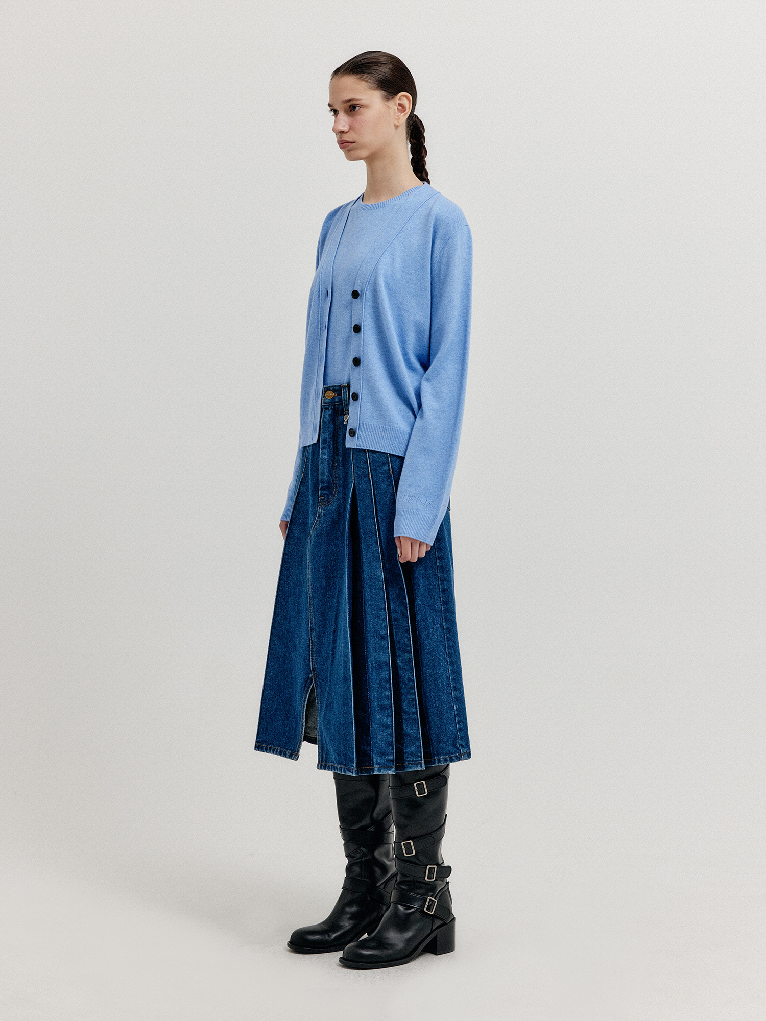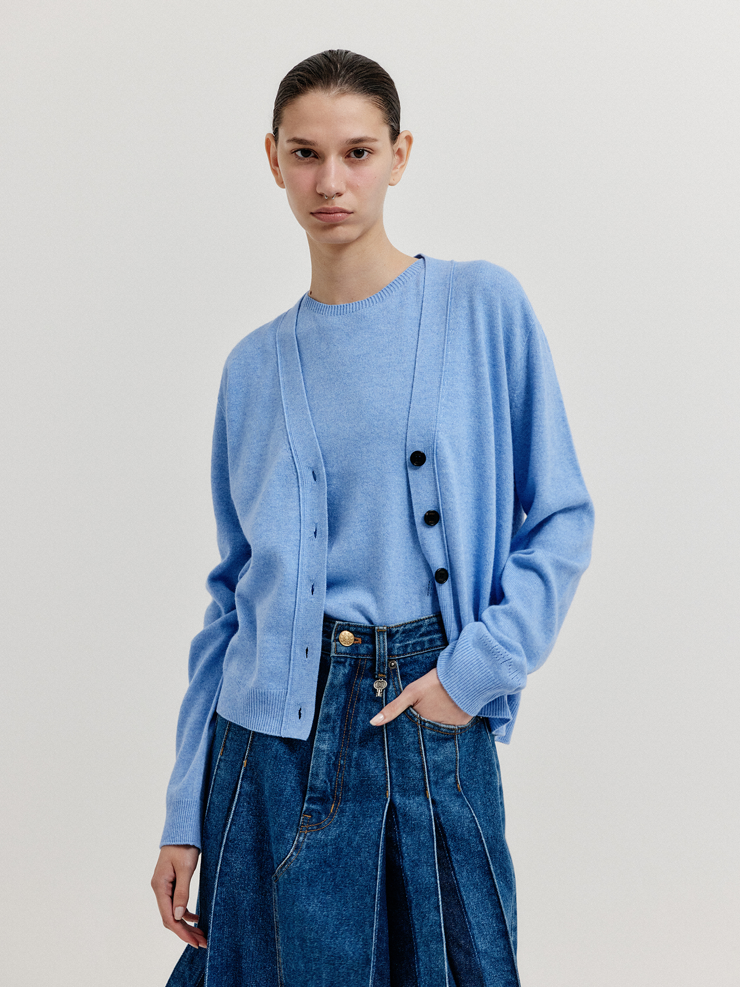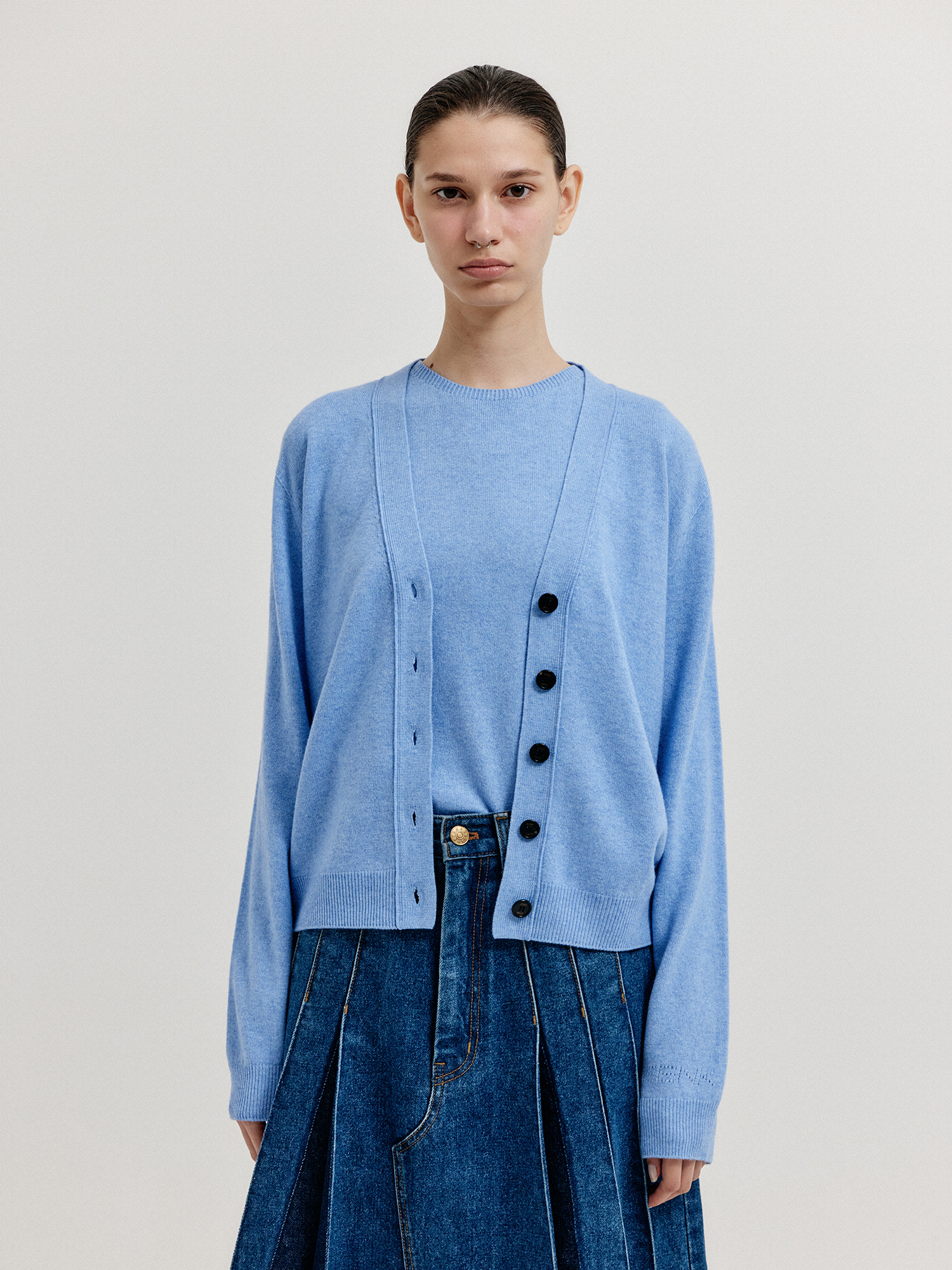 - 같은 소재의 니트 베스트와 셋업으로 연출할 수 있습니다.