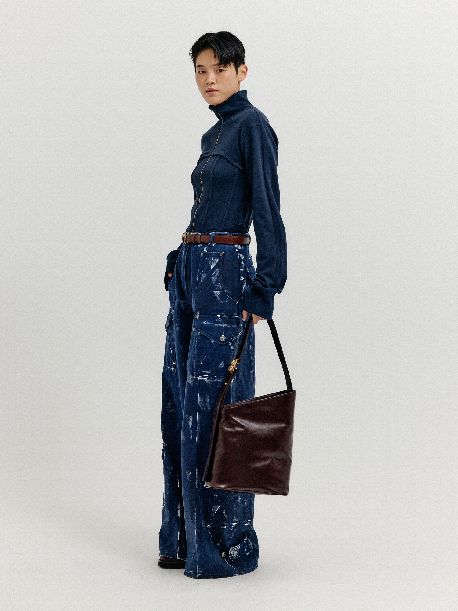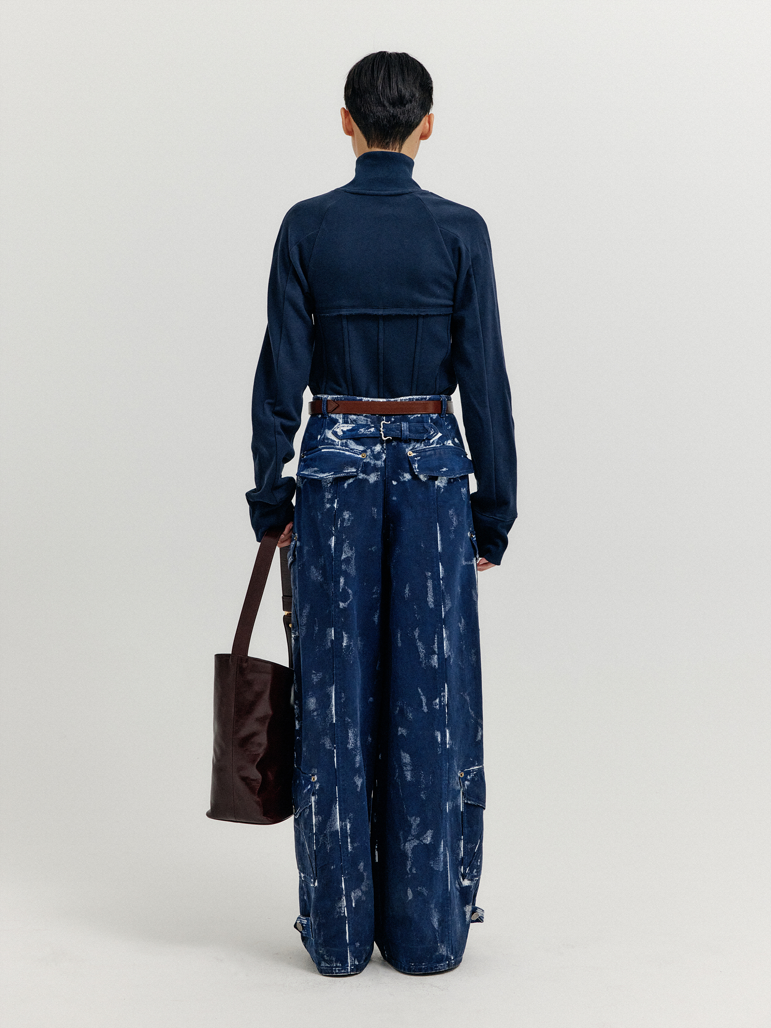 - 슬림한 허리 라인과 넉넉한 소매통이 대조되는 디자인입니다.