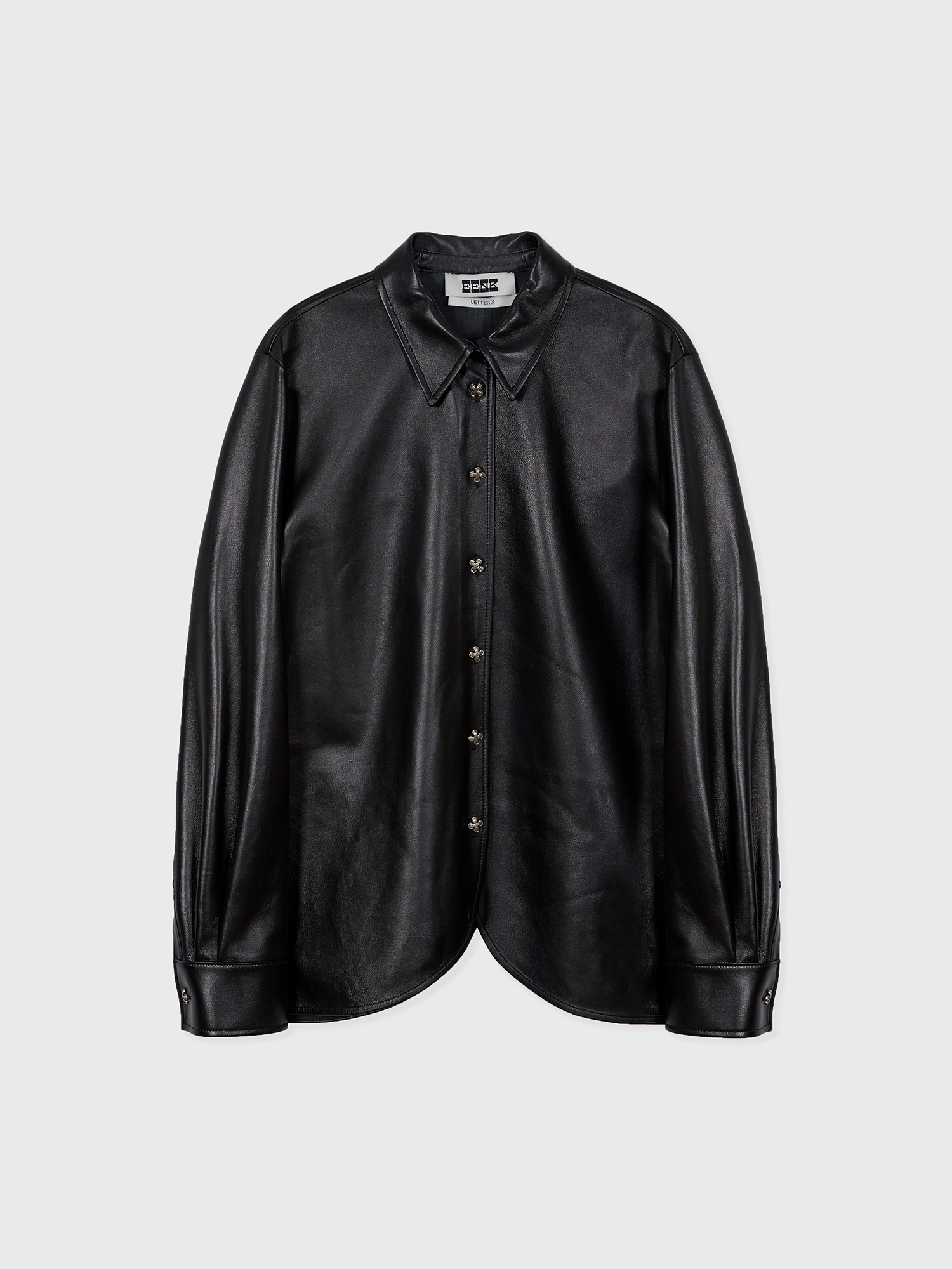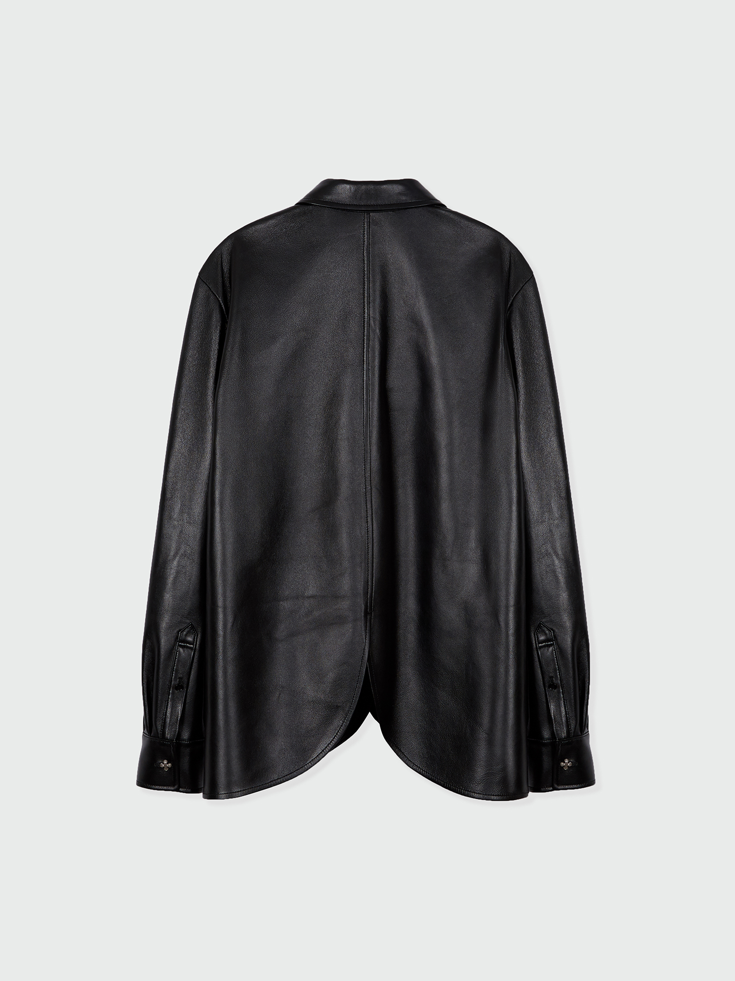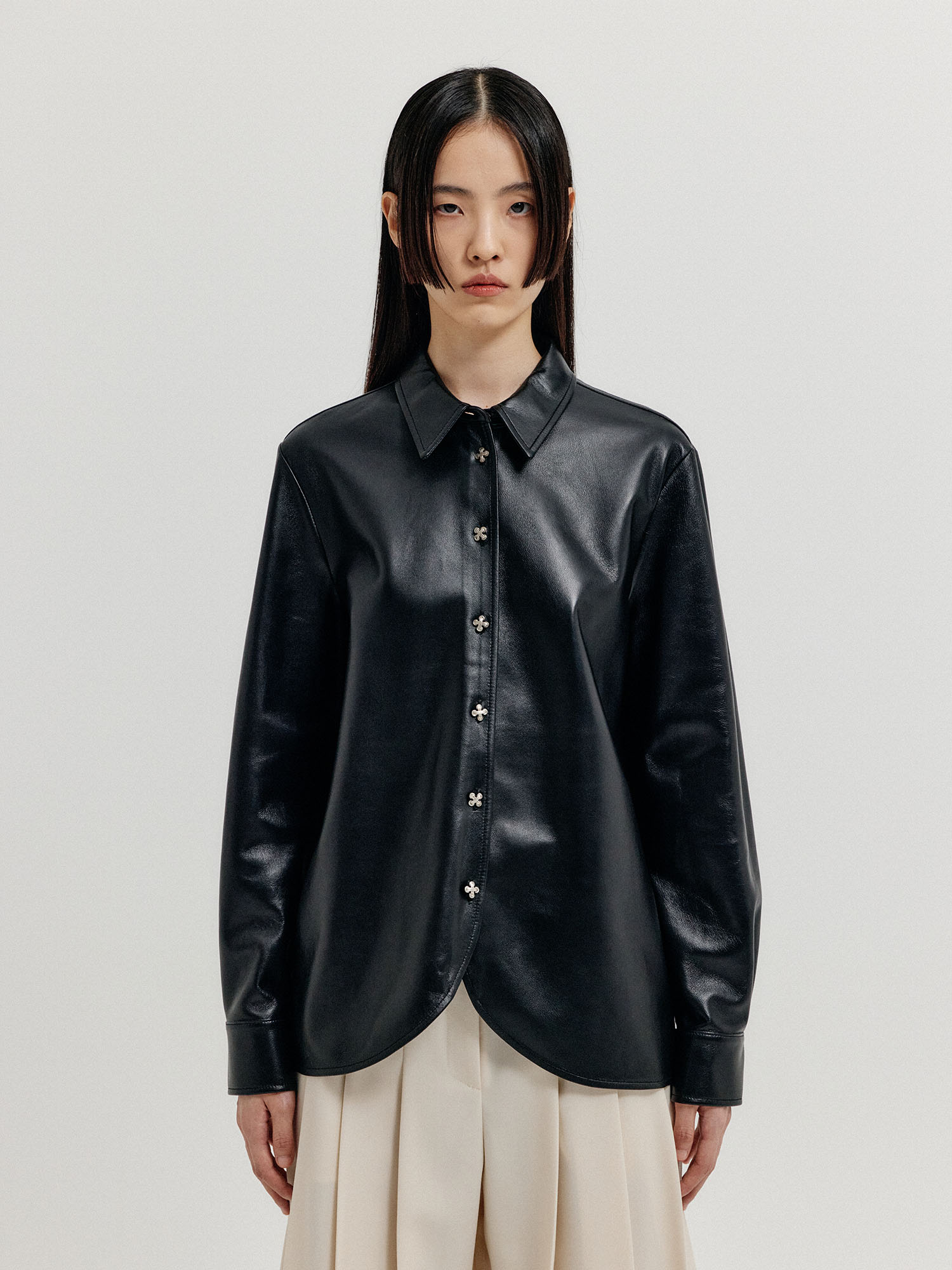 - 둥글게 떨어지는 밑단 라인과 독특한 단추가 특징인 셔츠입니다.