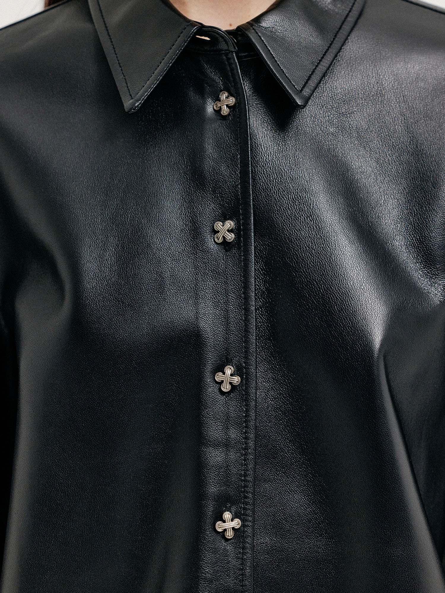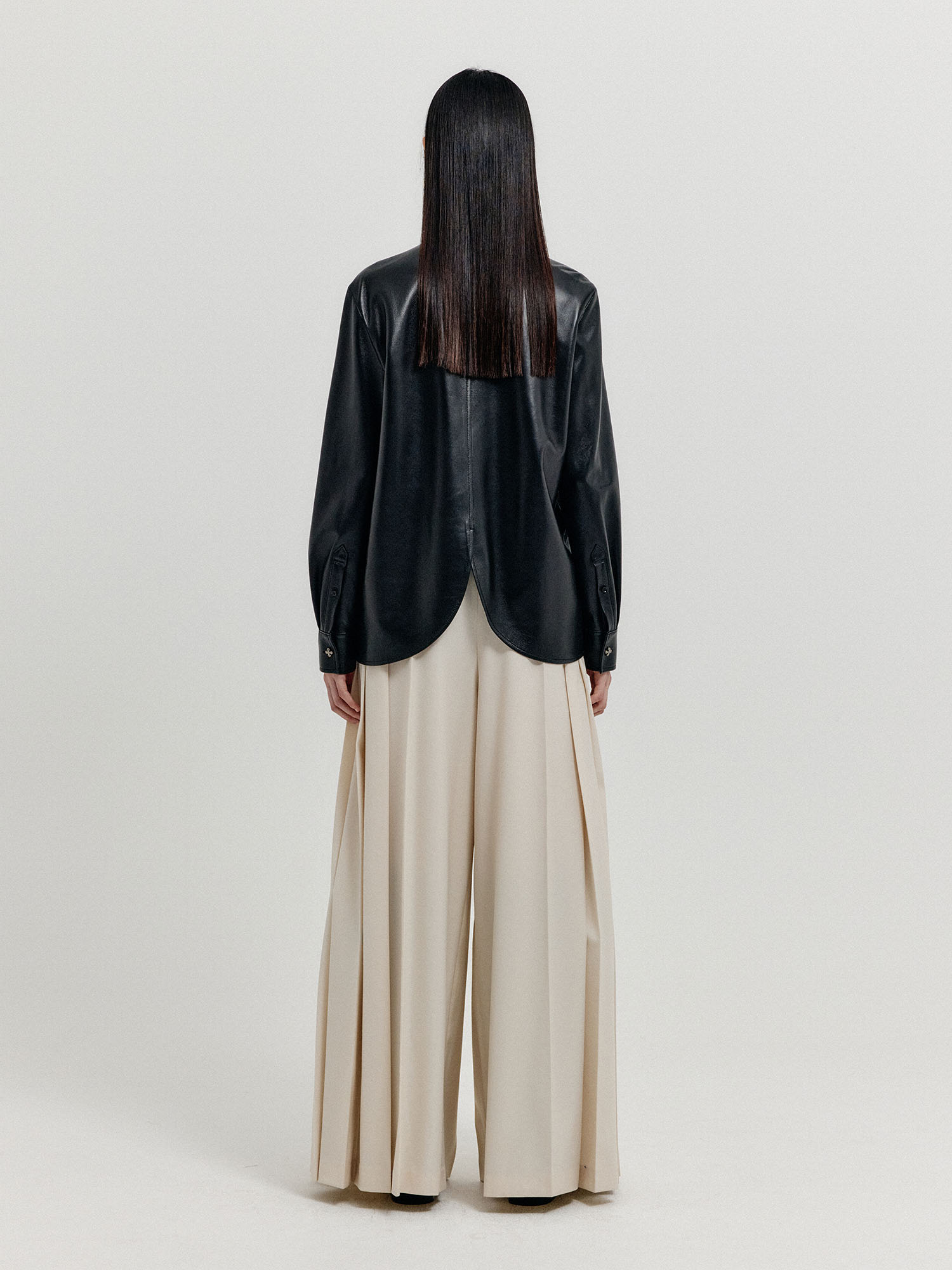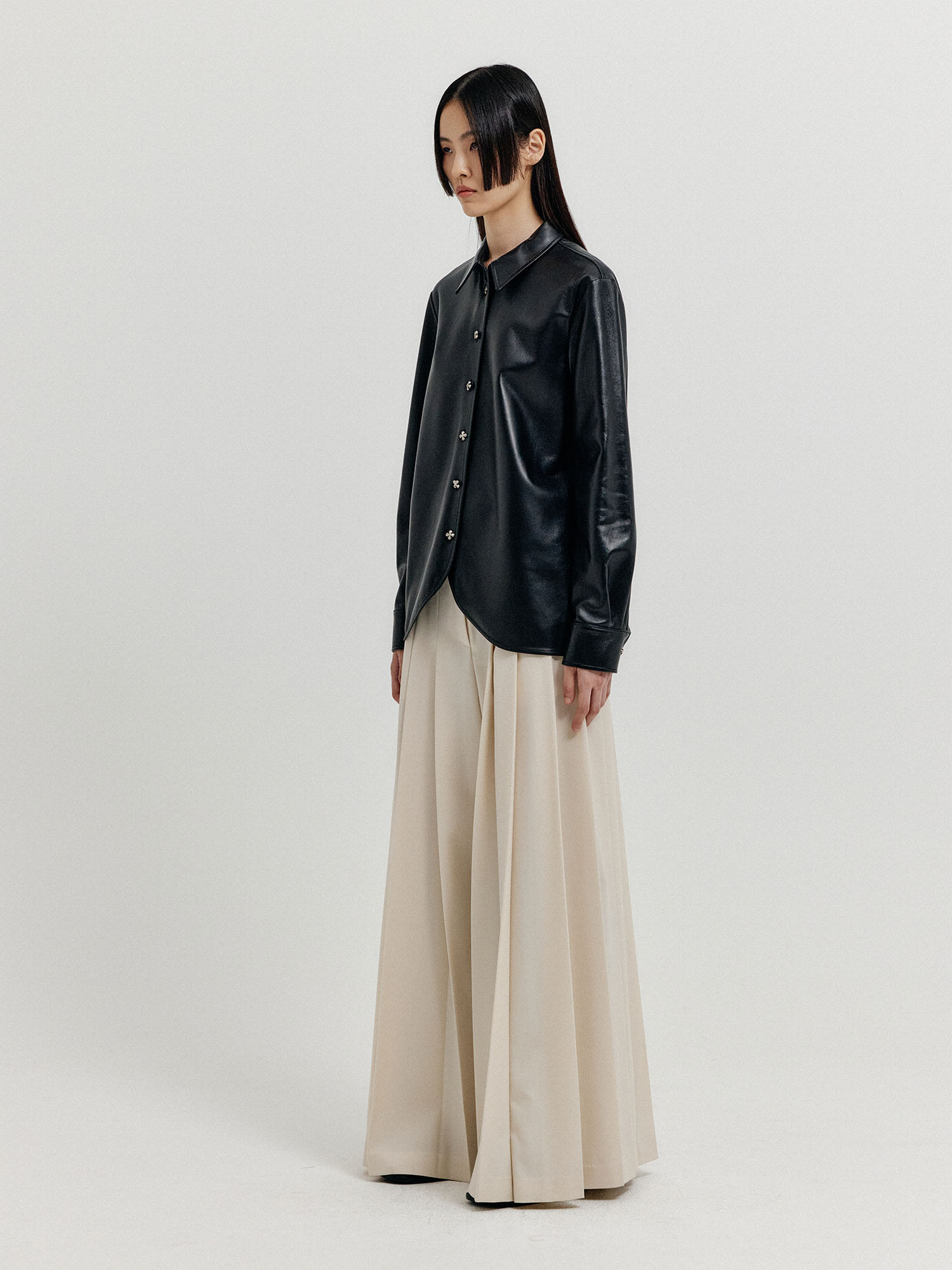 - 둥글게 떨어지는 밑단 라인과 독특한 단추가 특징인 셔츠입니다.