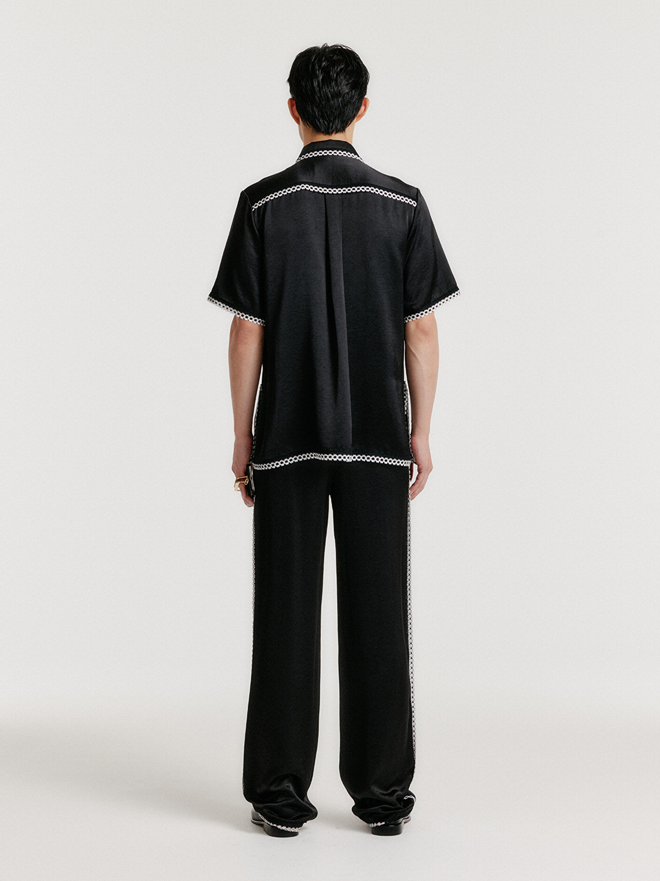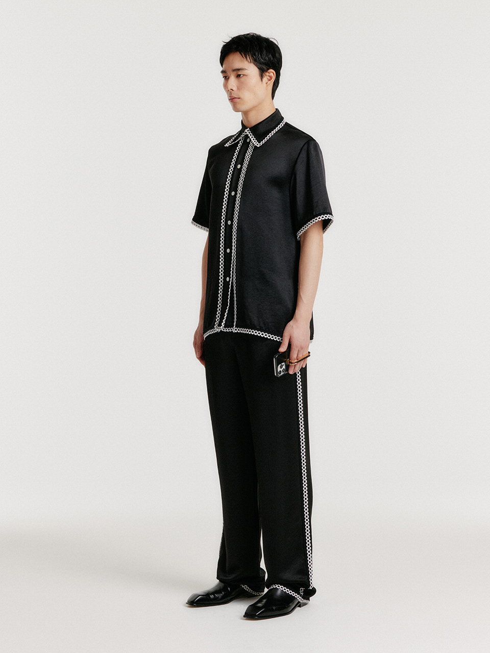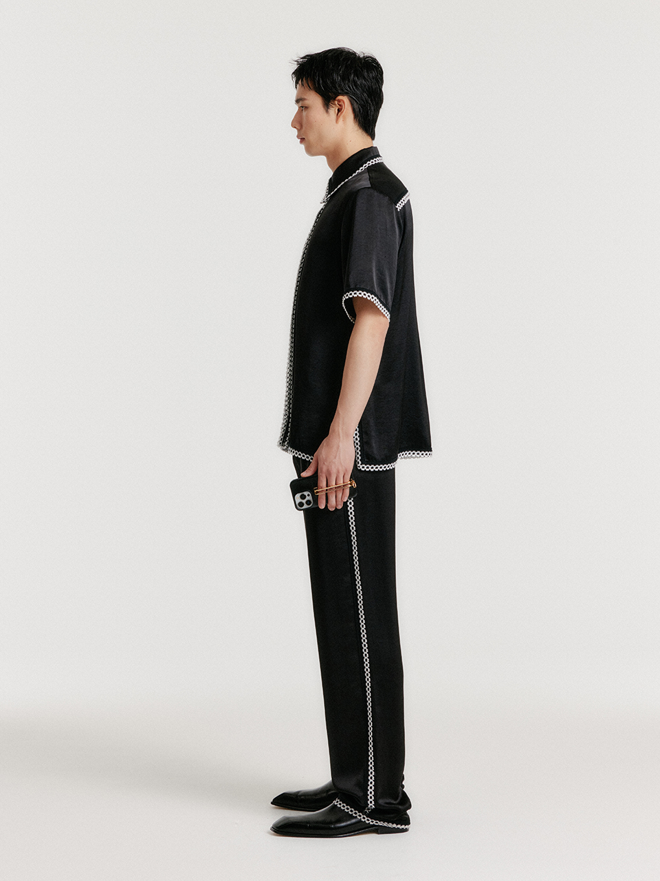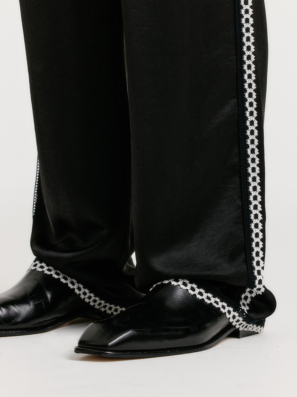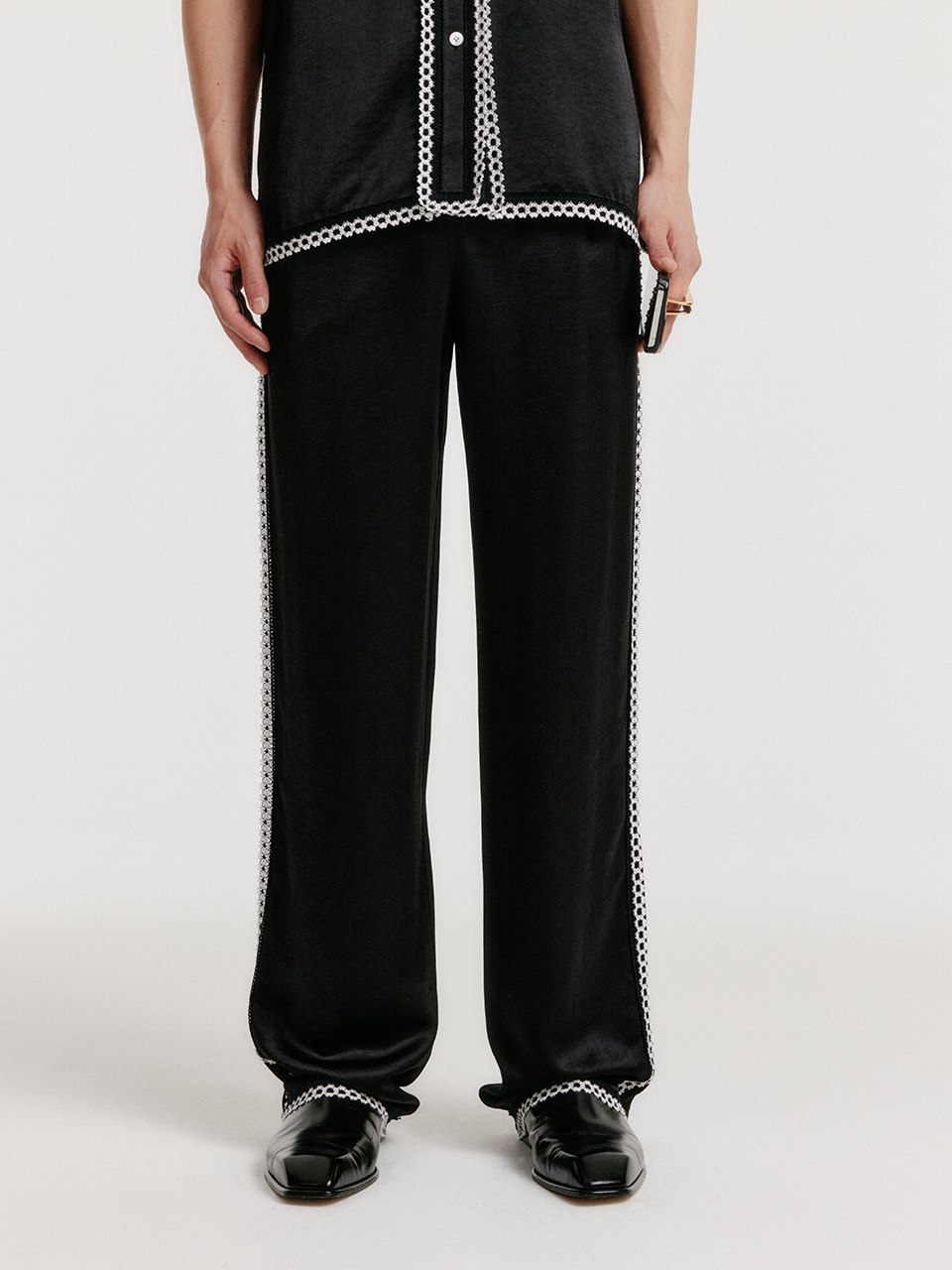 - 광택감 있는 소재의 레이스 트리밍이 포인트인 팬츠입니다.