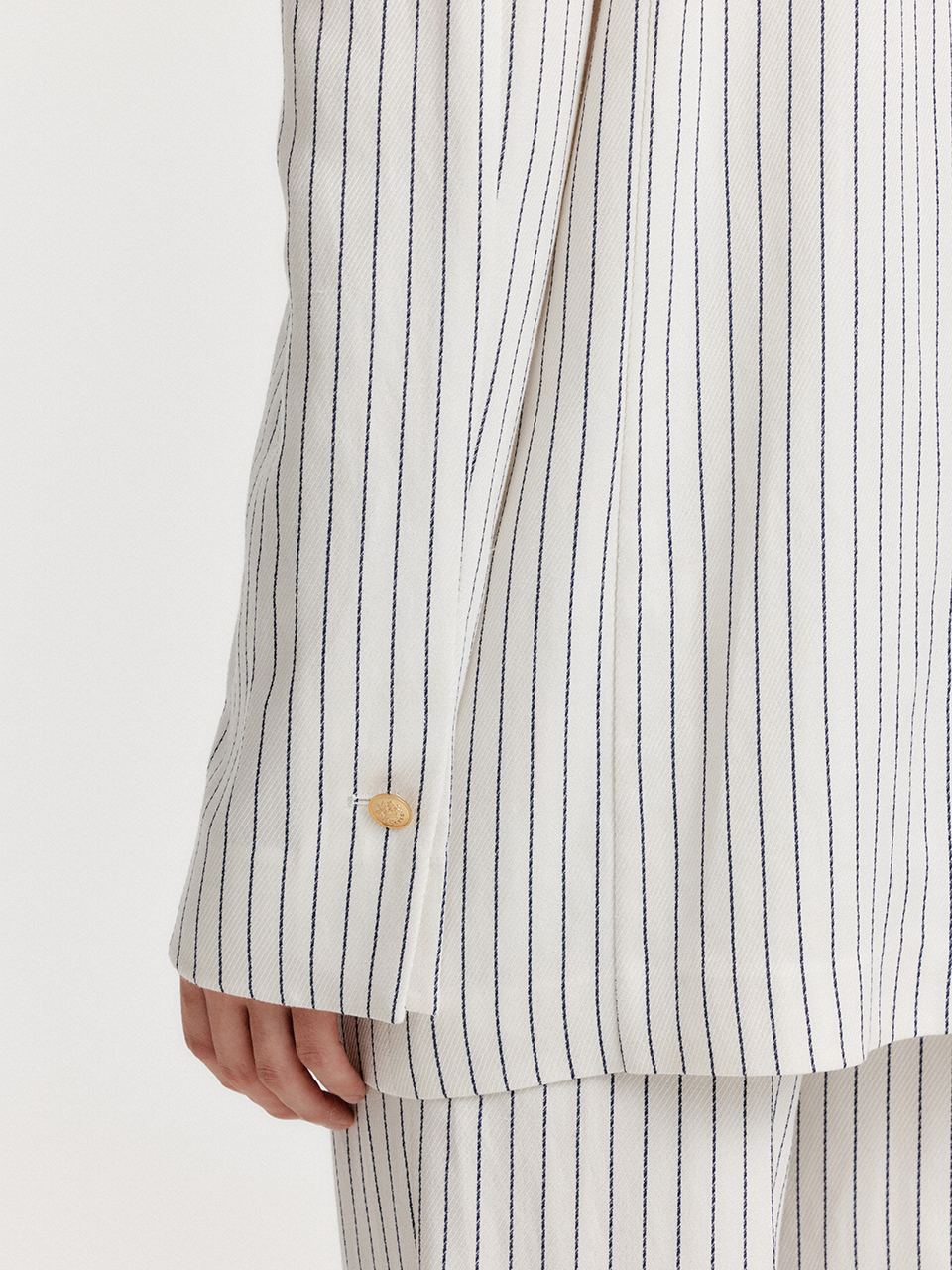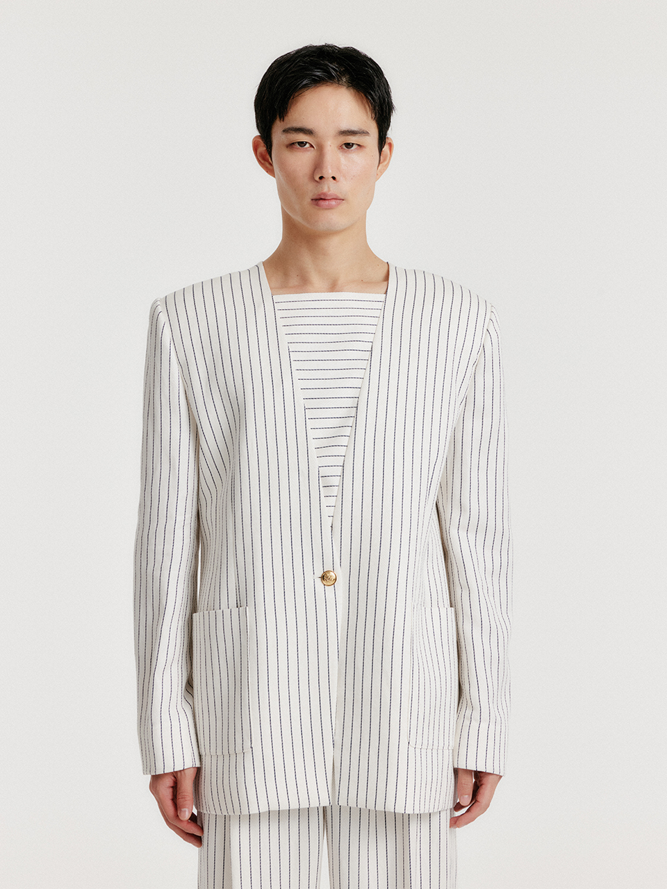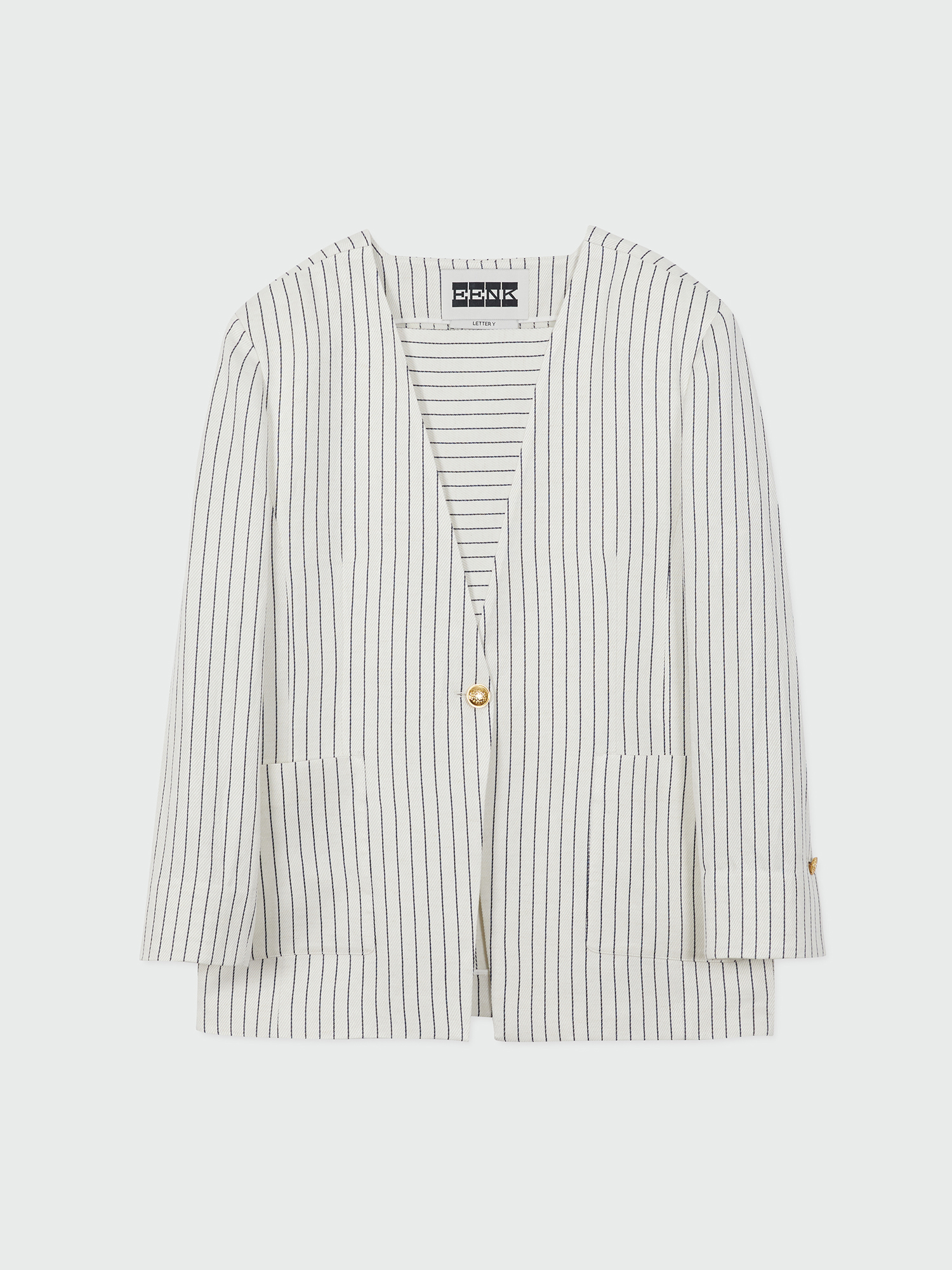 - 스트라이프 패턴의 원 버튼 자켓입니다.