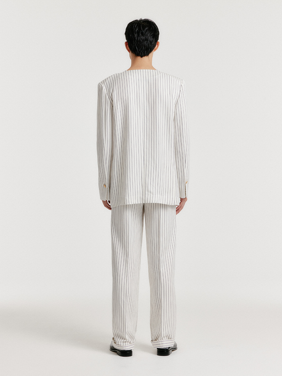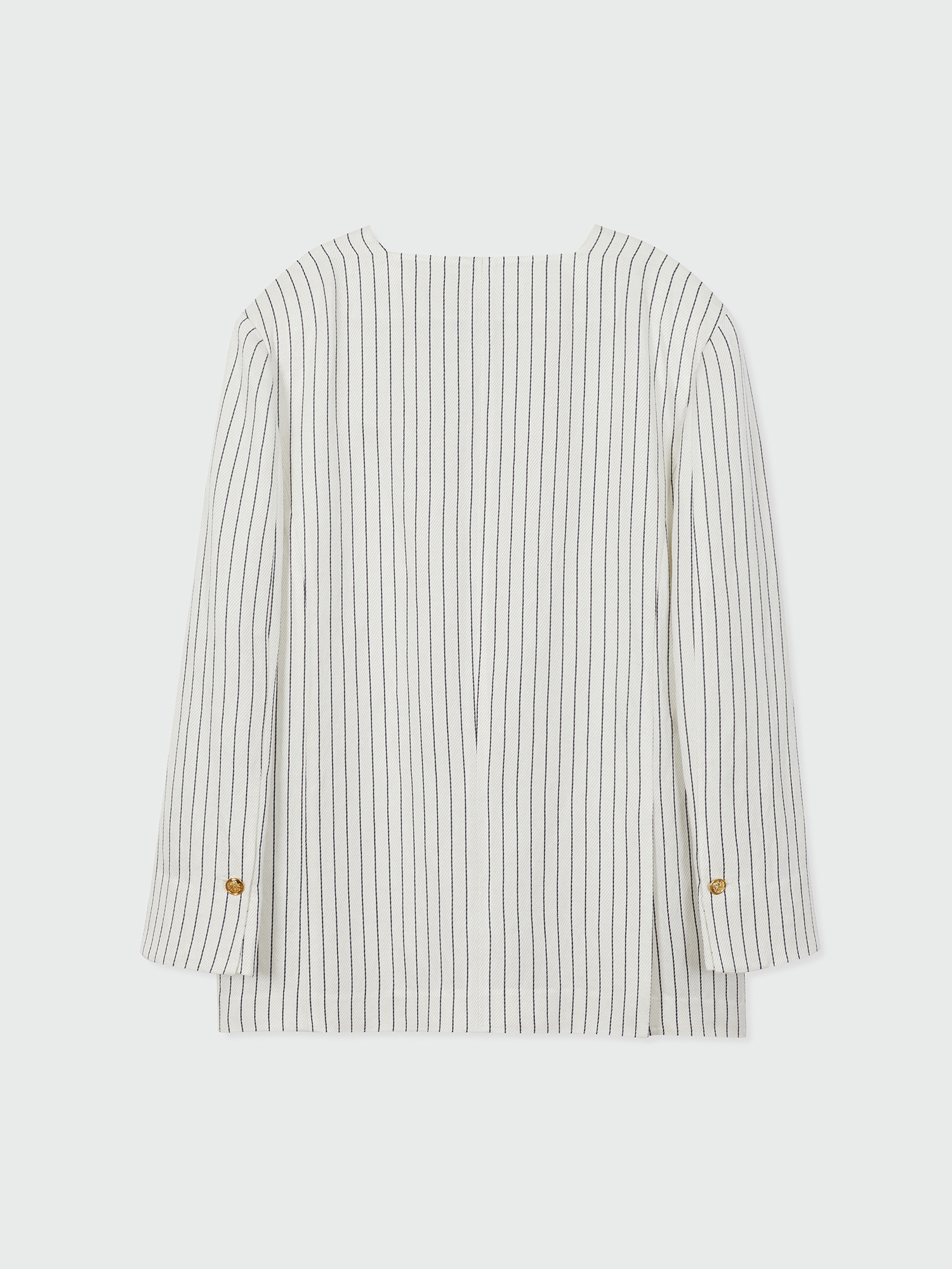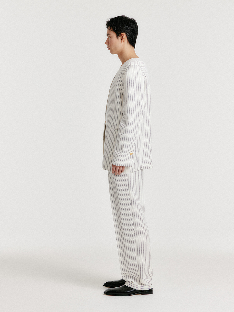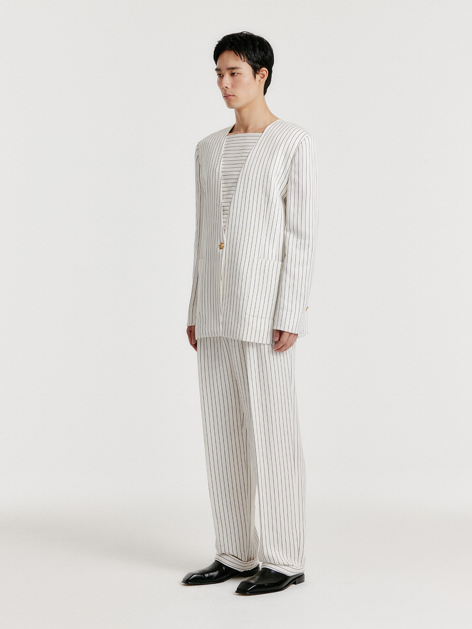 - 스트라이프 패턴의 원 버튼 자켓입니다.