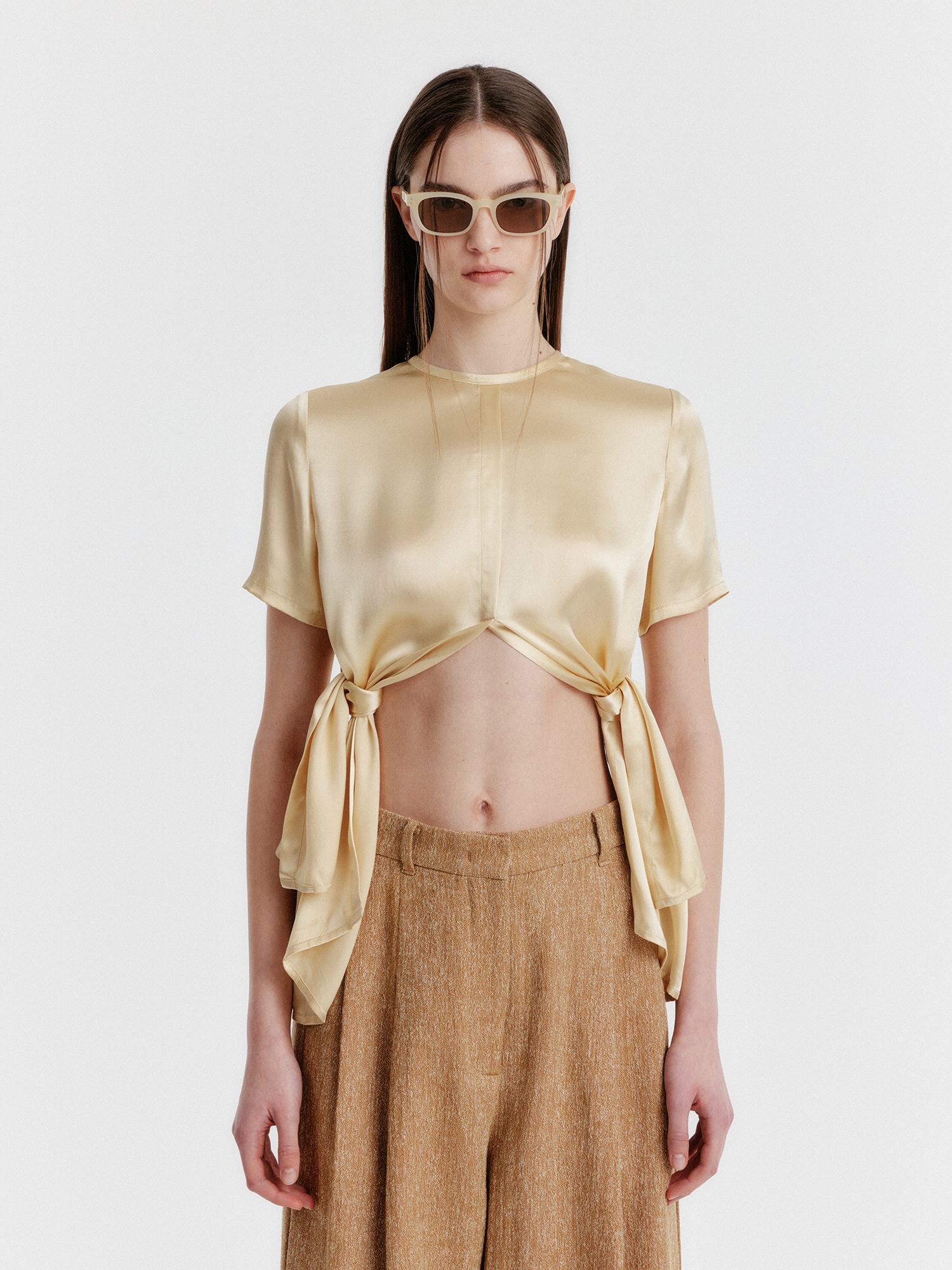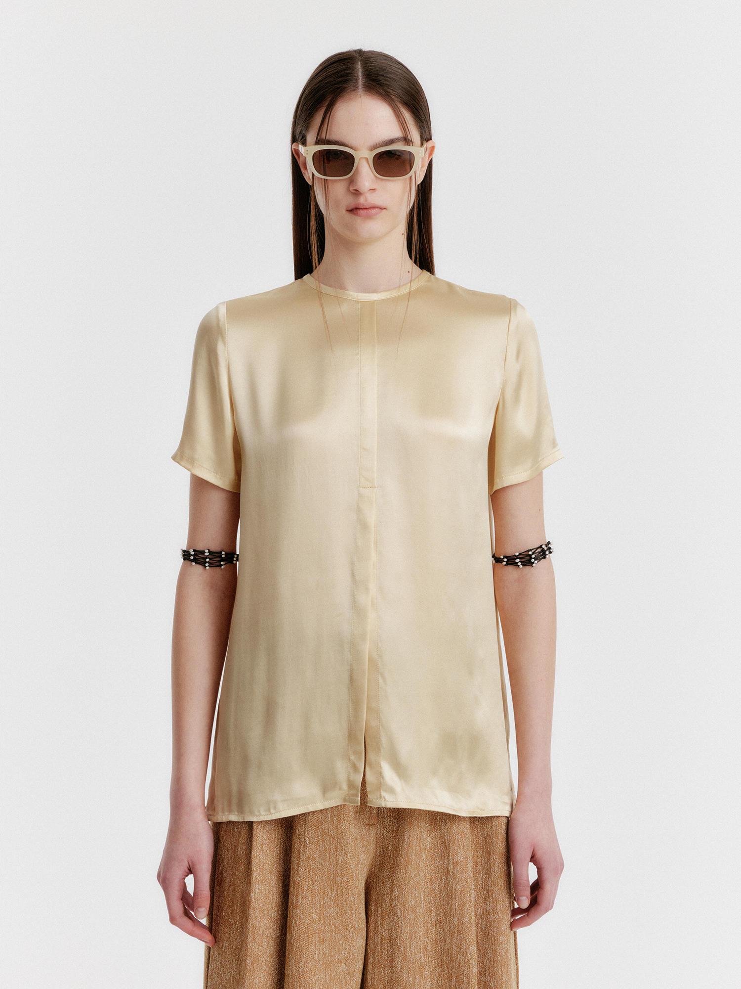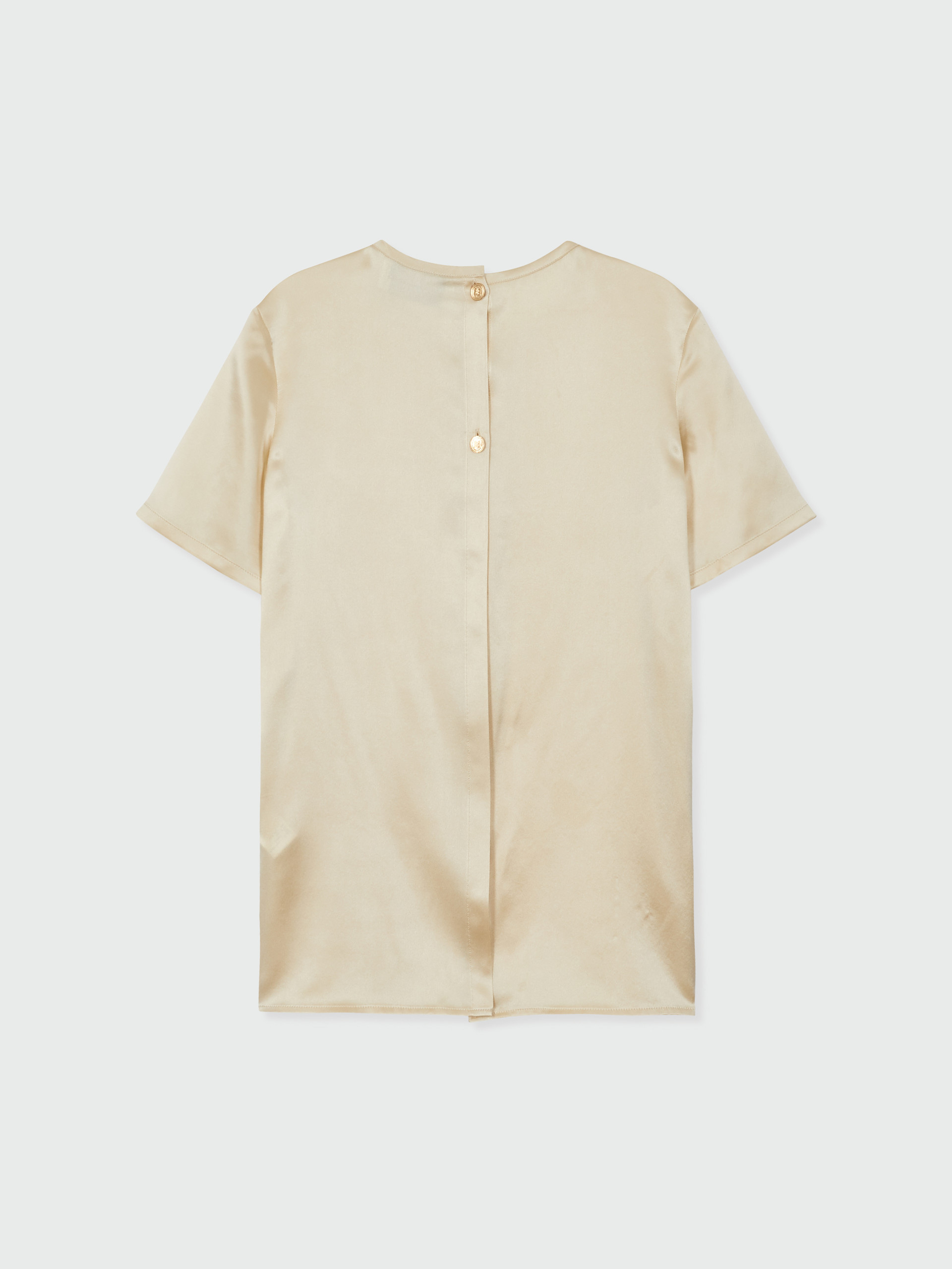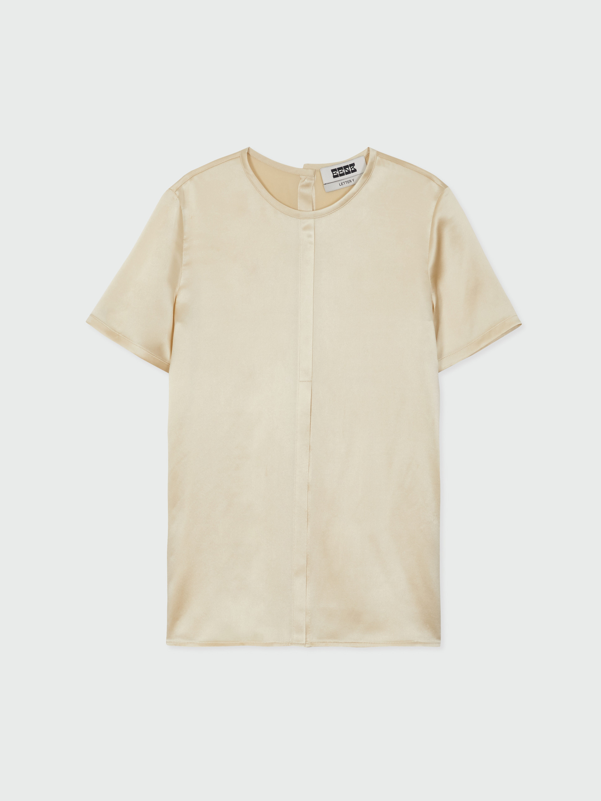 - 광택감 있는 소재의 반소매 탑입니다.