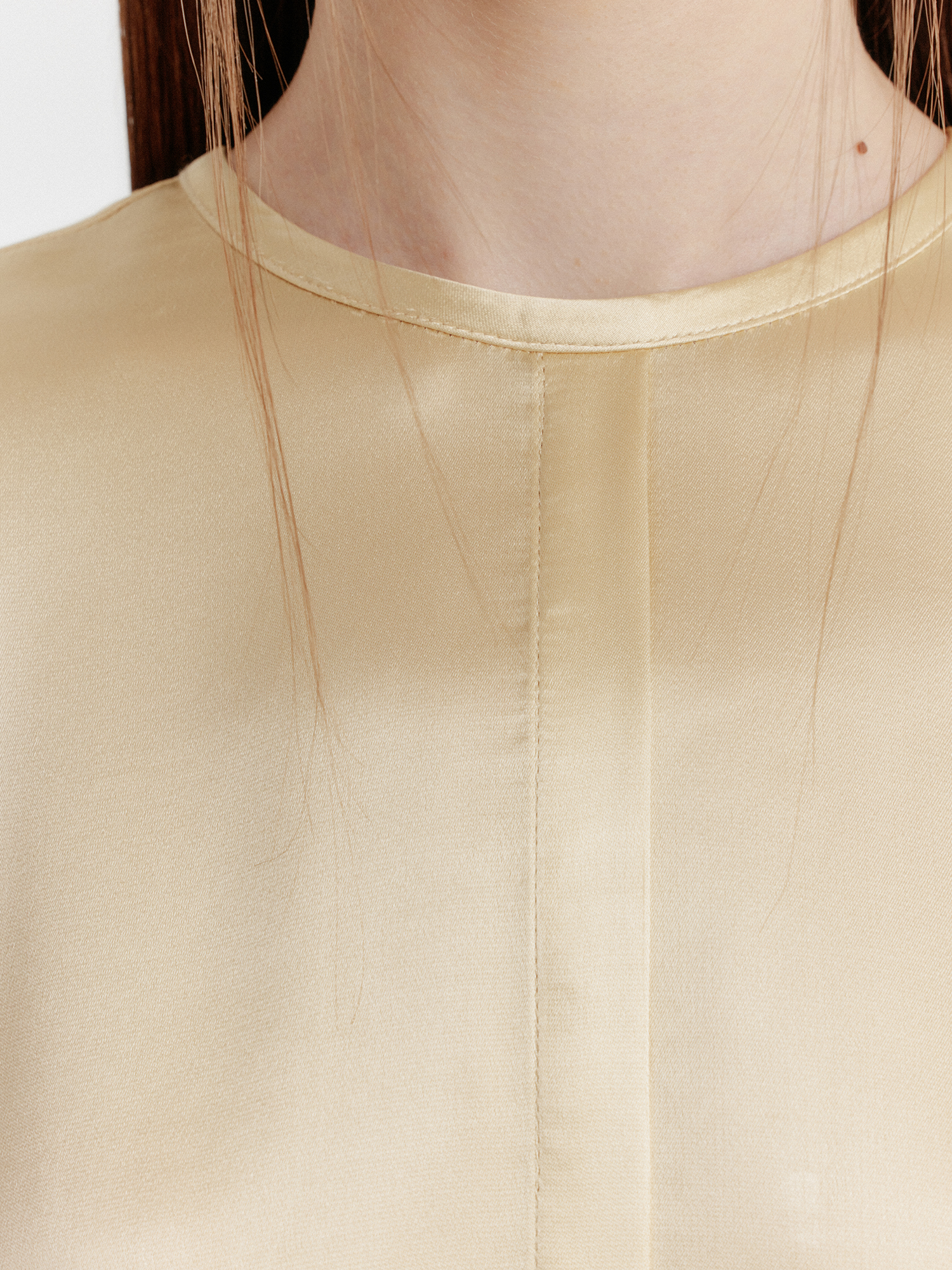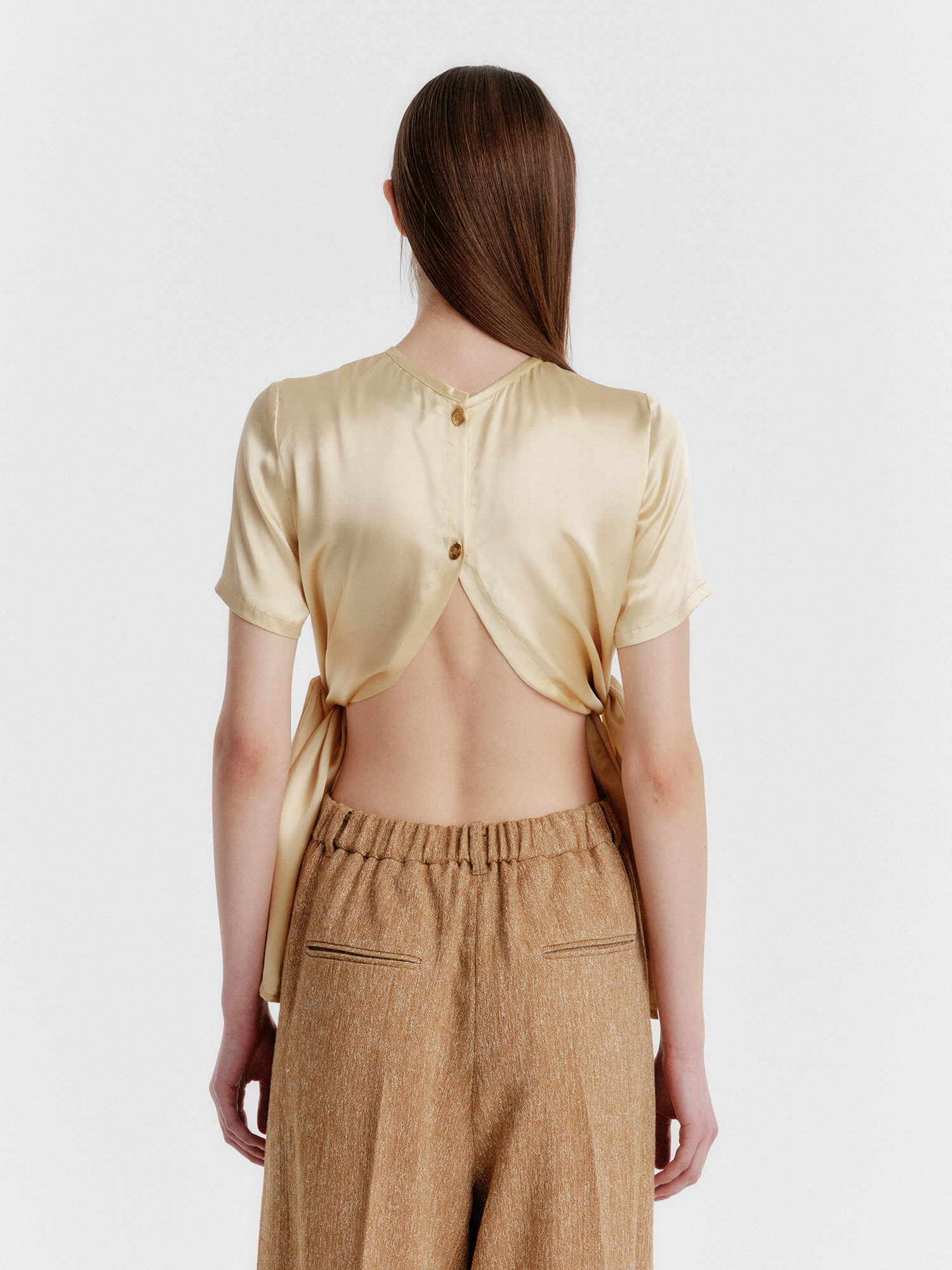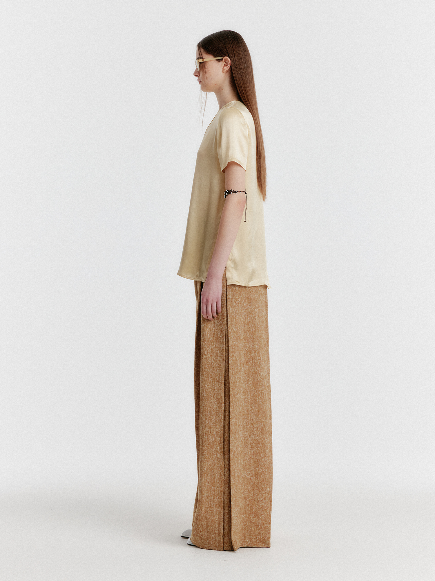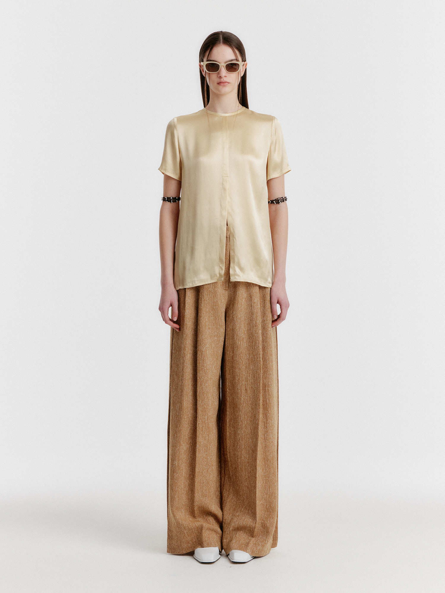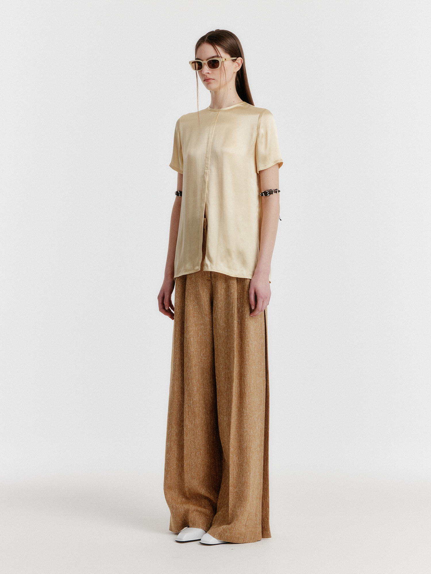 - 광택감 있는 소재의 반소매 탑입니다.