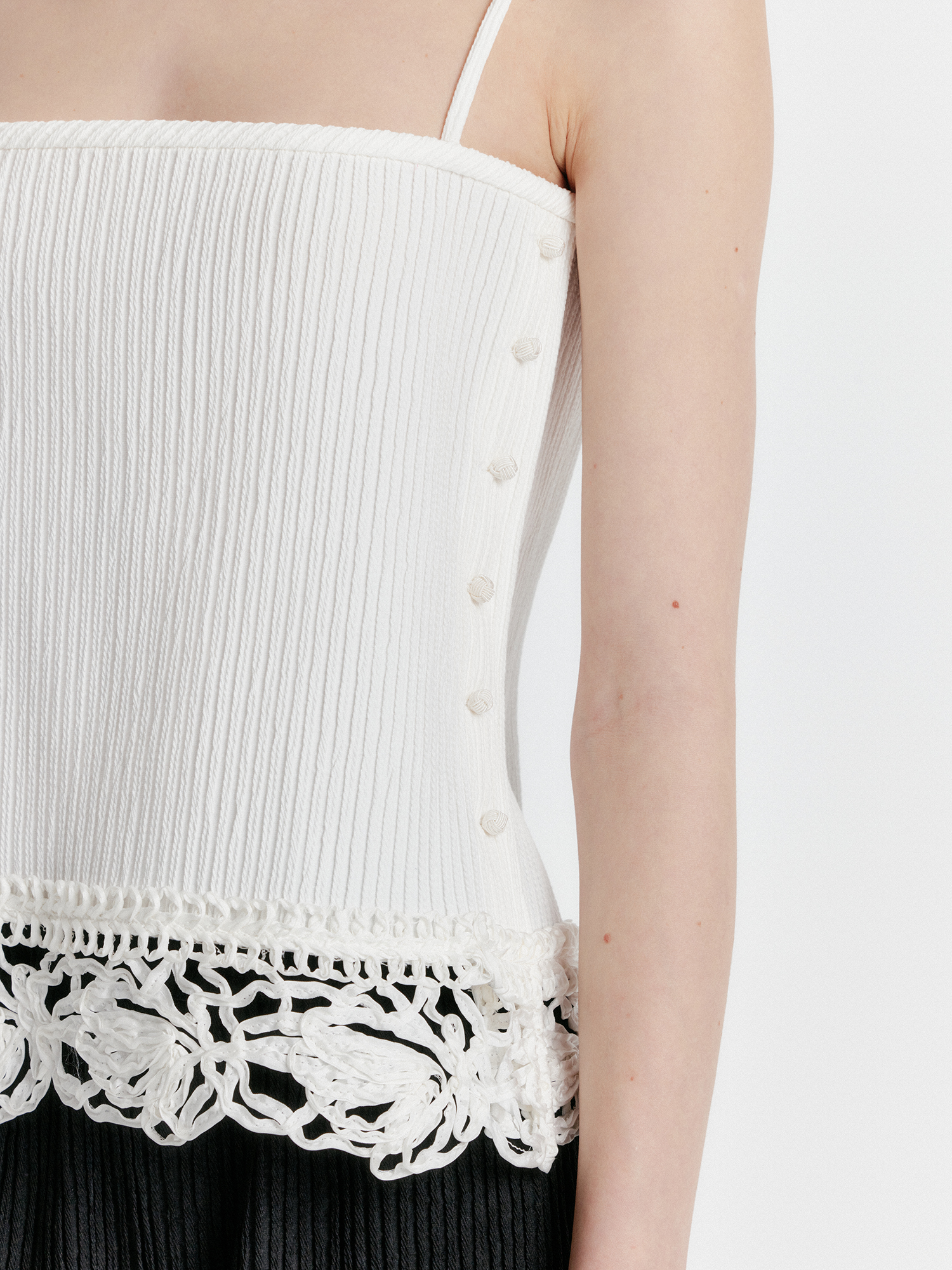 - 레이스 트리밍이 포인트인 슬리브리스 탑입니다.