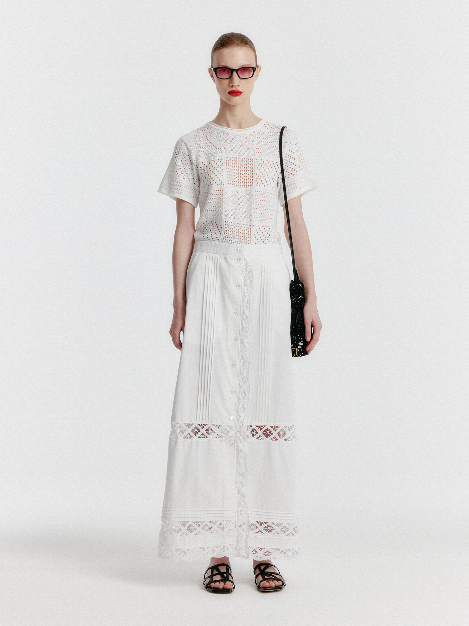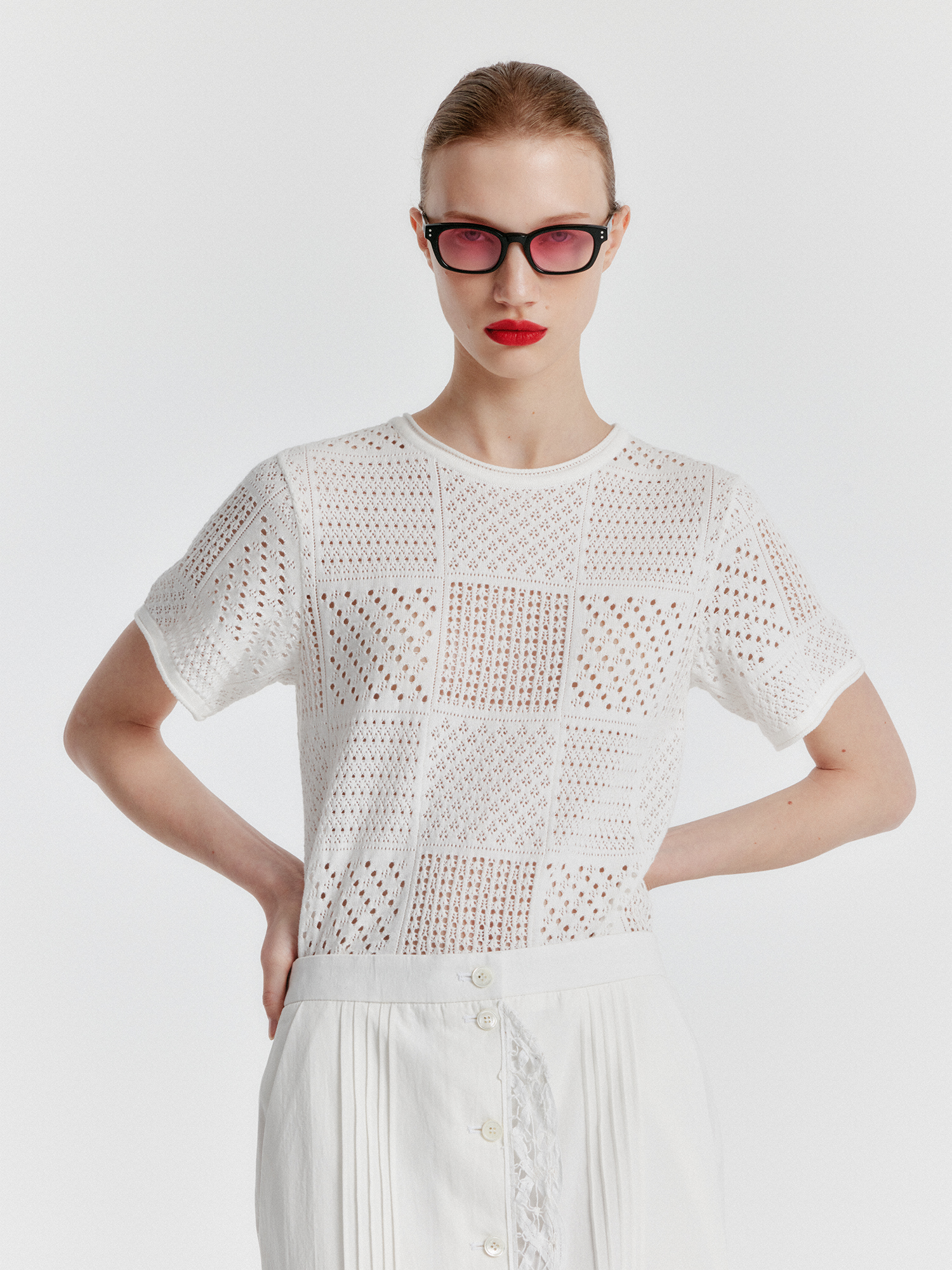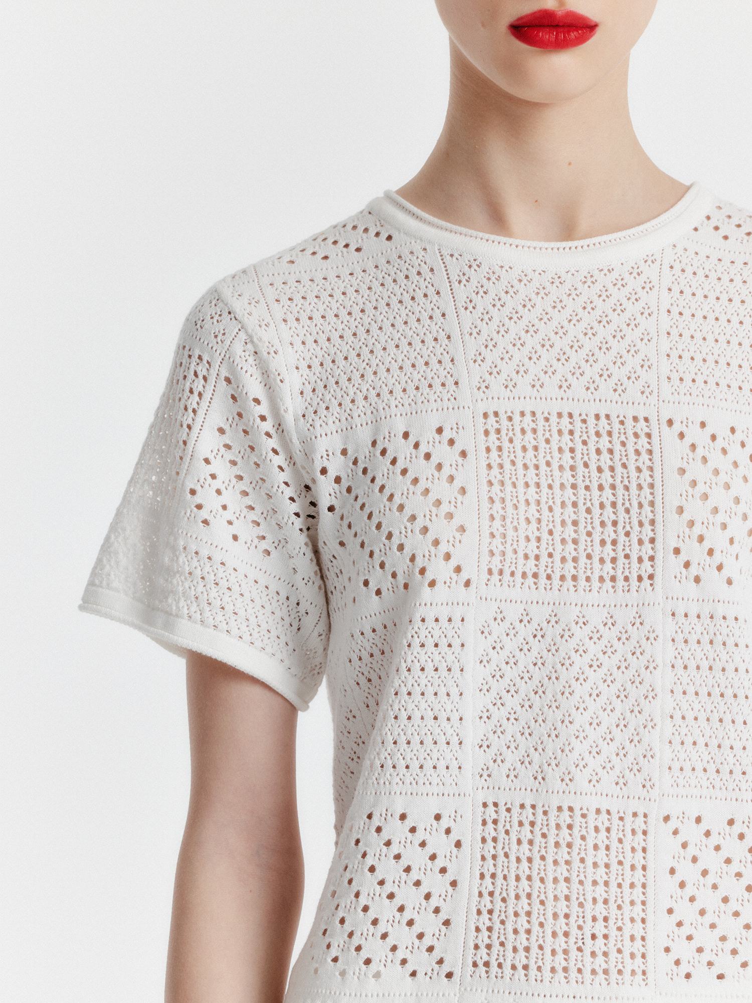 YIZU Panelled Lace Knit T-shirt - White