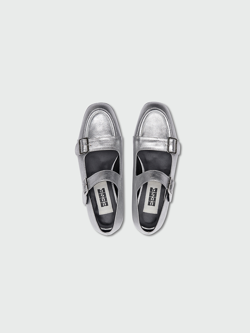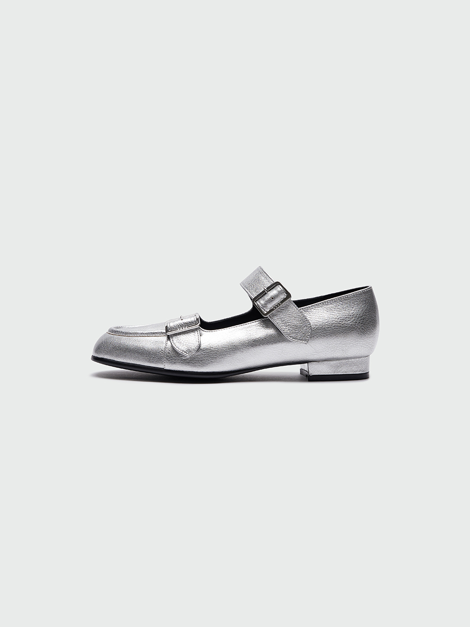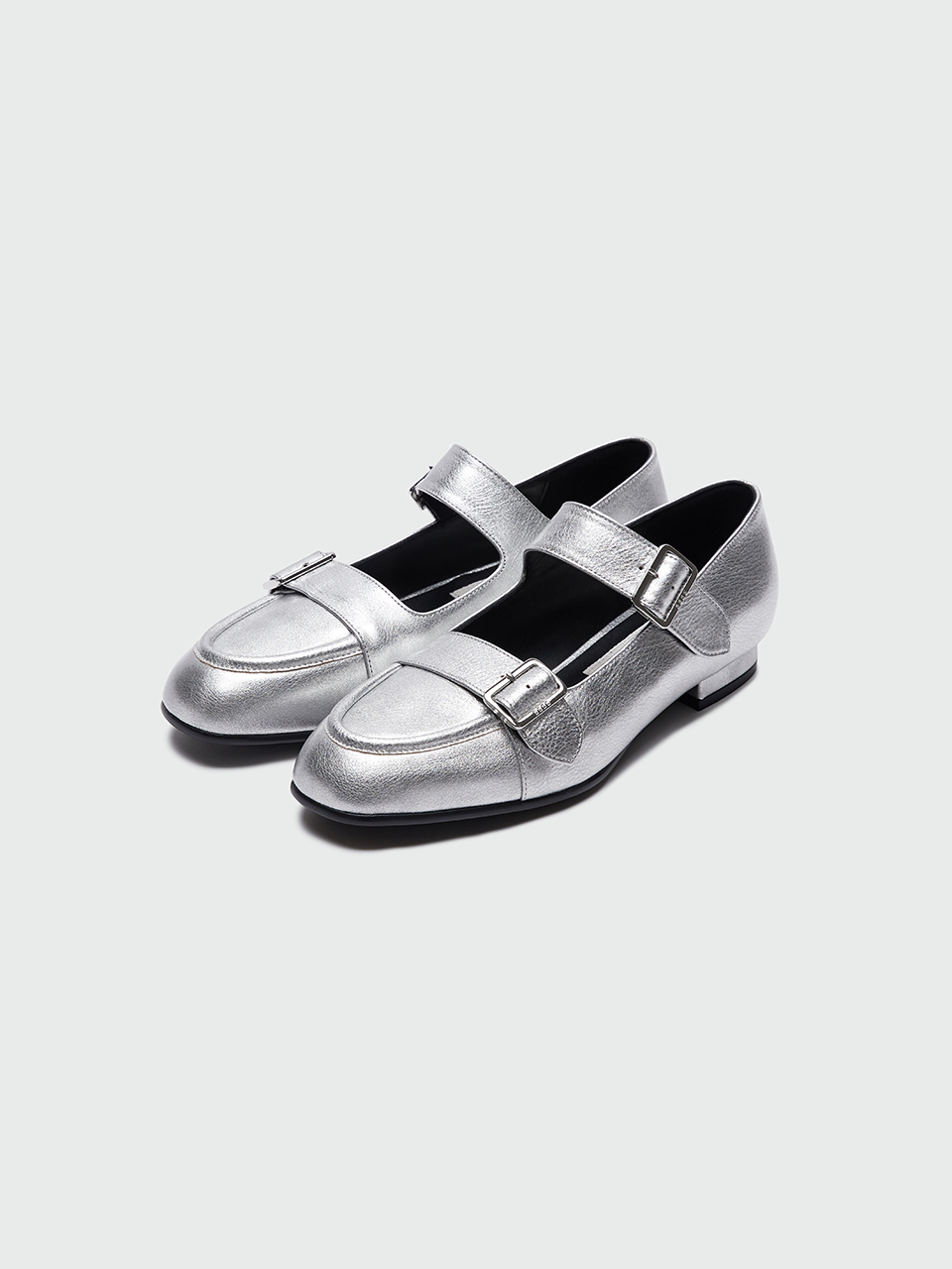 - 소가죽에 실버 컬러를 입힌 플랫 슈즈입니다.