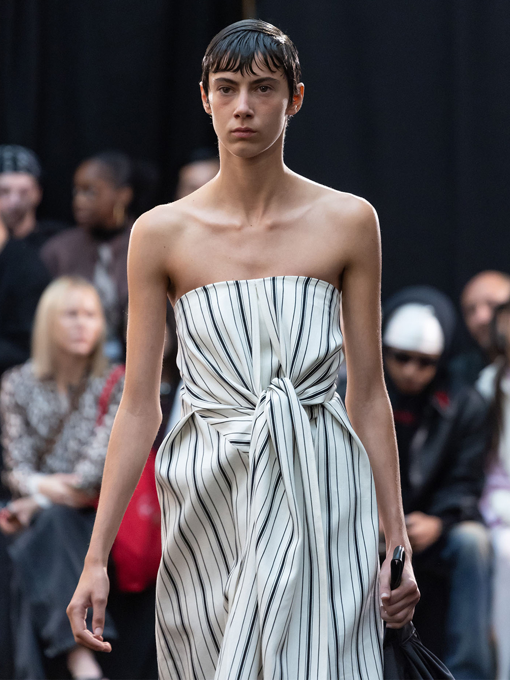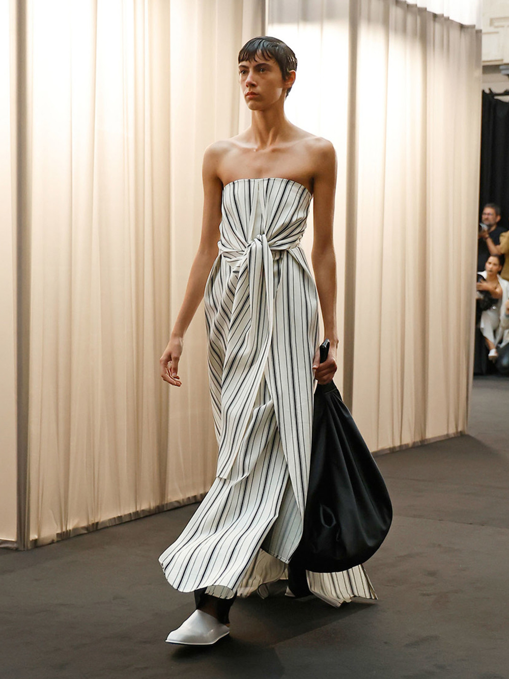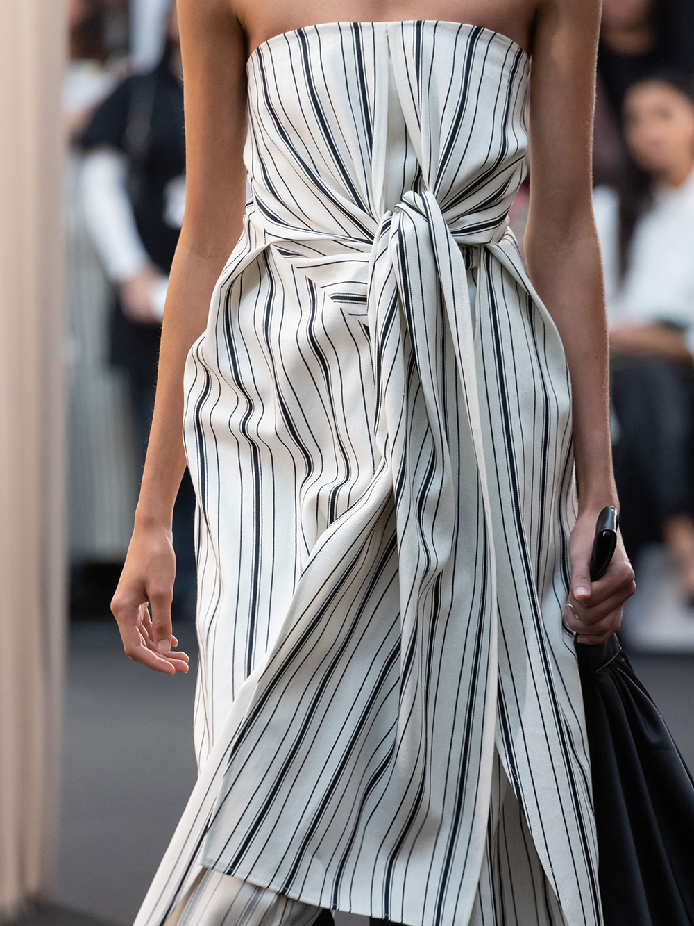 - 스트라이프 패턴의 오프숄더 드레스입니다.