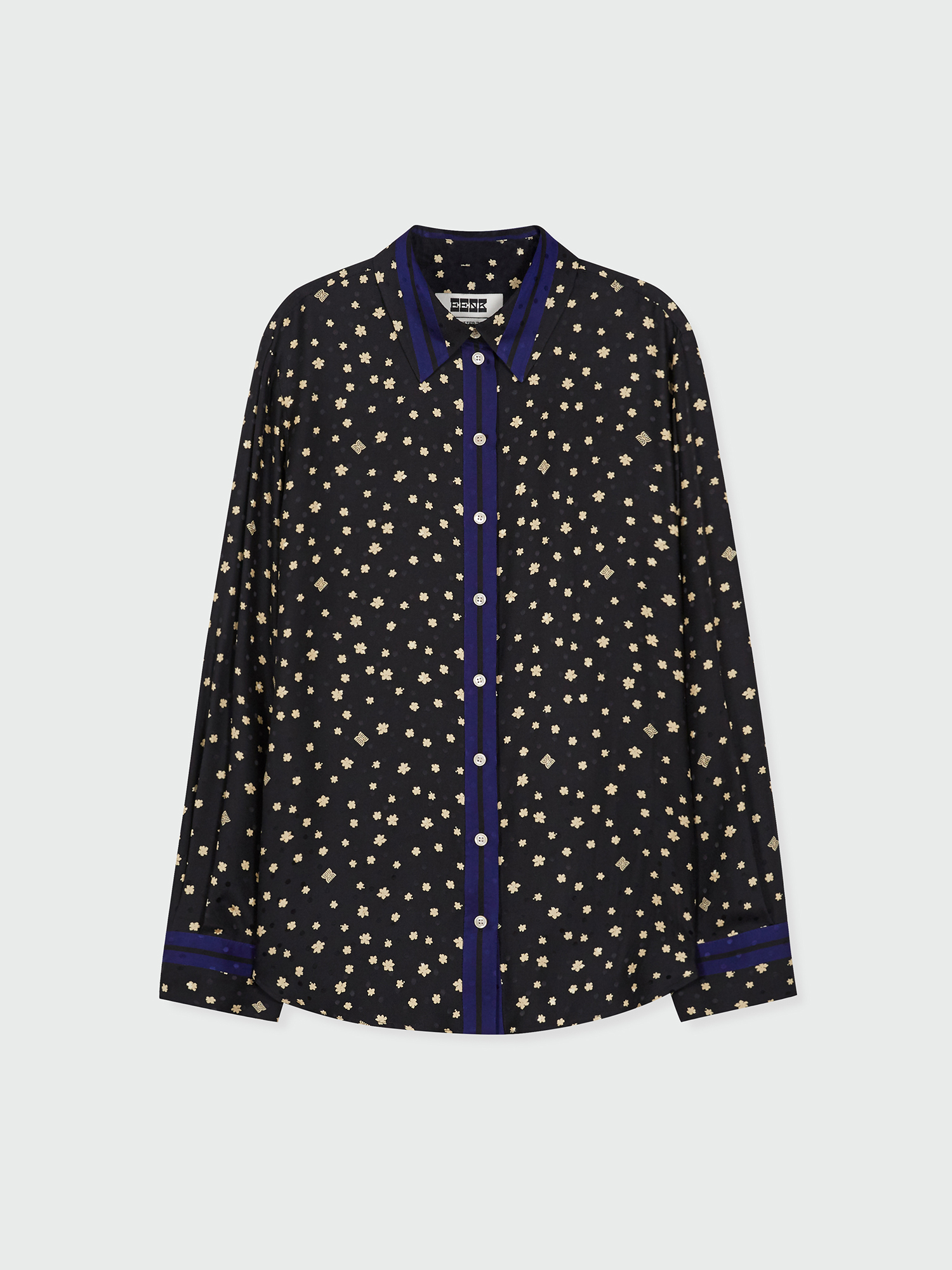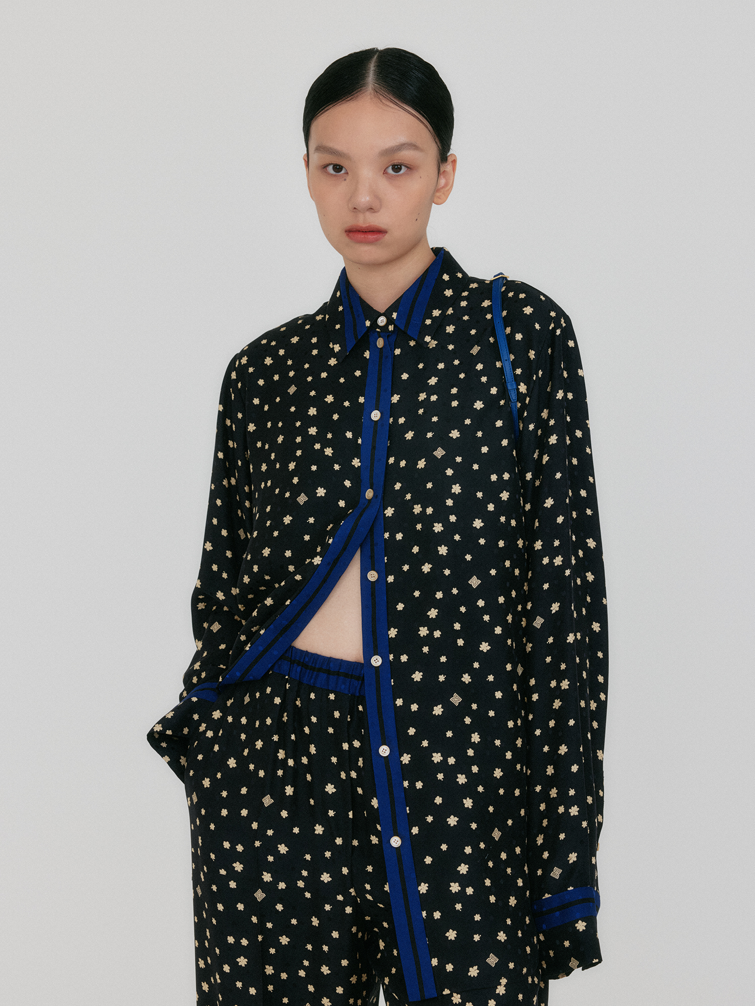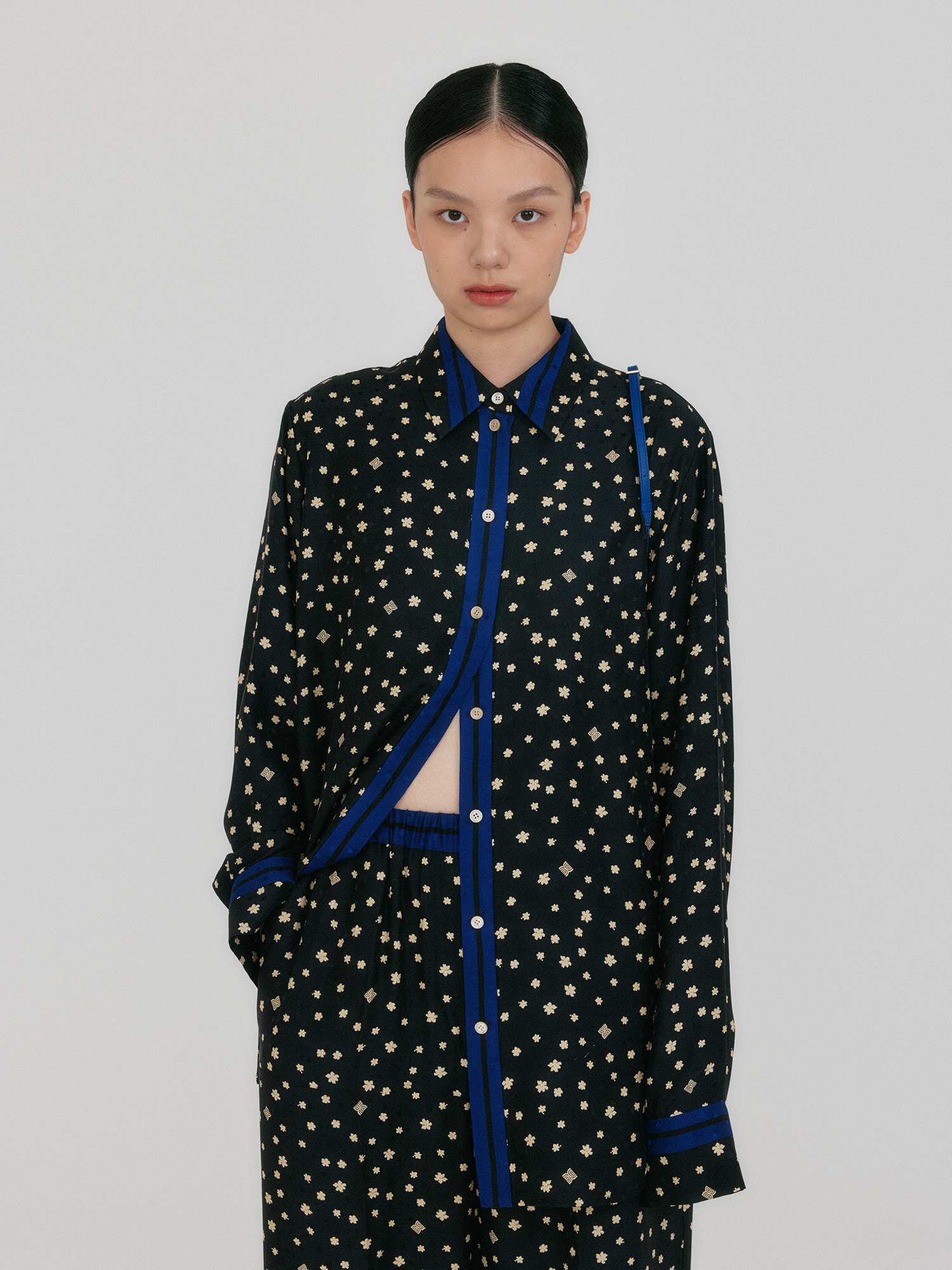 - 여유로운 오버 실루엣의 실크 셔츠