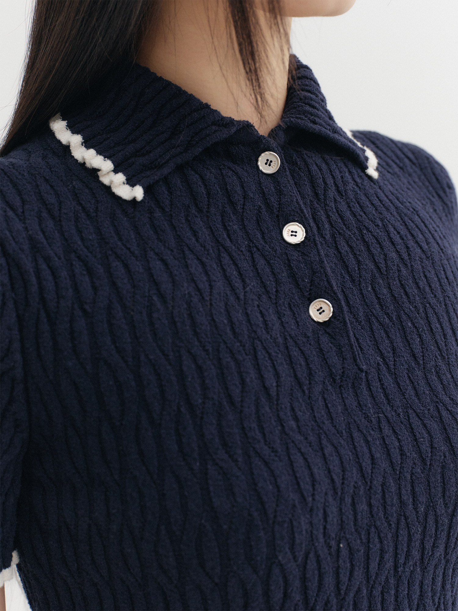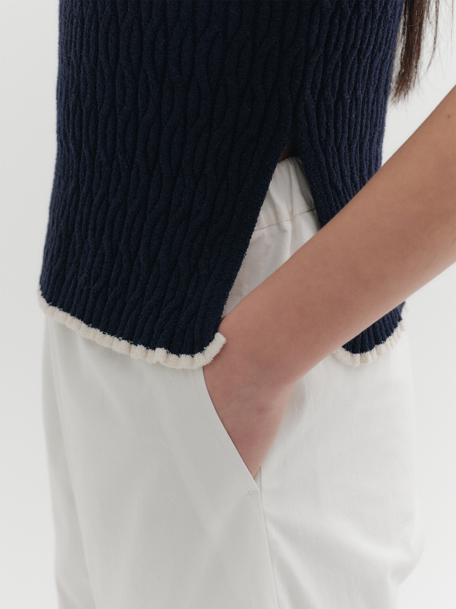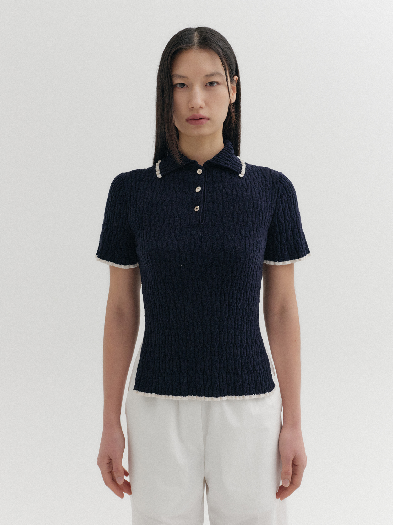 콘트라스트 하프 슬리브 니트 탑 - 네이비NEW