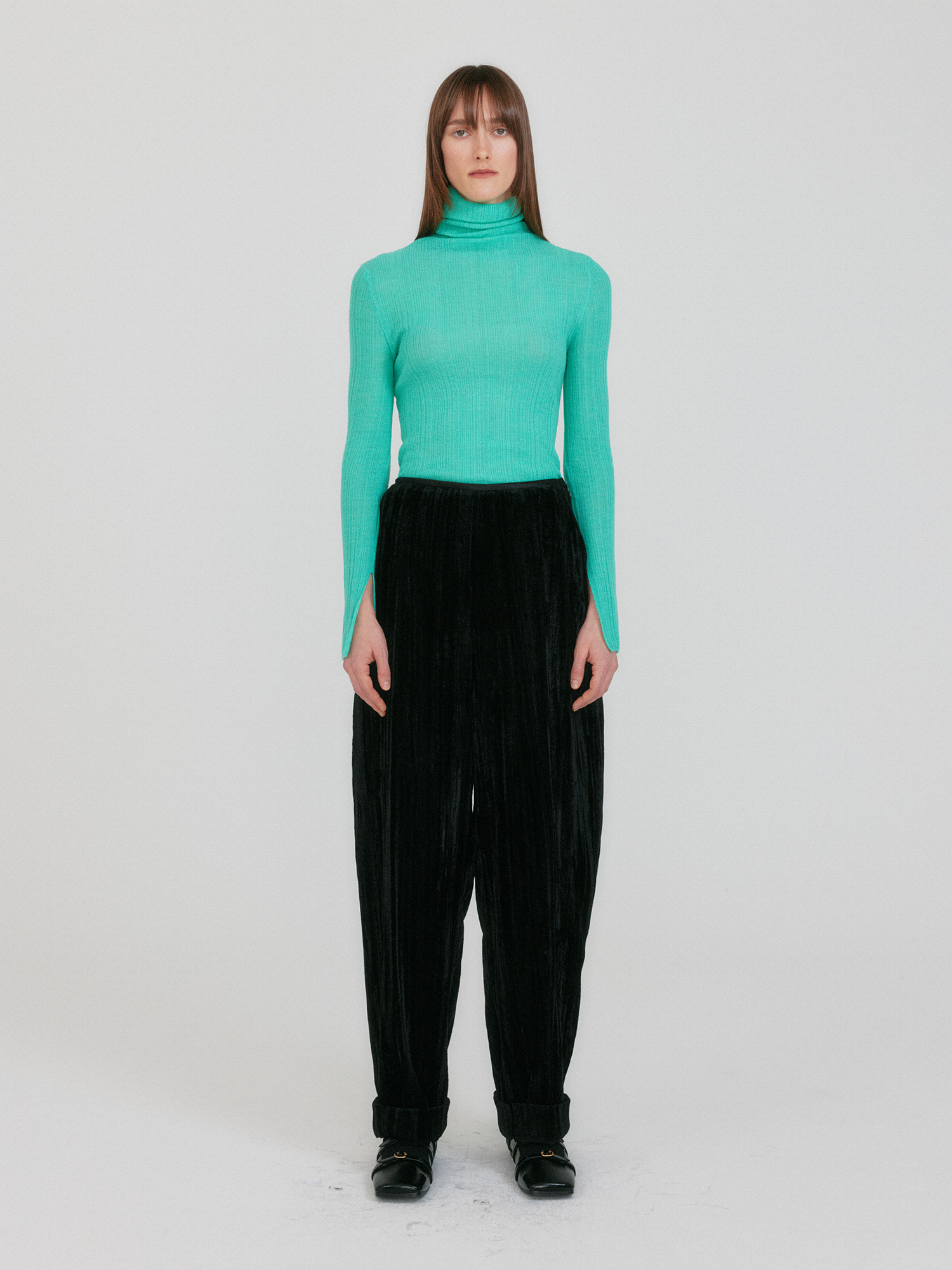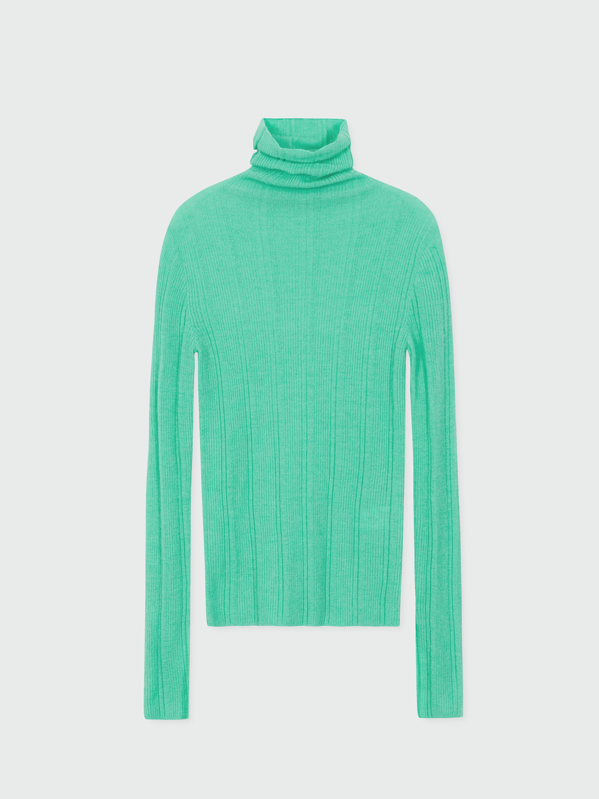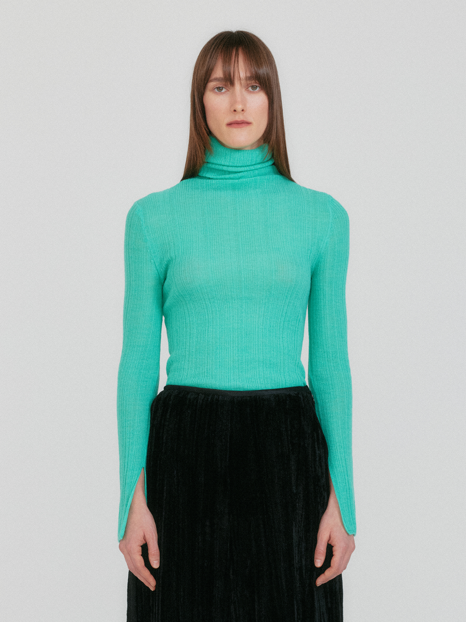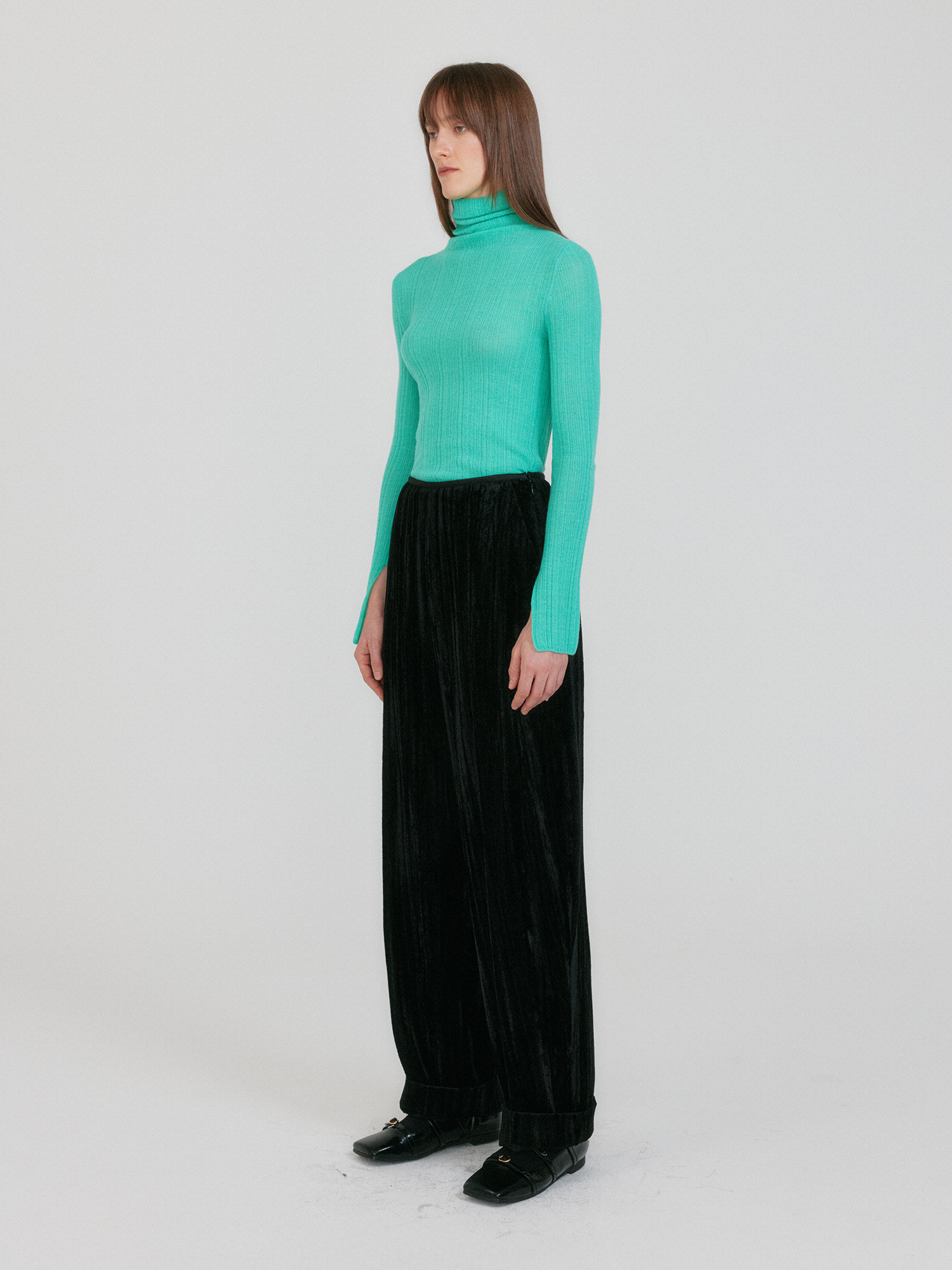 - 얇은 두께감으로 타이트한 실루엣의 하이넥 니트 탑