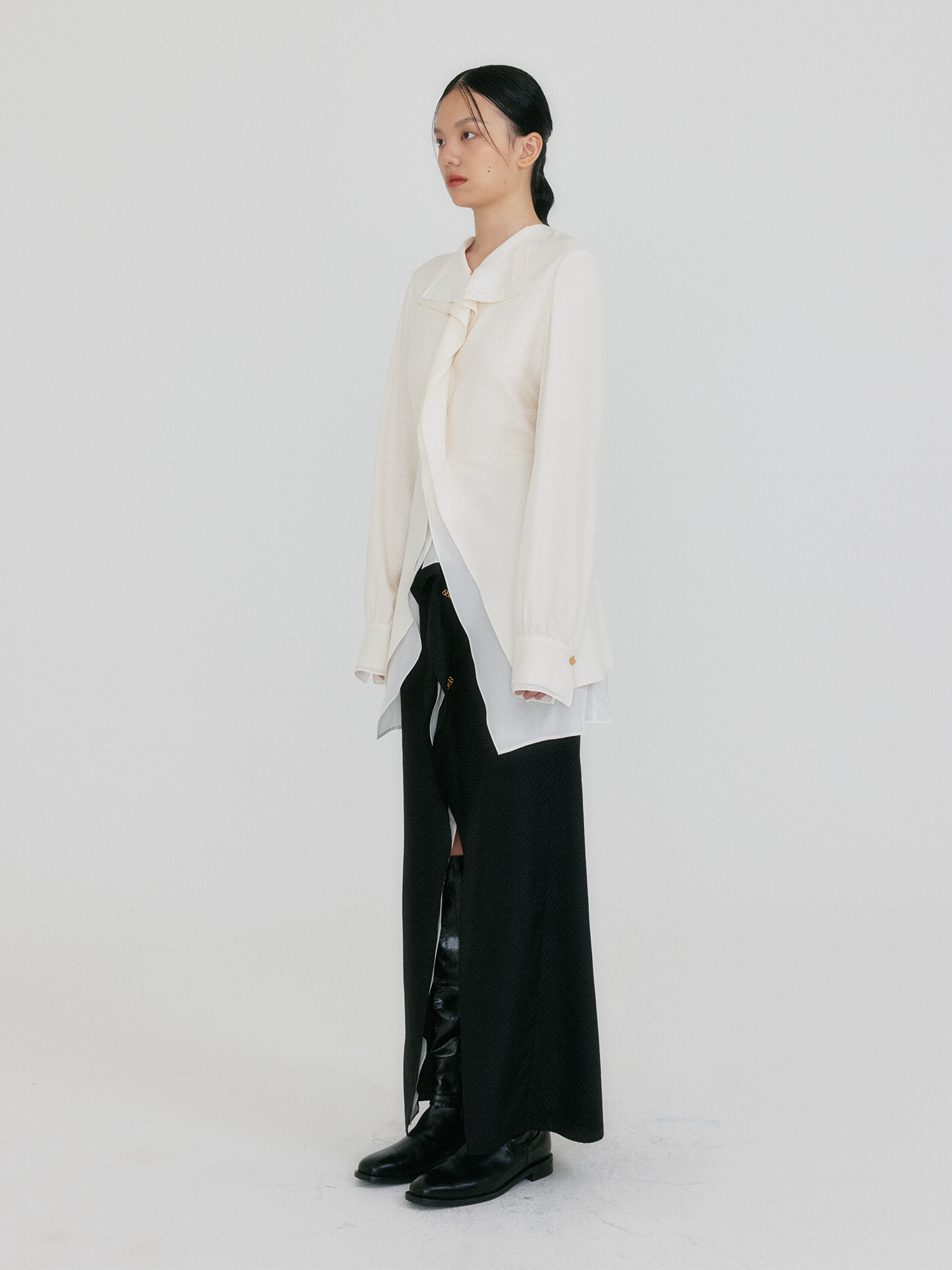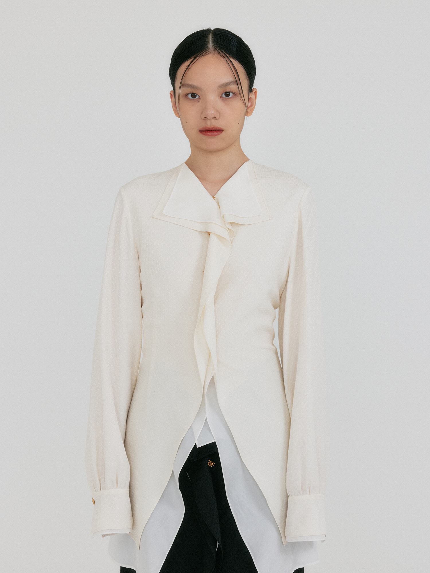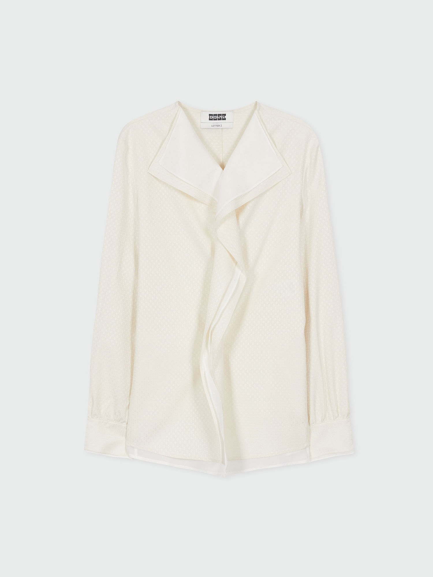 - 드레이프 카라 디테일이 강조된 실크 셔츠