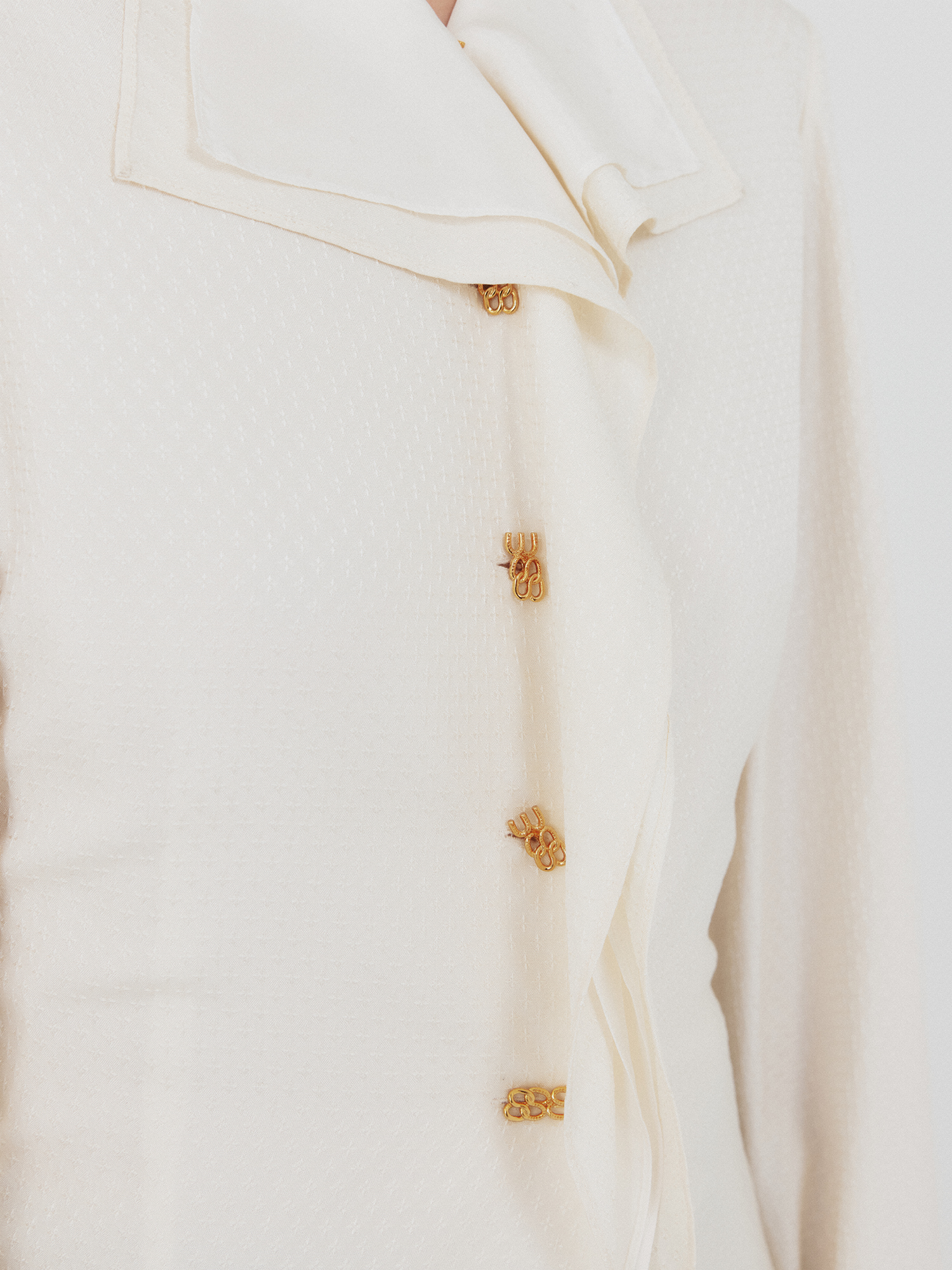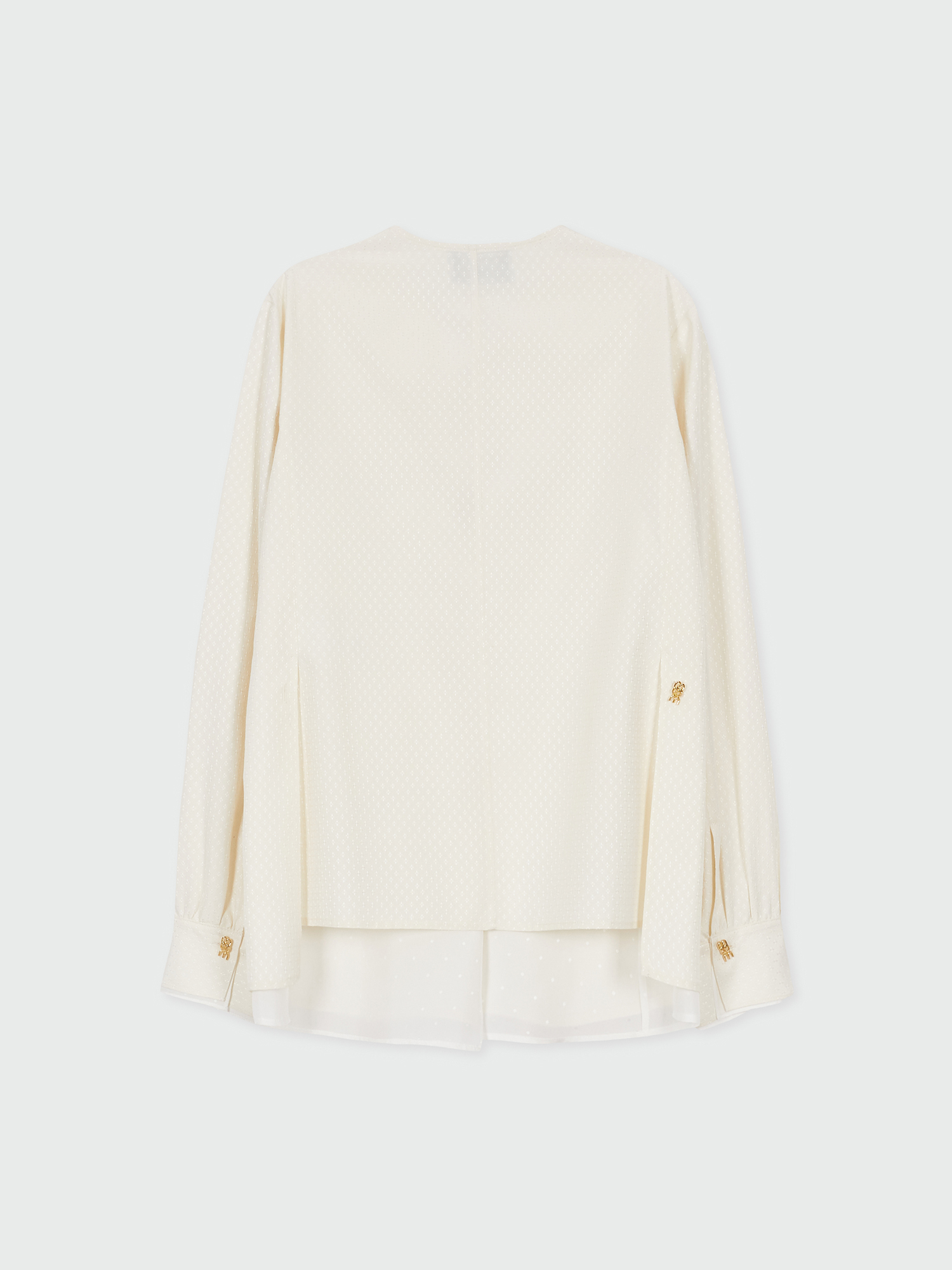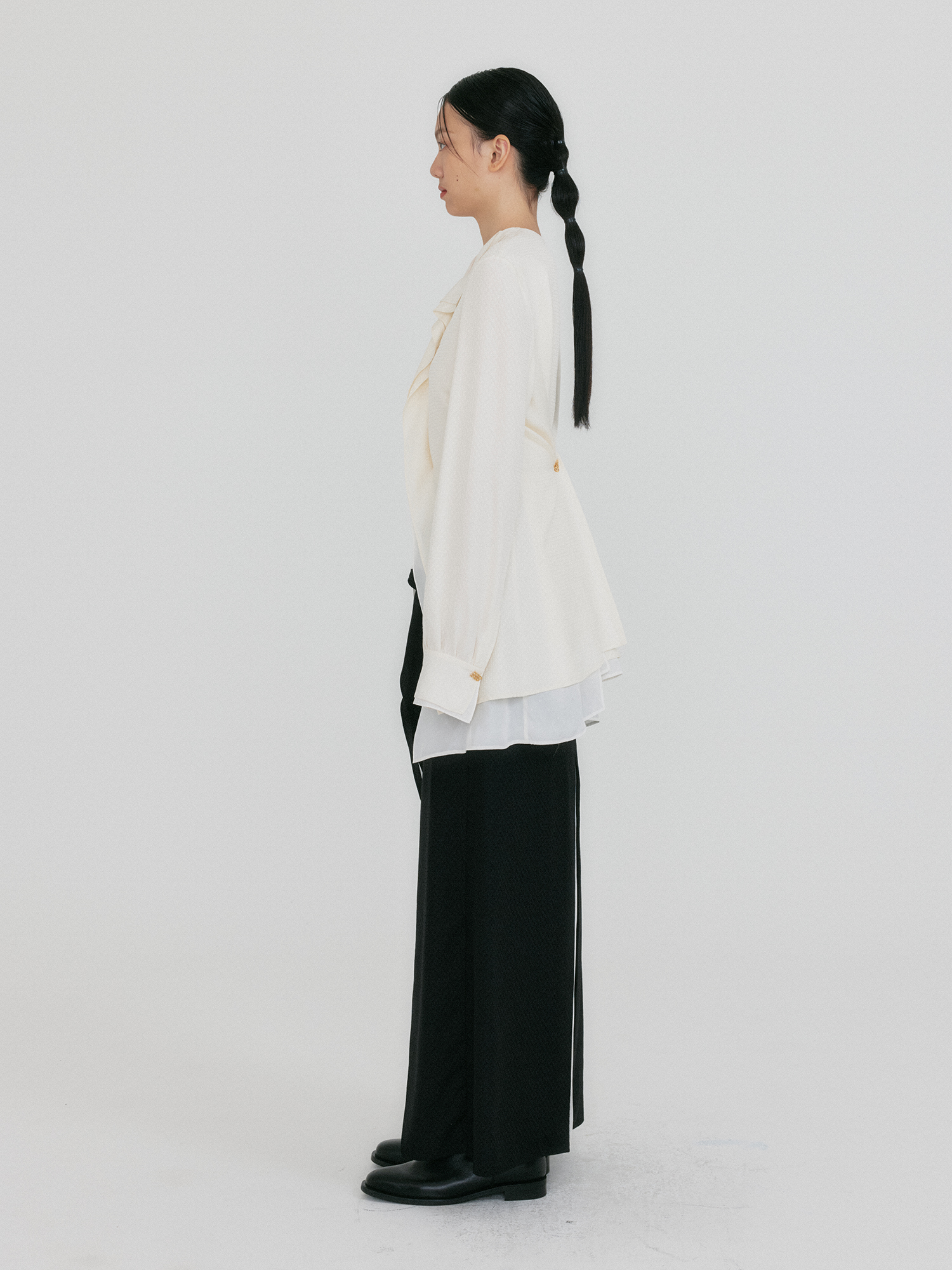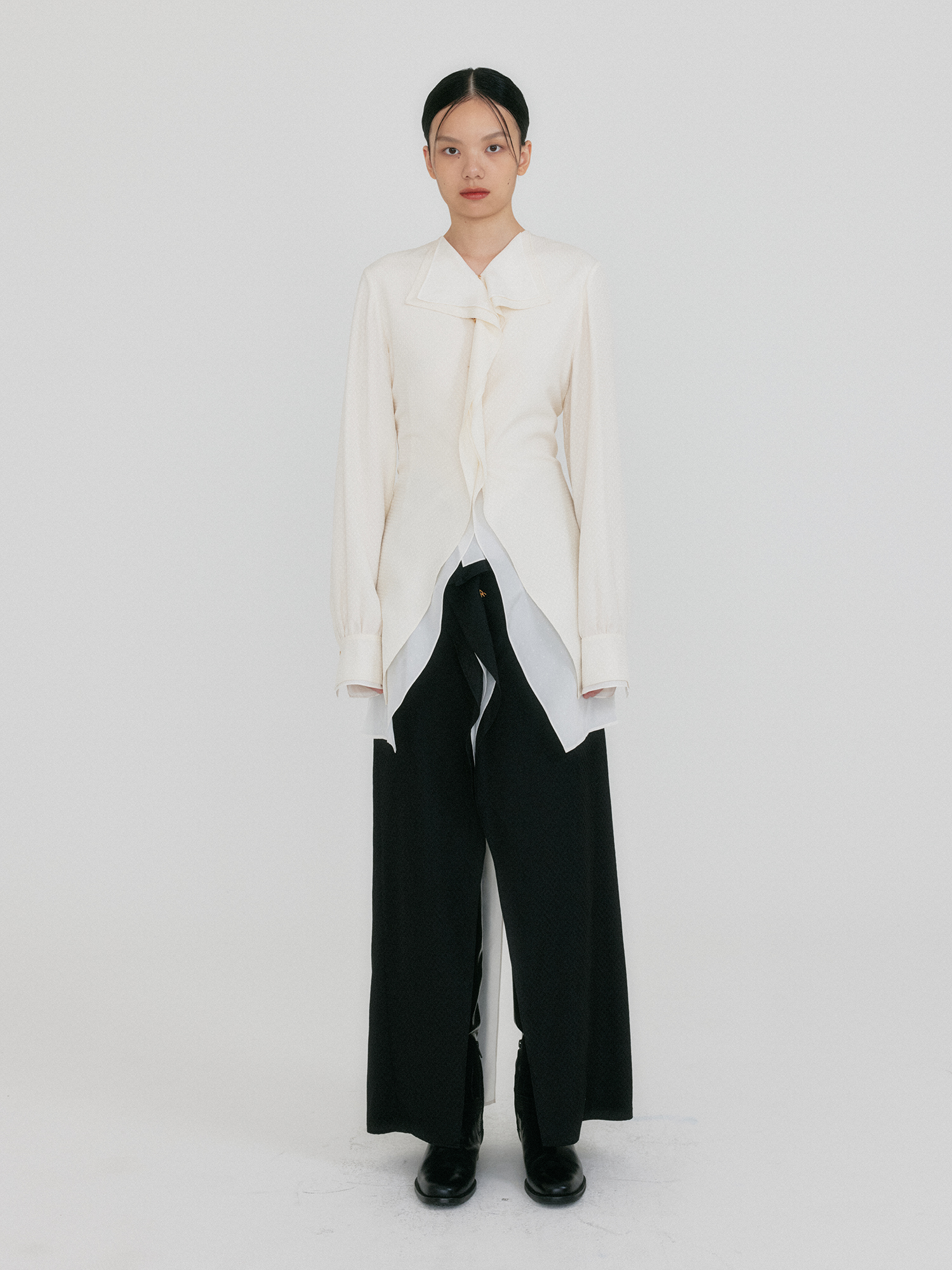 - 드레이프 카라 디테일이 강조된 실크 셔츠